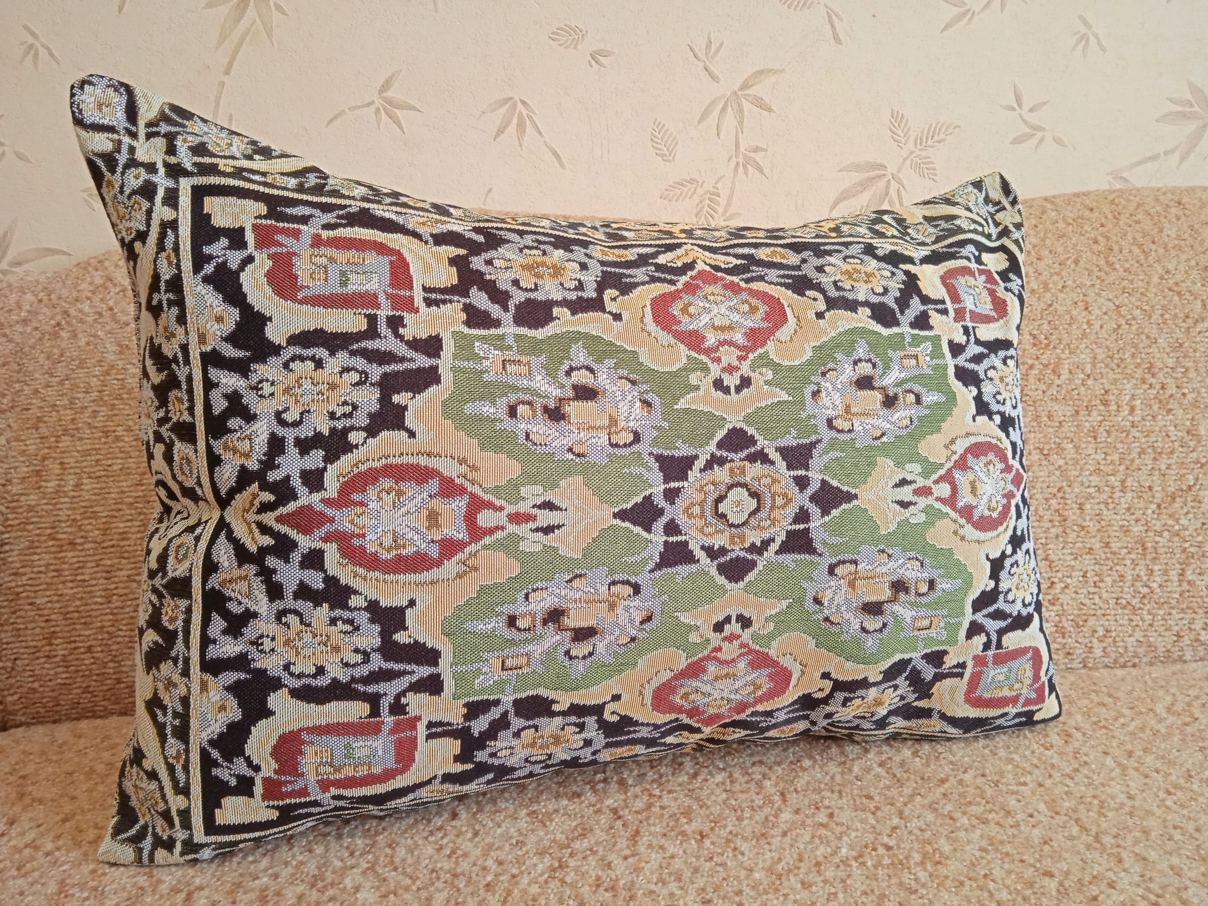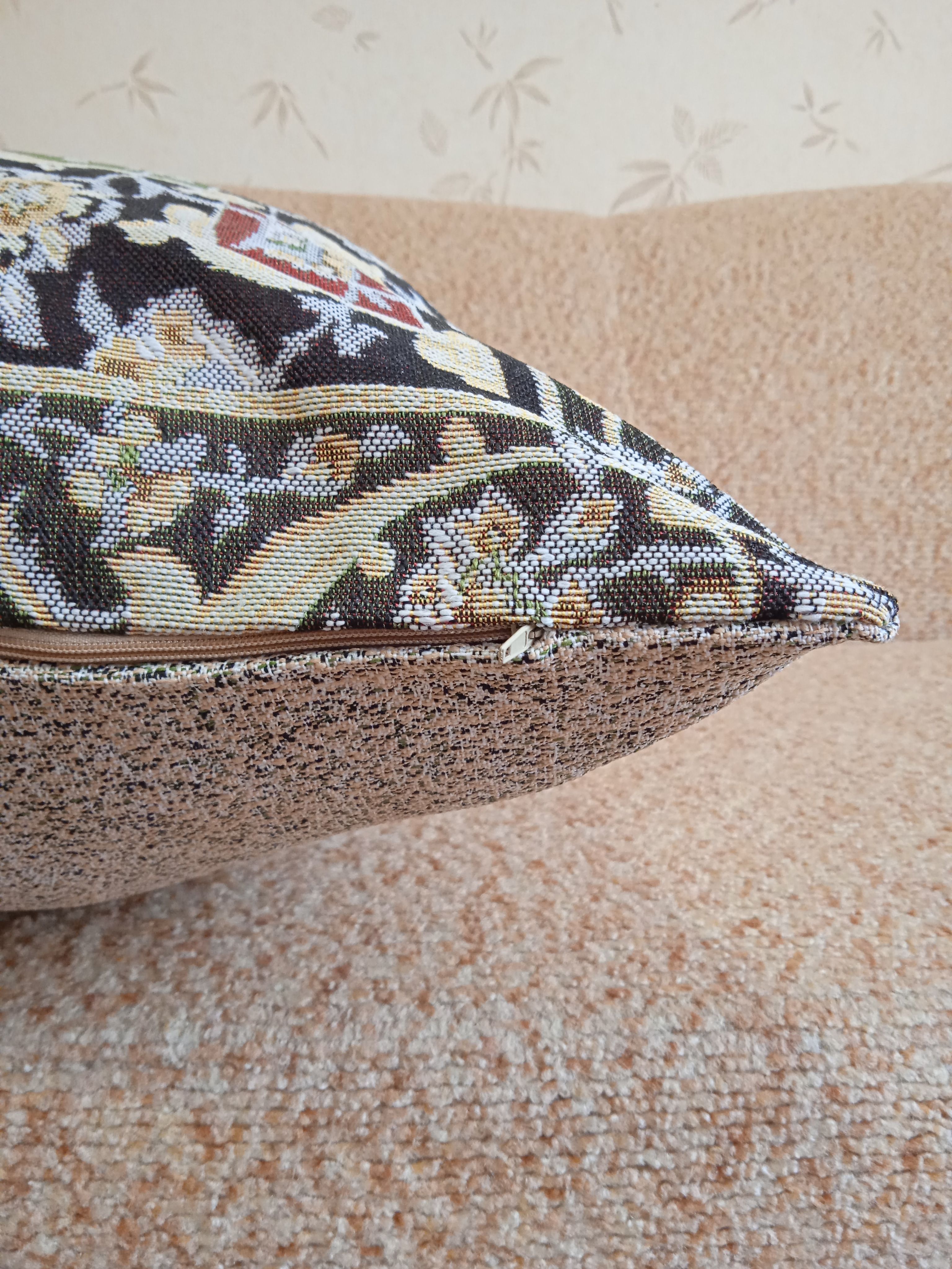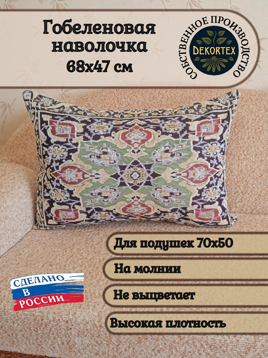 Гобеленовый чехол для декоративной подушки. Размер чехла: 68x47 см. производство Россия. Изделие собственного производства сшито из отечественной жаккардовой ткани. Задняя часть выполнена из мебельной рогожки так же Российского производства. Все ткани используемые для производства декоративного чехла производятся с соблюдением ТУ и ГОСТ Р.Ф. Собственное швейное производство позволяет контролировать качество продукции на всех этапах до поступления на склад и предлагать покупателям товары высокого качества по выгодным ценам. Состав ткани 100% полиэстер. Плотность гобелена 380 г/кв.м. Продается без подушки-наполнителя. Подушку-наполнитель так же можно купить у нас. Размер чехла может отличаться от заявленного +/- 2 см. Подходит для подушки 70х50. Допускается деликатная машинная стирка при температуре 30 градусов. Гладить при средней температуре.