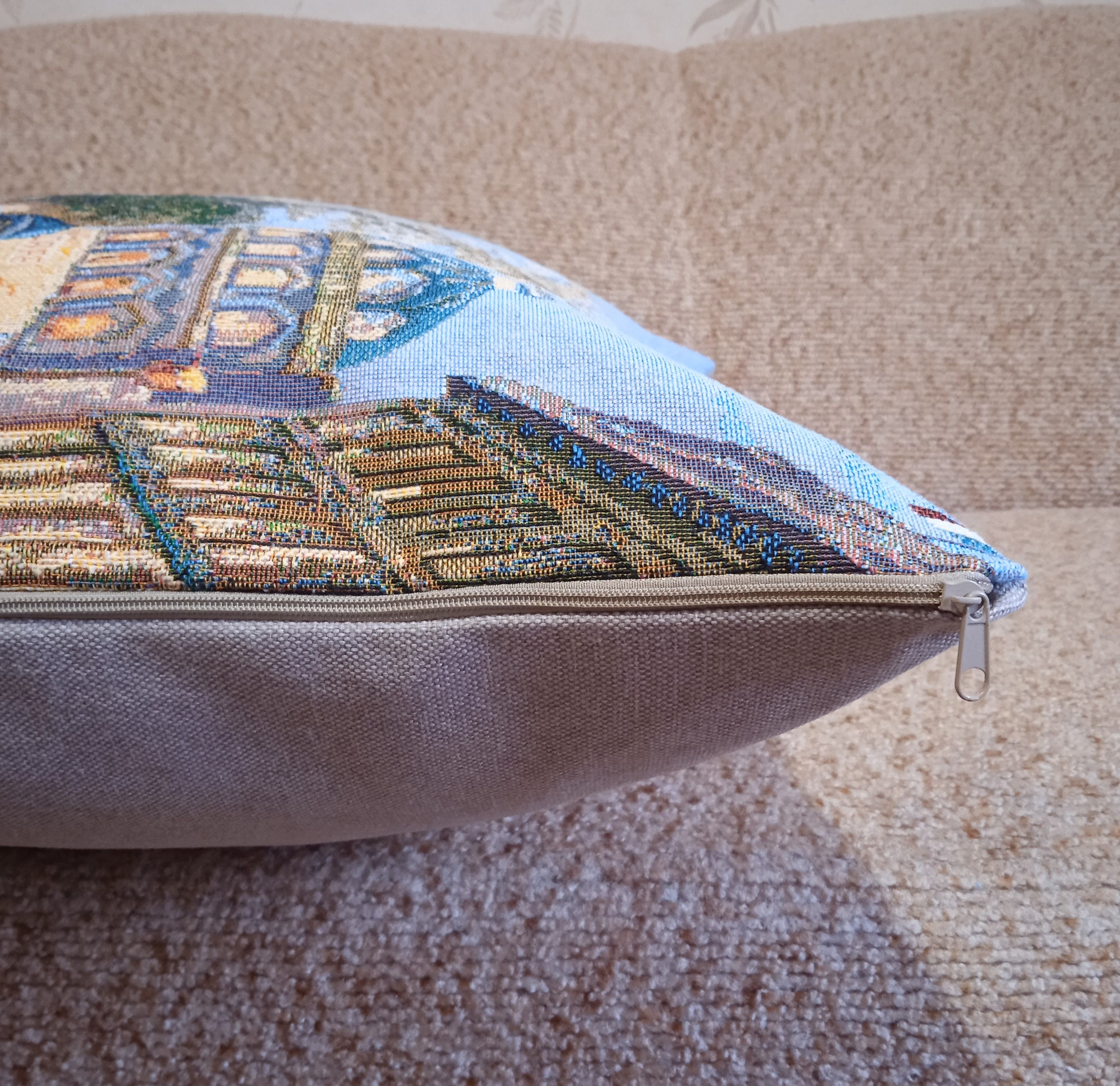 Гобеленовый чехол для декоративной подушки. Размер чехла: 68x47 см. производство Россия. Изделие собственного производства сшито из отечественной жаккардовой ткани. Задняя часть выполнена из мебельной рогожки так же Российского производства. Все ткани используемые для производства декоративного чехла производятся с соблюдением ТУ и ГОСТ Р.Ф. Собственное швейное производство позволяет контролировать качество продукции на всех этапах до поступления на склад и предлагать покупателям товары высокого качества по выгодным ценам. Состав ткани 100% полиэстер. Плотность гобелена 380 г/кв.м. Продается без подушки-наполнителя. Подушку-наполнитель так же можно купить у нас. Размер чехла может отличаться от заявленного +/- 2 см. Подходит для подушки 70х50. Допускается деликатная машинная стирка при температуре 30 градусов. Гладить при средней температуре.