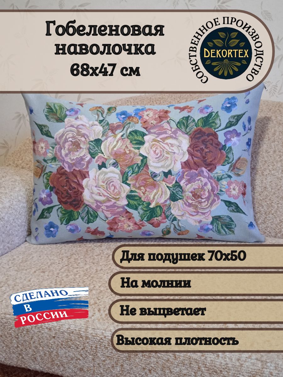 Гобеленовый чехол для декоративной подушки. Размер чехла: 68x47 см. производство Россия. Изделие собственного производства сшито из отечественной жаккардовой ткани. Задняя часть выполнена из мебельной рогожки так же Российского производства. Все ткани используемые для производства декоративного чехла производятся с соблюдением ТУ и ГОСТ Р.Ф. Собственное швейное производство позволяет контролировать качество продукции на всех этапах до поступления на склад и предлагать покупателям товары высокого качества по выгодным ценам. Состав ткани 100% полиэстер. Плотность гобелена 380 г/кв.м. Продается без подушки-наполнителя. Подушку-наполнитель так же можно купить у нас. Размер чехла может отличаться от заявленного +/- 2 см. Подходит для подушки 70х50. Допускается деликатная машинная стирка при температуре 30 градусов. Гладить при средней температуре.
