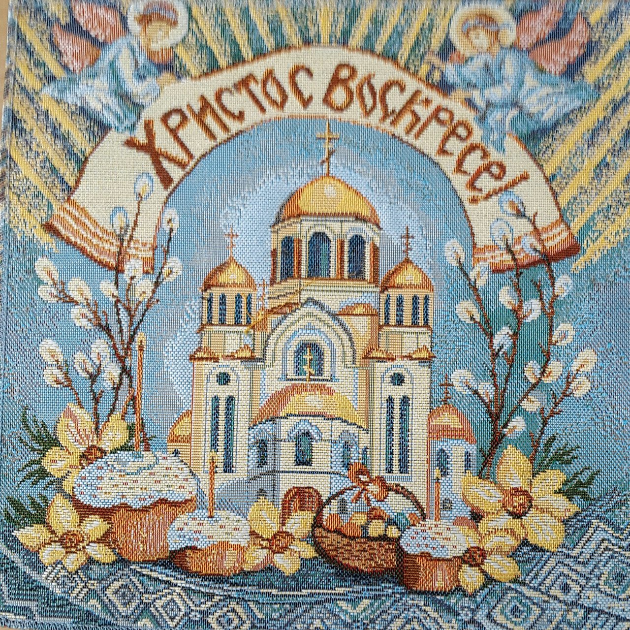 Салфетка декоративная из гобеленовой ткани с рисунком Пасхальной тематики. Нежные, светлые тона рисунка совпадают с общим настроем большого праздника. Салфетка с пасхальным рисунком прекрасное украшение праздничного стола. Подчеркивает и дополняет значимость и настроение Светлого Воскресения. Может стать приятным подарком для Ваших родных и близких. Такие не дорогие но очень приятные предметы интерьера позволяют нам добавить в привычный быт атмосферу праздника.