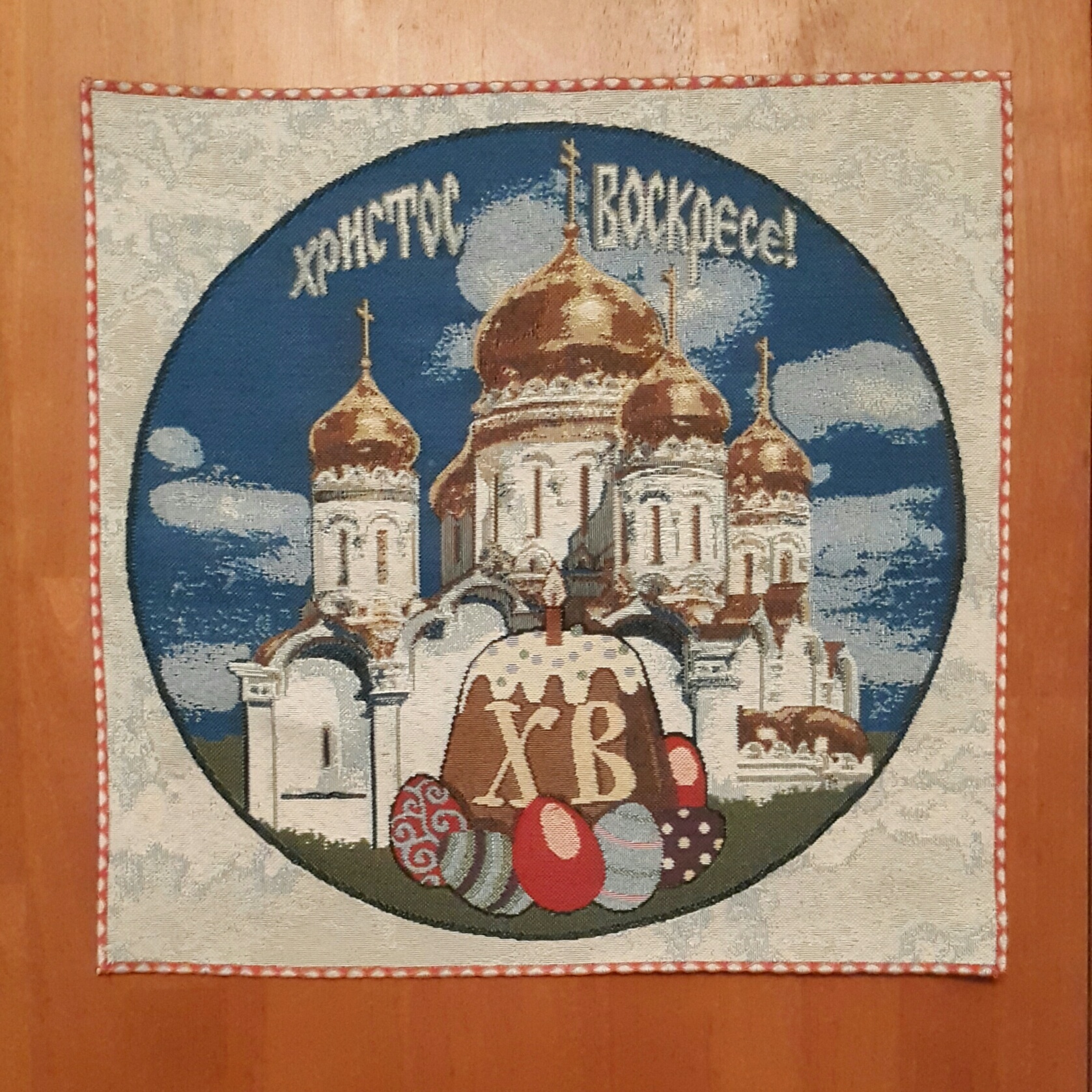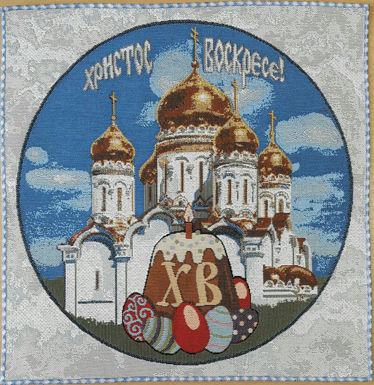 Салфетка декоративная из гобеленовой ткани с рисунком Пасхальной тематики. Нежные, светлые тона рисунка совпадают с общим настроем большого праздника. Салфетка с пасхальным рисунком прекрасное украшение праздничного стола. Подчеркивает и дополняет значимость и настроение Светлого Воскресения. Может стать приятным подарком для Ваших родных и близких. Такие не дорогие но очень приятные предметы интерьера позволяют нам добавить в привычный быт атмосферу праздника.