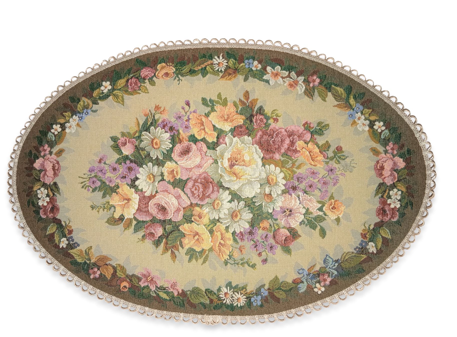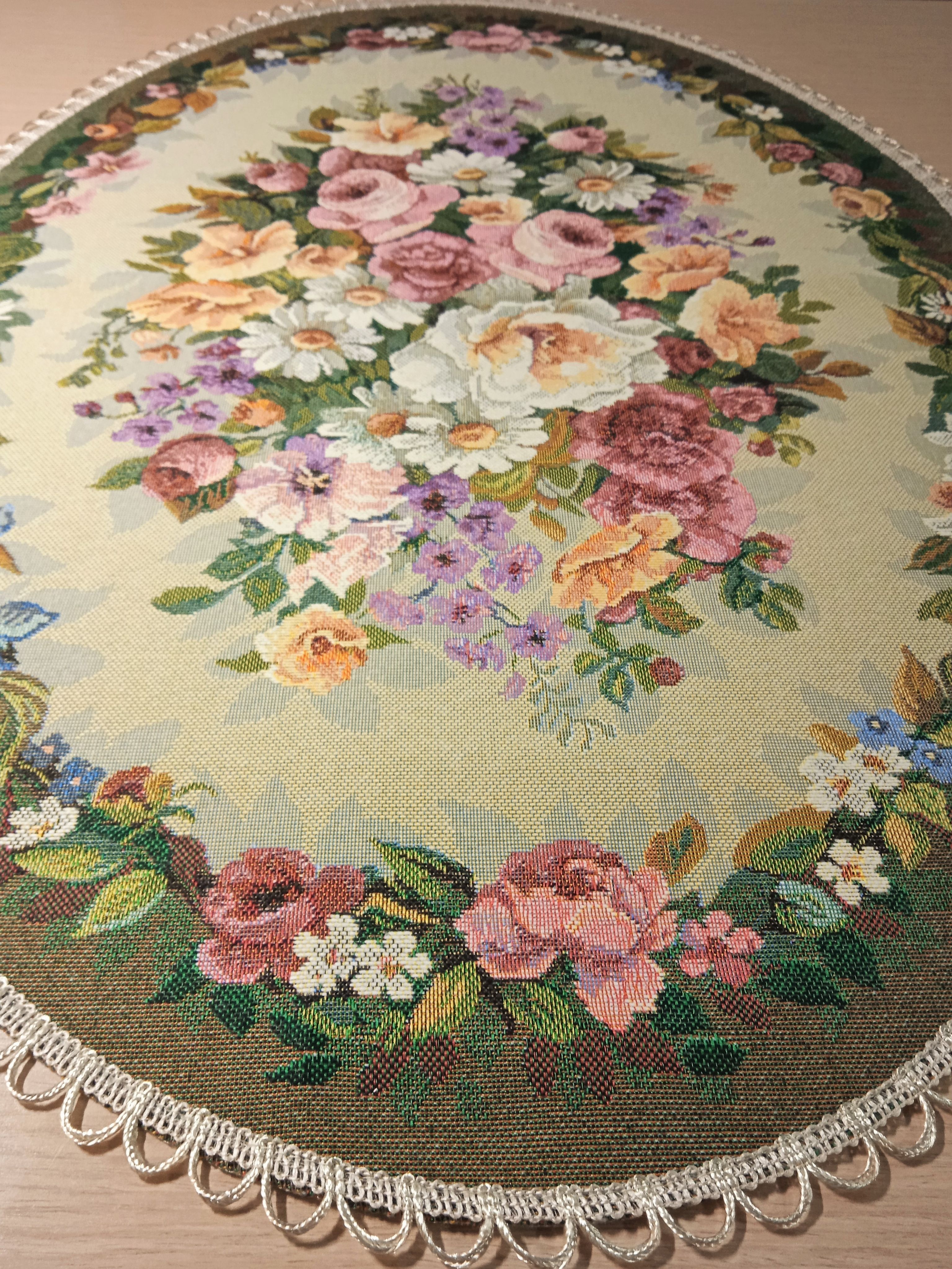 Декоративные гобеленовые салфетки это приятное и полезное украшение для сервировки стола. Салфетки могут продаваться по одной или наборами от двух до десяти штук. Форма, размер, цвет и рисунок салфеток можно выбрать по желанию покупателя. Декоративные салфетки круглой и овальной формы как правило обработаны красивой декоративной тесьмой подходящей по цвету к рисунку на ткани. Гобеленовые декоративные салфетки не только модный, красивый предмет интерьера но и полезны и практичны в использовании. Салфетки помогут предохранить поверхность мебели от повреждения. Гобеленовые салфетки устойчивы к загрязнению, хорошо стираются при температуре 30 градусов на дают усадки не линяют. Изделия из гобеленовой ткани имеют длительный срок службы и сохраняют первоначальный вид и форму.