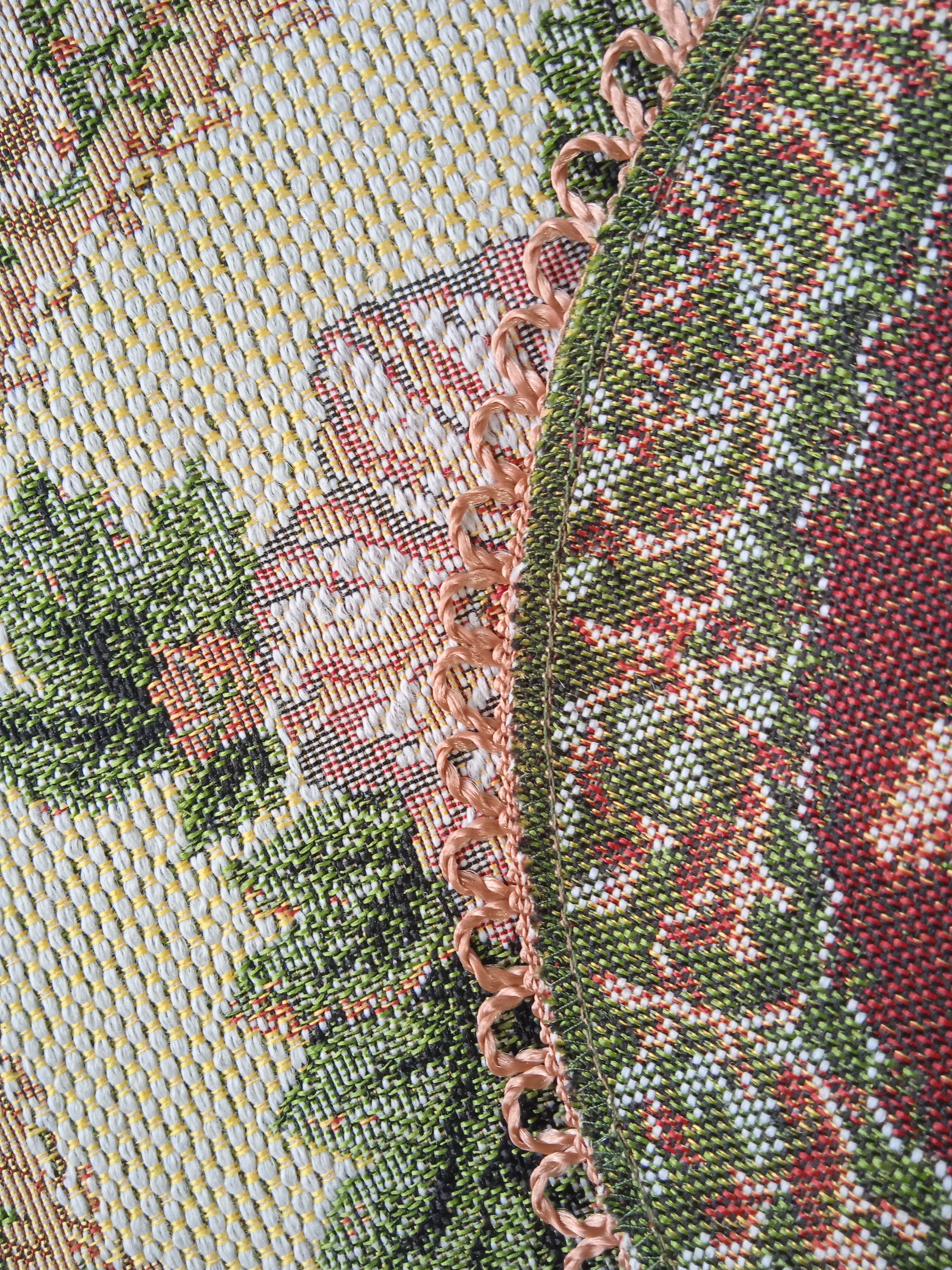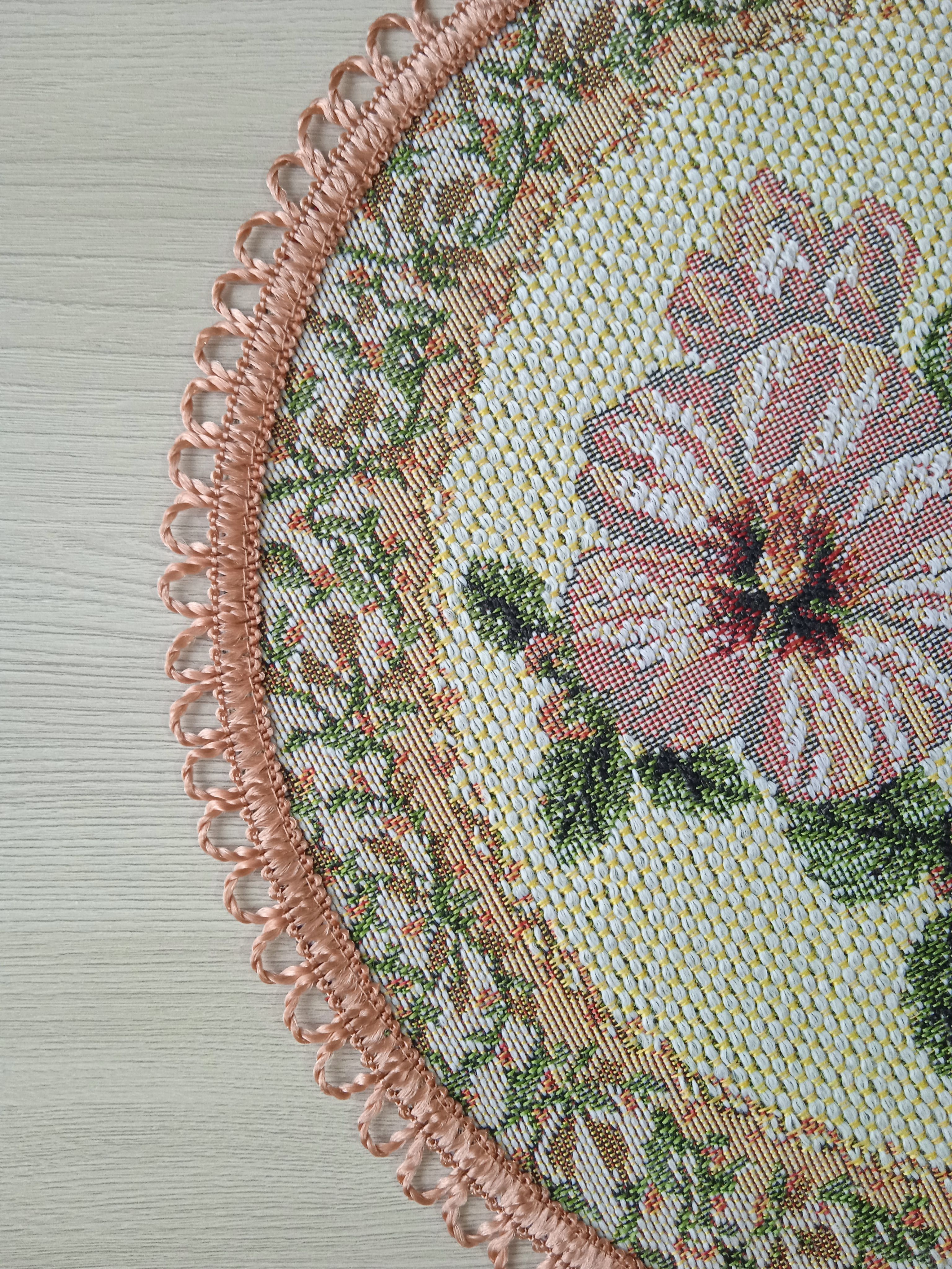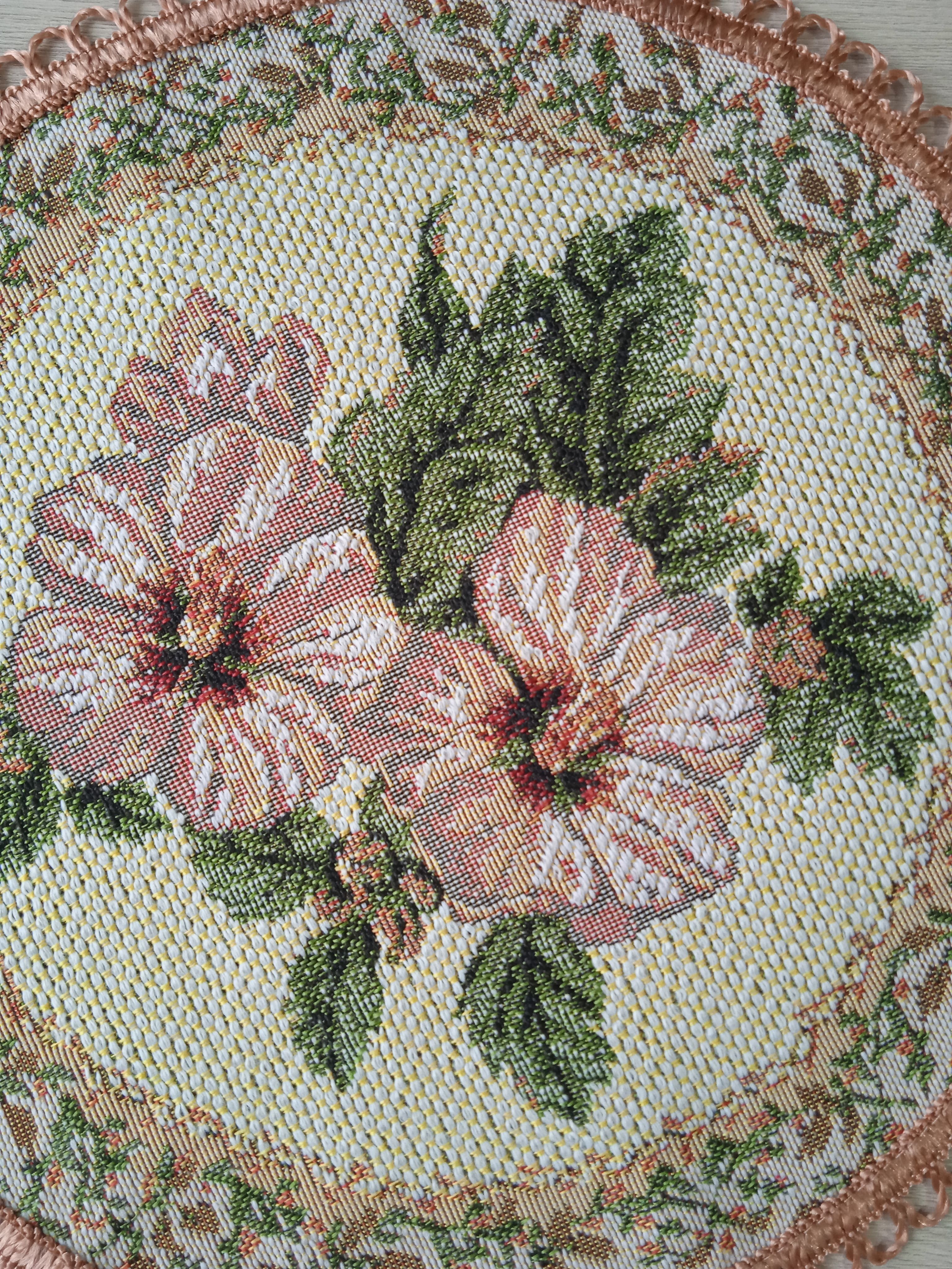 Салфетка декоративная из гобеленовой ткани с цветочным рисунком . Нежные, светлые тона рисунка совпадают с весенним настроением цветущего сада. Круглая салфетка с декоративной тесьмой прекрасное украшение для сервировки стола. Салфетка может стать приятным подарком для Ваших родных и близких. Такие не дорогие но очень приятные предметы интерьера позволяют нам добавить в привычный быт атмосферу красоты и праздника.
