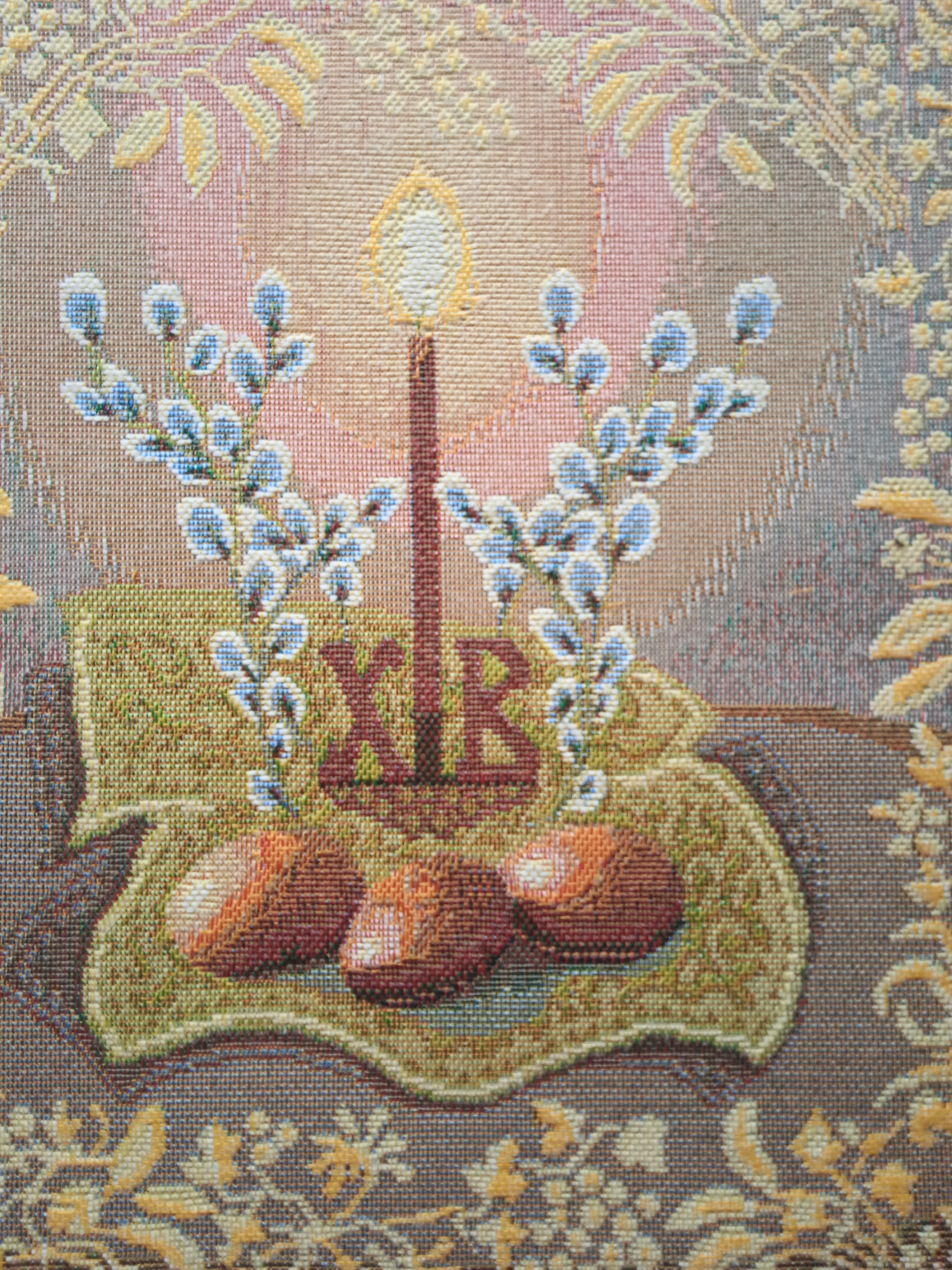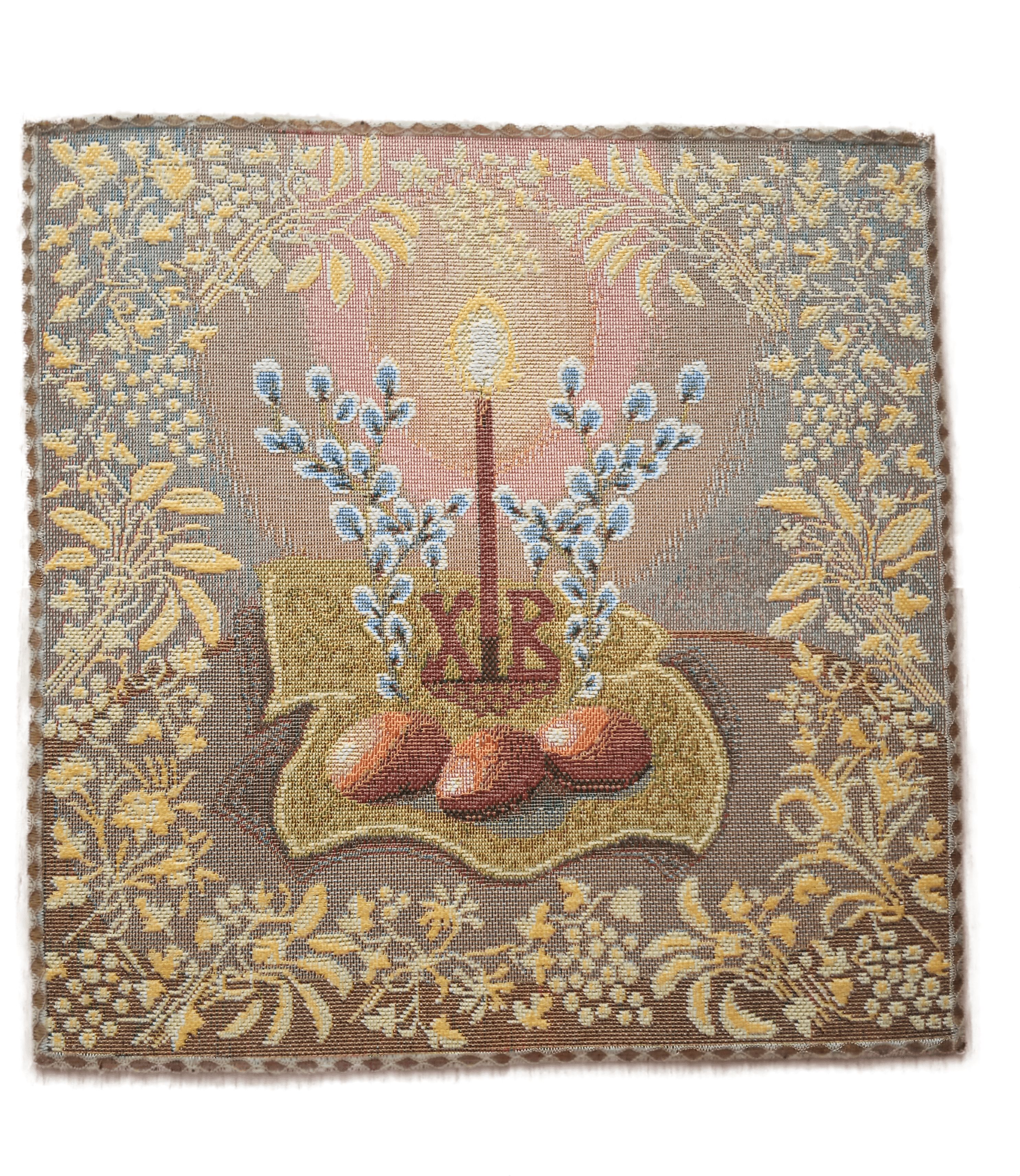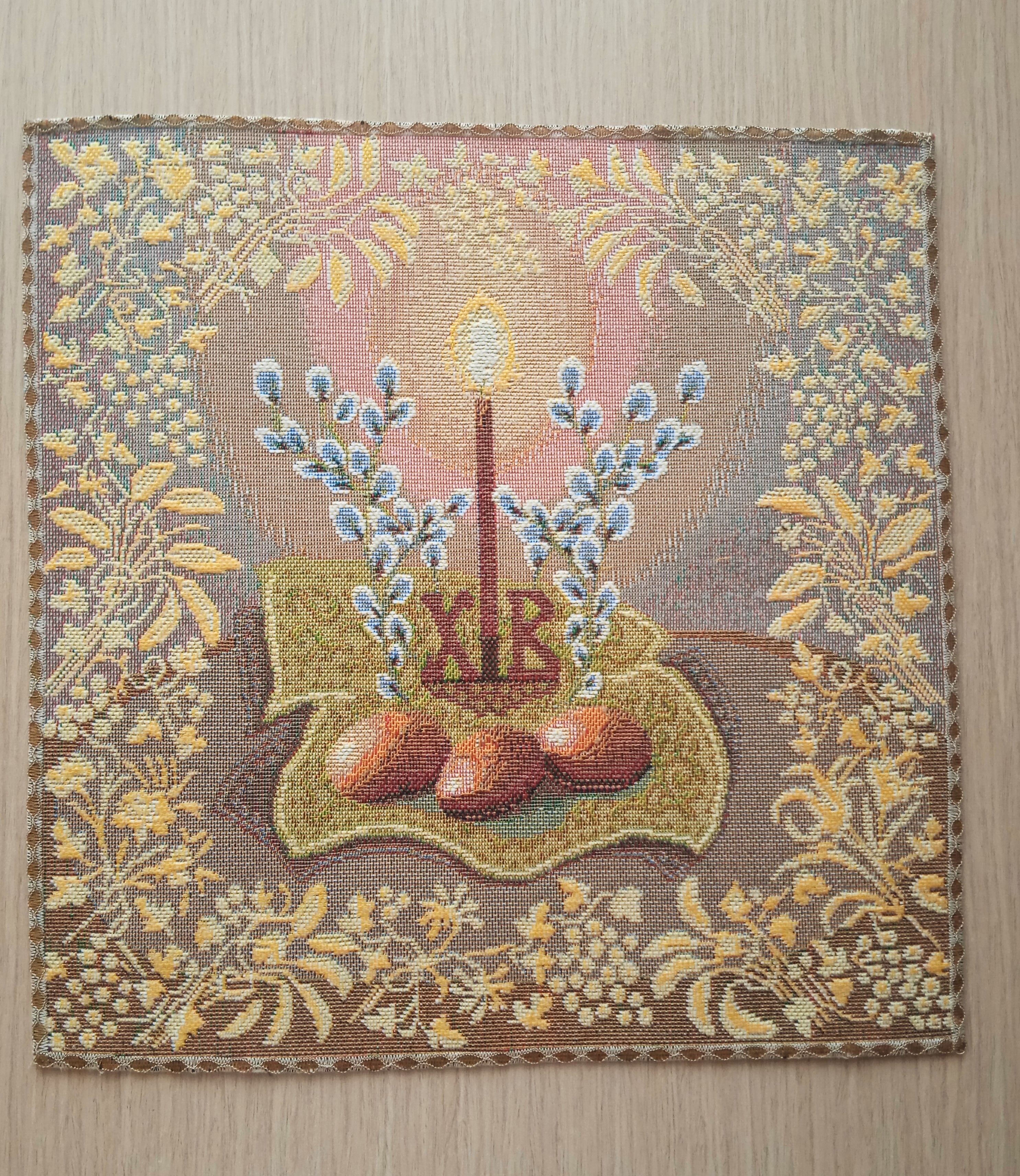 Салфетка декоративная из гобеленовой ткани с рисунком Пасхальной тематики. Нежные, светлые тона рисунка совпадают с общим настроем большого праздника. Салфетка с пасхальным рисунком прекрасное украшение праздничного стола. Подчеркивает и дополняет значимость и настроение Светлого Воскресения. Может стать приятным подарком для Ваших родных и близких. Такие не дорогие но очень приятные предметы интерьера позволяют нам добавить в привычный быт атмосферу праздника.