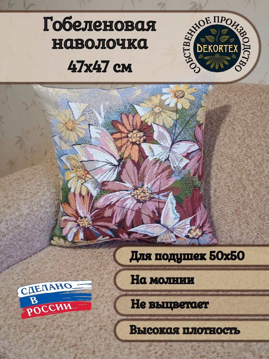 Гобеленовая наволочка для декоративной подушки. Размер наволочки: 47x47см. производство Россия. Изделие собственного производства сшито из отечественной жаккардовой ткани. Задняя часть выполнена из мебельной рогожки так же Российского производства. Все ткани используемые для производства декоративной наволочки производятся с соблюдением ТУ и ГОСТ РФ. Собственное швейное производство позволяет контролировать качество продукции на всех этапах до поступления на склад и предлагать покупателям товары высокого качества по выгодным ценам. Состав ткани 100% полиэстер. Плотность гобелена 380 г/кв.м. Наволочка подходит для подушек размером 50х50 см. Продается без подушки-наполнителя. Подушку-наполнитель так же можно купит у нас. Размер наволочки может отличаться от заявленного +/- 2 см. Допускается деликатная машинная стирка при температуре 30 градусов. Гладить при средней температуре.
