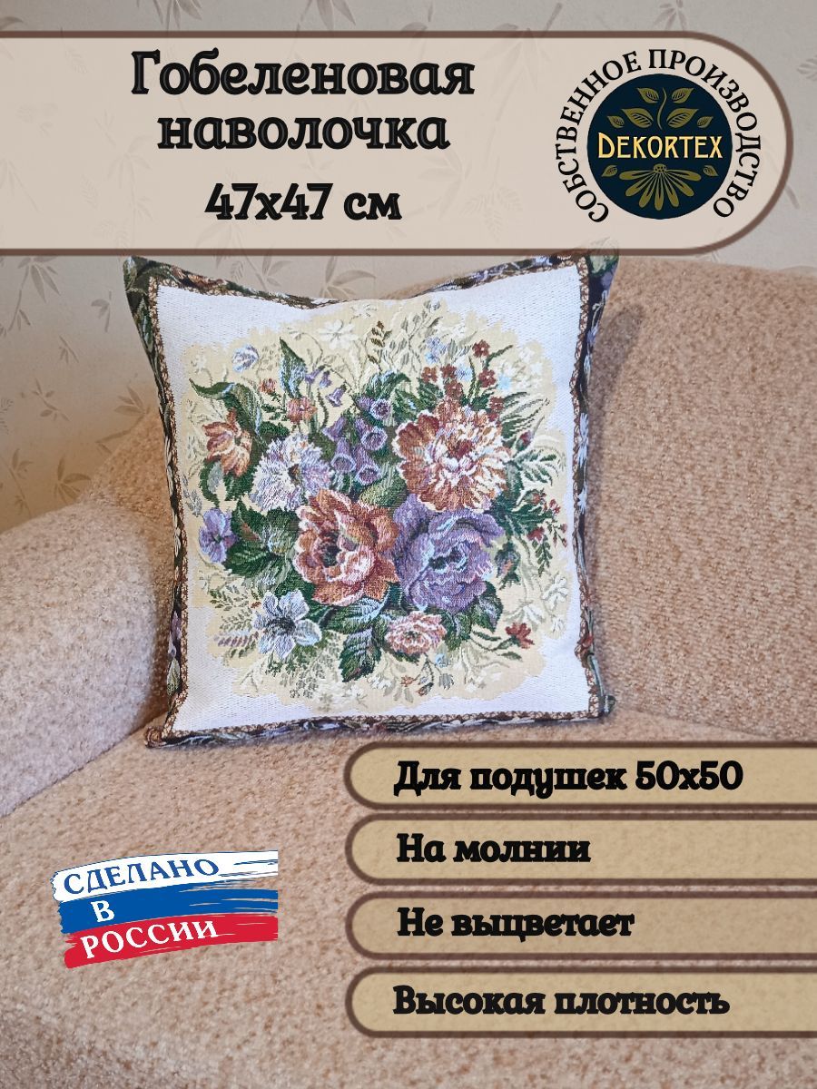 Гобеленовая наволочка для декоративной подушки. Размер наволочки: 47x47см. производство Россия. Изделие собственного производства сшито из отечественной жаккардовой ткани. Задняя часть выполнена из мебельной рогожки так же Российского производства. Все ткани используемые для производства декоративной наволочки производятся с соблюдением ТУ и ГОСТ РФ. Собственное швейное производство позволяет контролировать качество продукции на всех этапах до поступления на склад и предлагать покупателям товары высокого качества по выгодным ценам. Состав ткани 100% полиэстер. Плотность гобелена 380 г/кв.м. Наволочка подходит для подушек размером 50х50 см. Продается без подушки-наполнителя. Подушку-наполнитель так же можно купит у нас. Размер наволочки может отличаться от заявленного +/- 2 см. Допускается деликатная машинная стирка при температуре 30 градусов. Гладить при средней температуре.