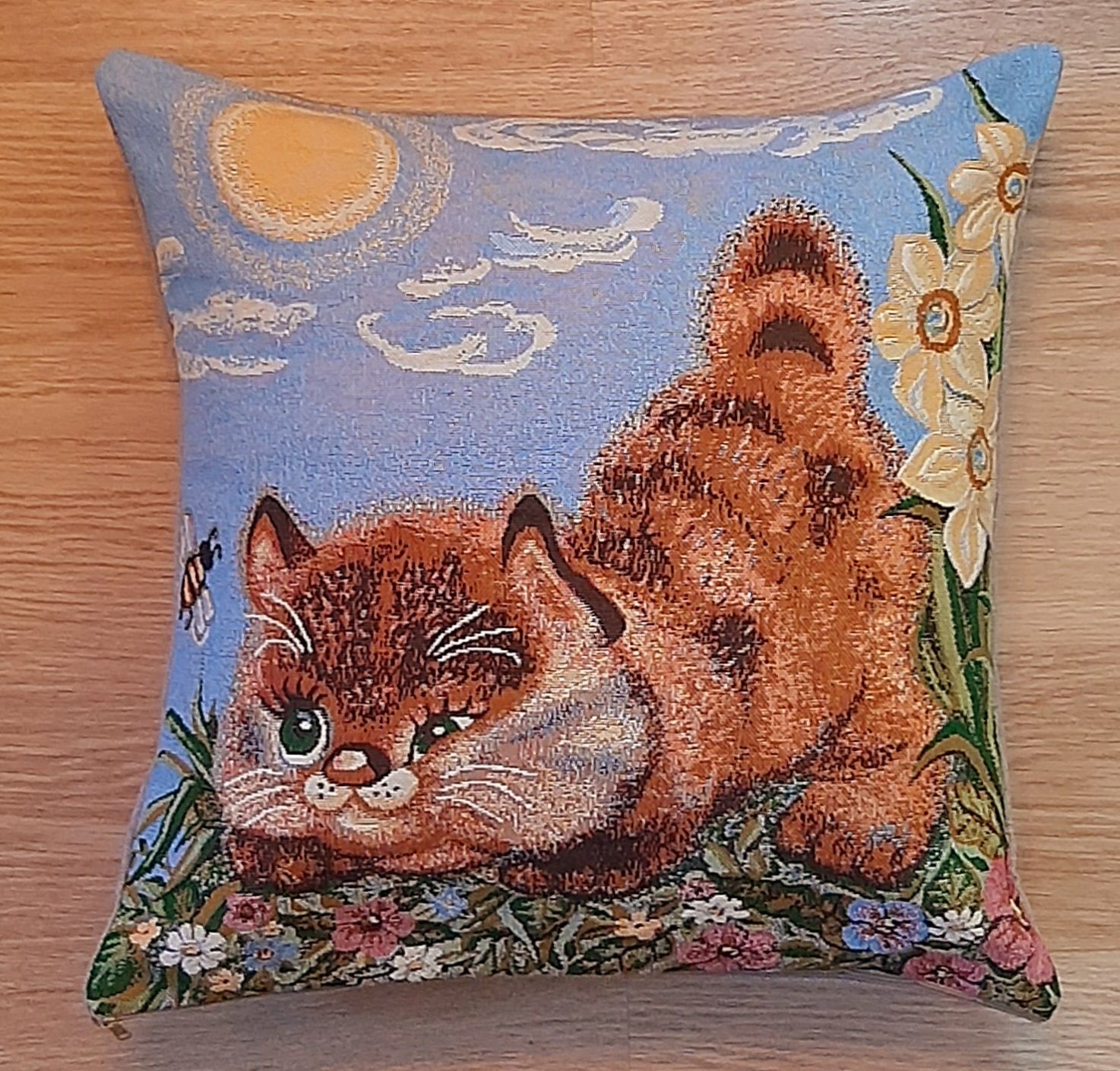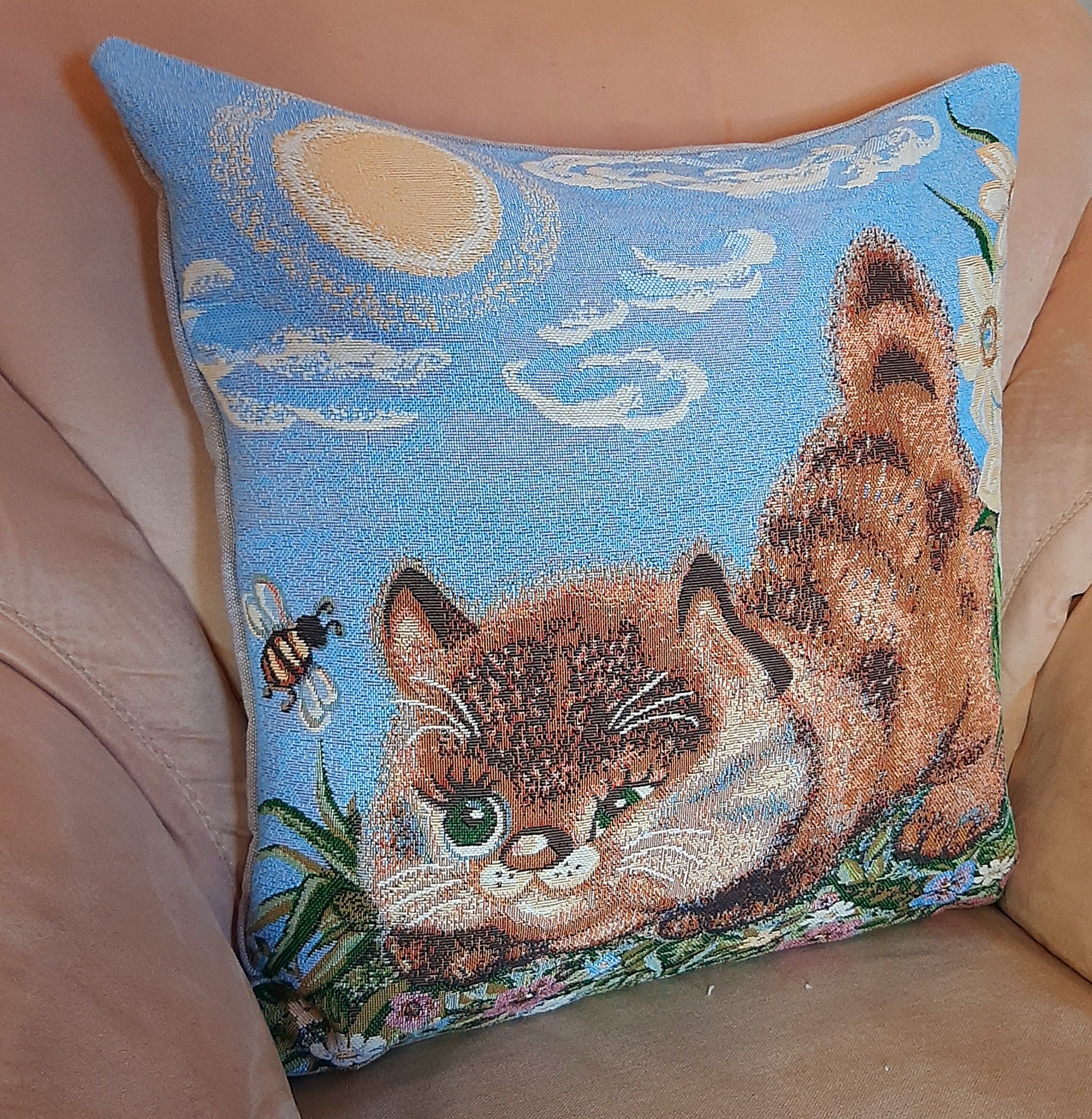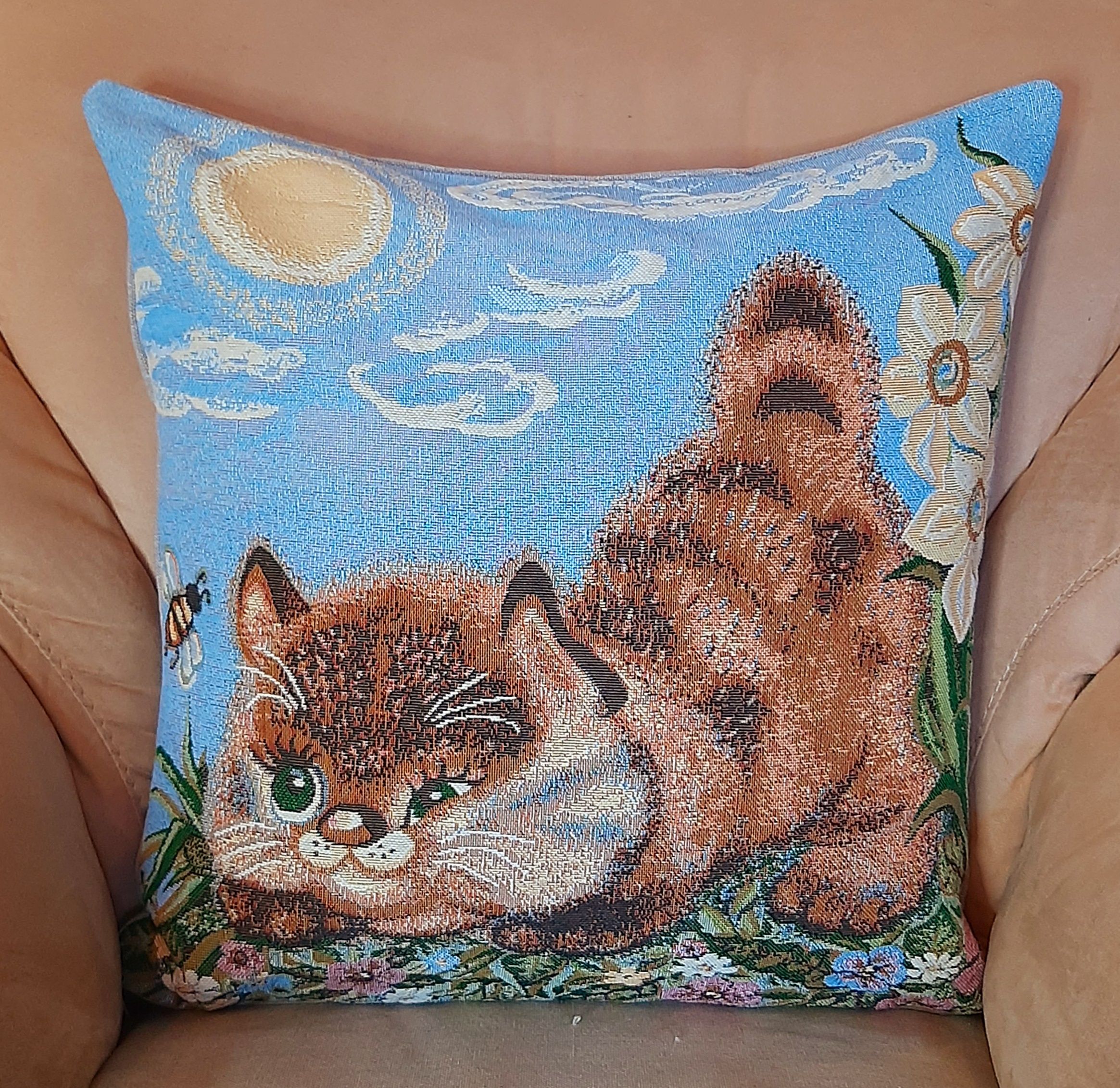 Гобеленовая декоративная наволочка с изображением котенка играющего с пчелой подойдет для оформления домашнего интерьера в Новогодние праздники. Можно использовать для украшения гостиной, спальни, детской комнаты, кафе, отеля, гостиницы. Можно использовать как дополнительные подушки на диван, кресло, кровать, дачная лавка на веранде. Отличный подарок или сувенир для родных и близких, друзей, коллег по работе, маме, бабушке, теще, тете, сестре, сослуживцам на новый год, новоселье, день рождения, корпоративный подарок, 8 марта.