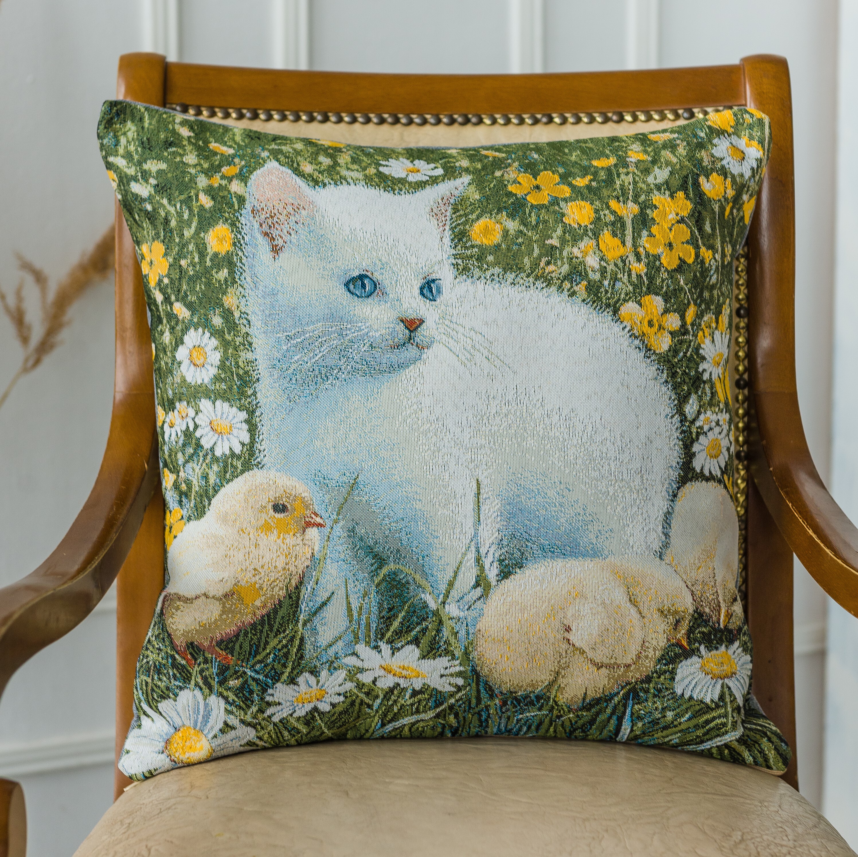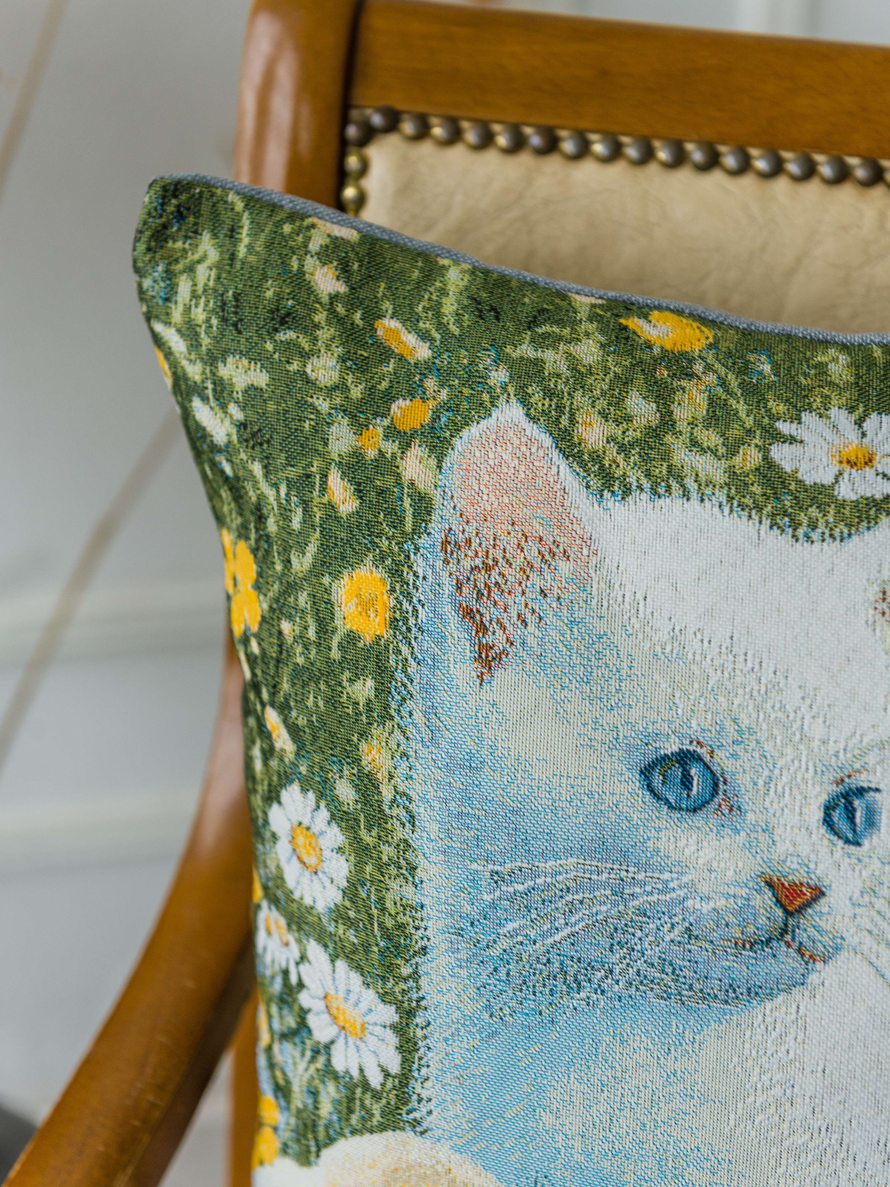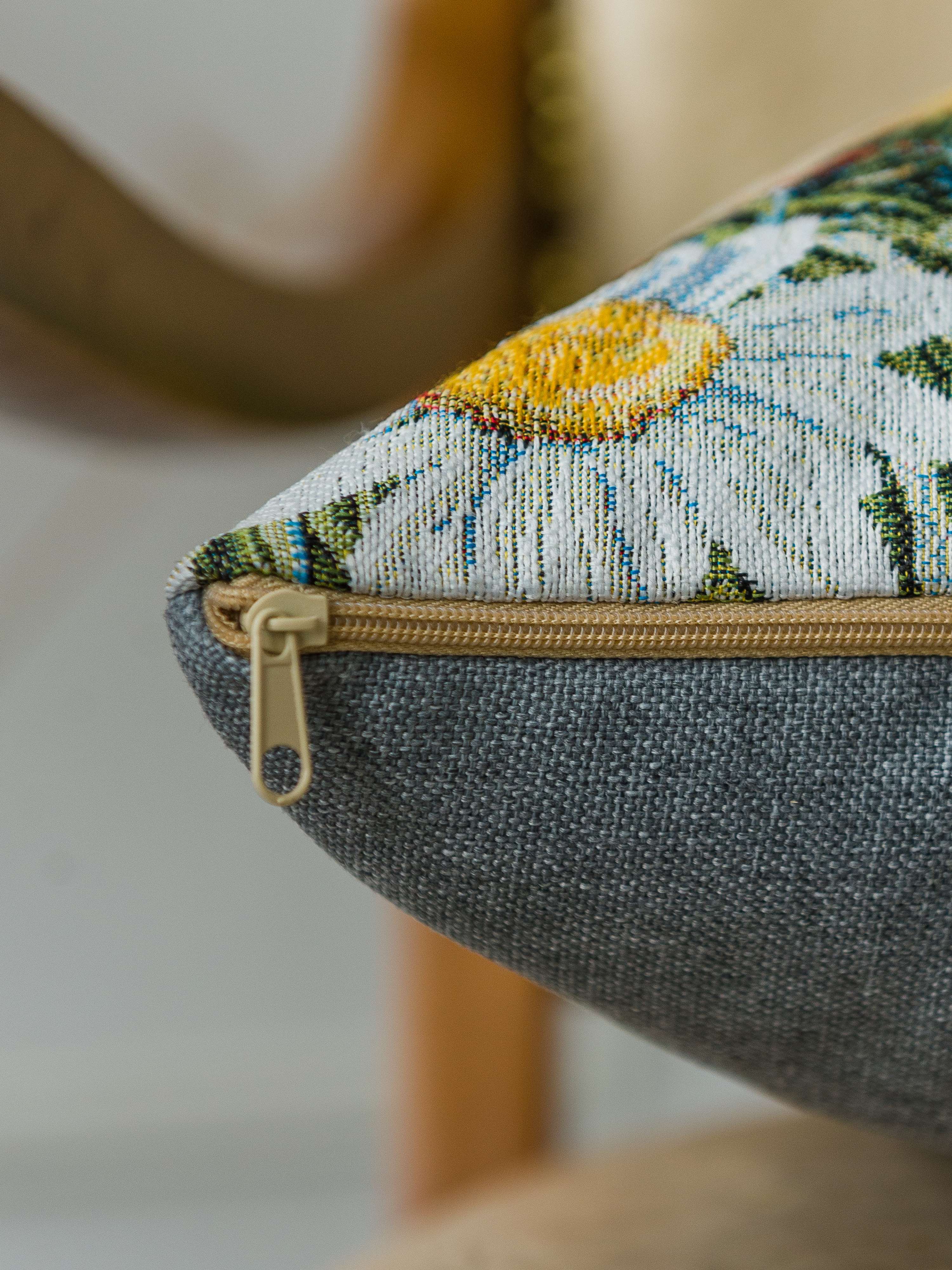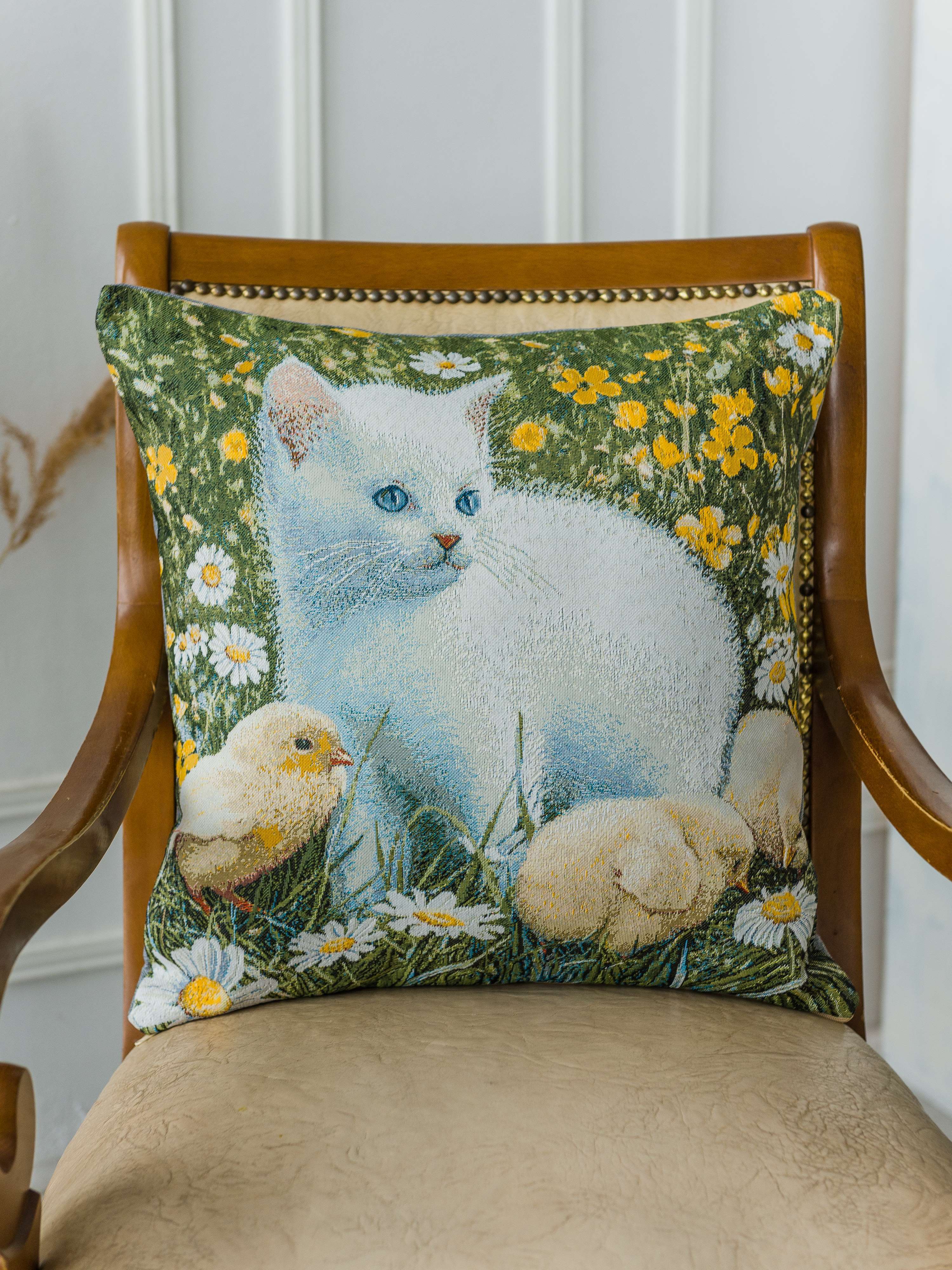 Гобеленовый чехол для декоративной подушки. Размер чехла: 47x47см. производство Россия. Изделие собственного производства сшито из отечественной жаккардовой ткани. Задняя часть выполнена из мебельной рогожки так же Российского производства. Все ткани используемые для производства декоративного чехла производятся с соблюдением ТУ и ГОСТ Р.Ф. Собственное швейное производство позволяет контролировать качество продукции на всех этапах до поступления на склад и предлагать покупателям товары высокого качества по выгодным ценам. Состав ткани 100% полиэстер. Плотность гобелена 380 г/кв.м. Чехол подходит для подушек размером от 45 до 50 см. Продается без подушки-наполнителя. Подушку-наполнитель так же можно купит у нас. Размер чехла может отличаться от заявленного +/- 2 см. Допускается деликатная машинная стирка при температуре 30 градусов. Гладить при средней температуре.