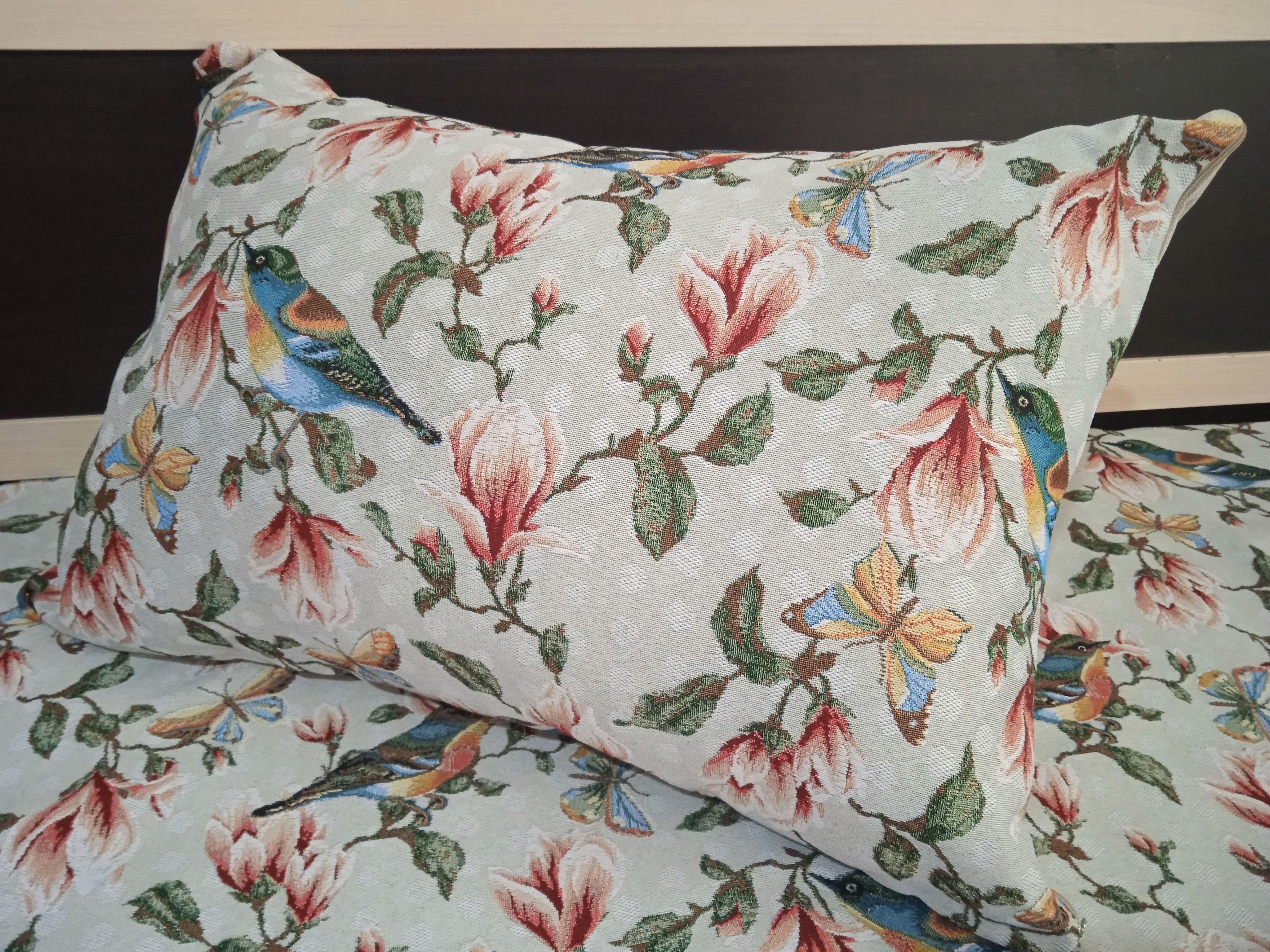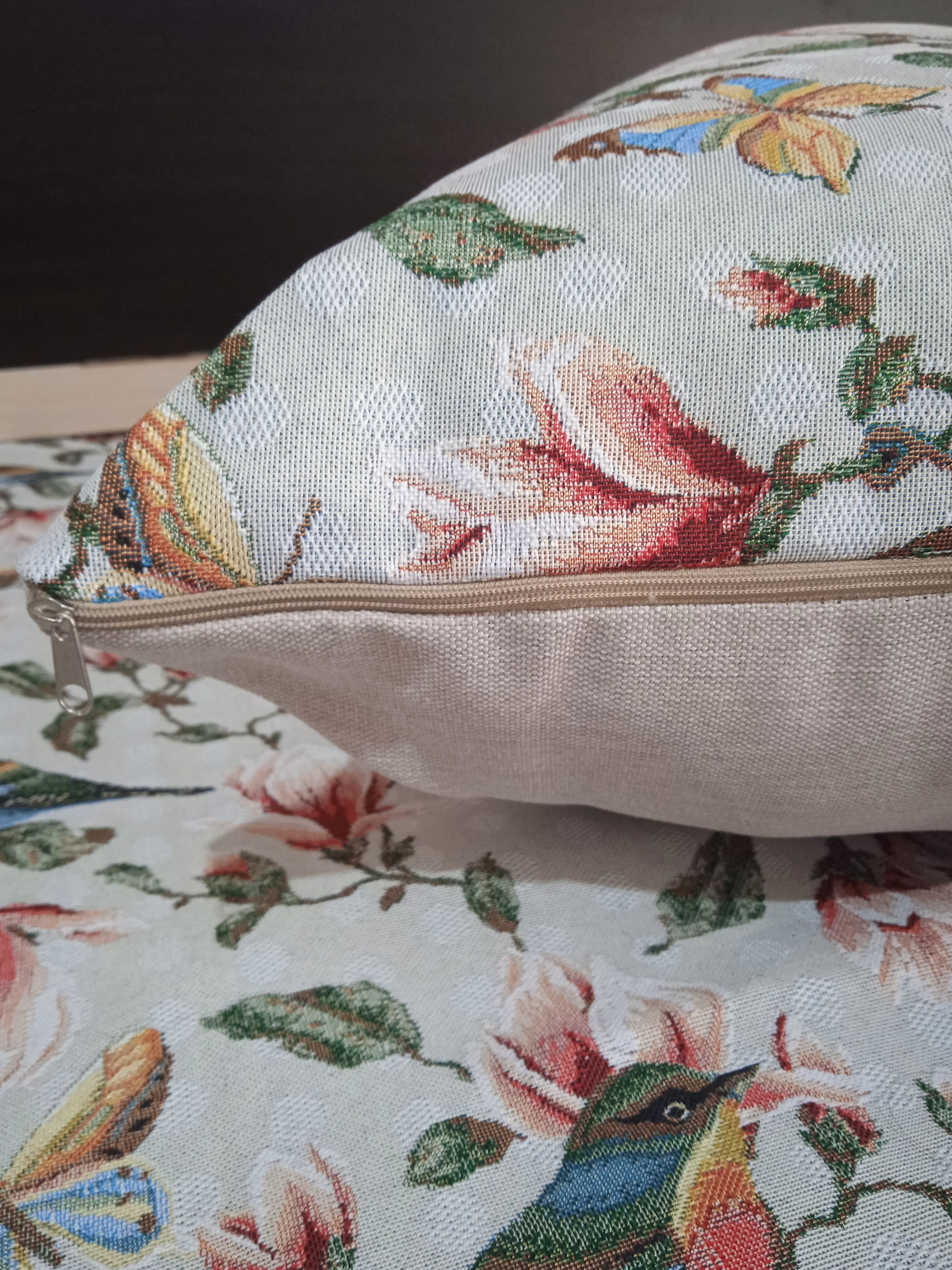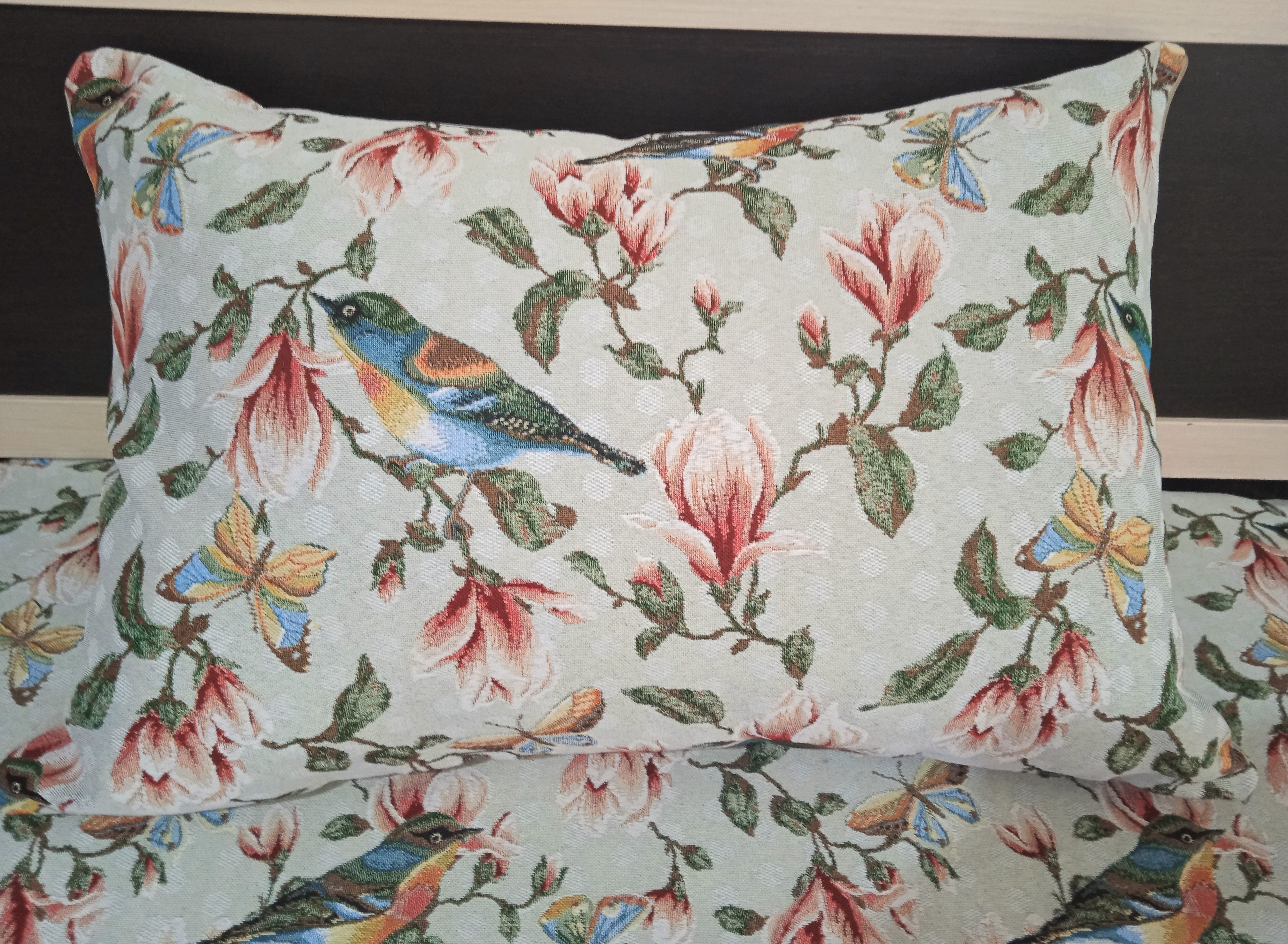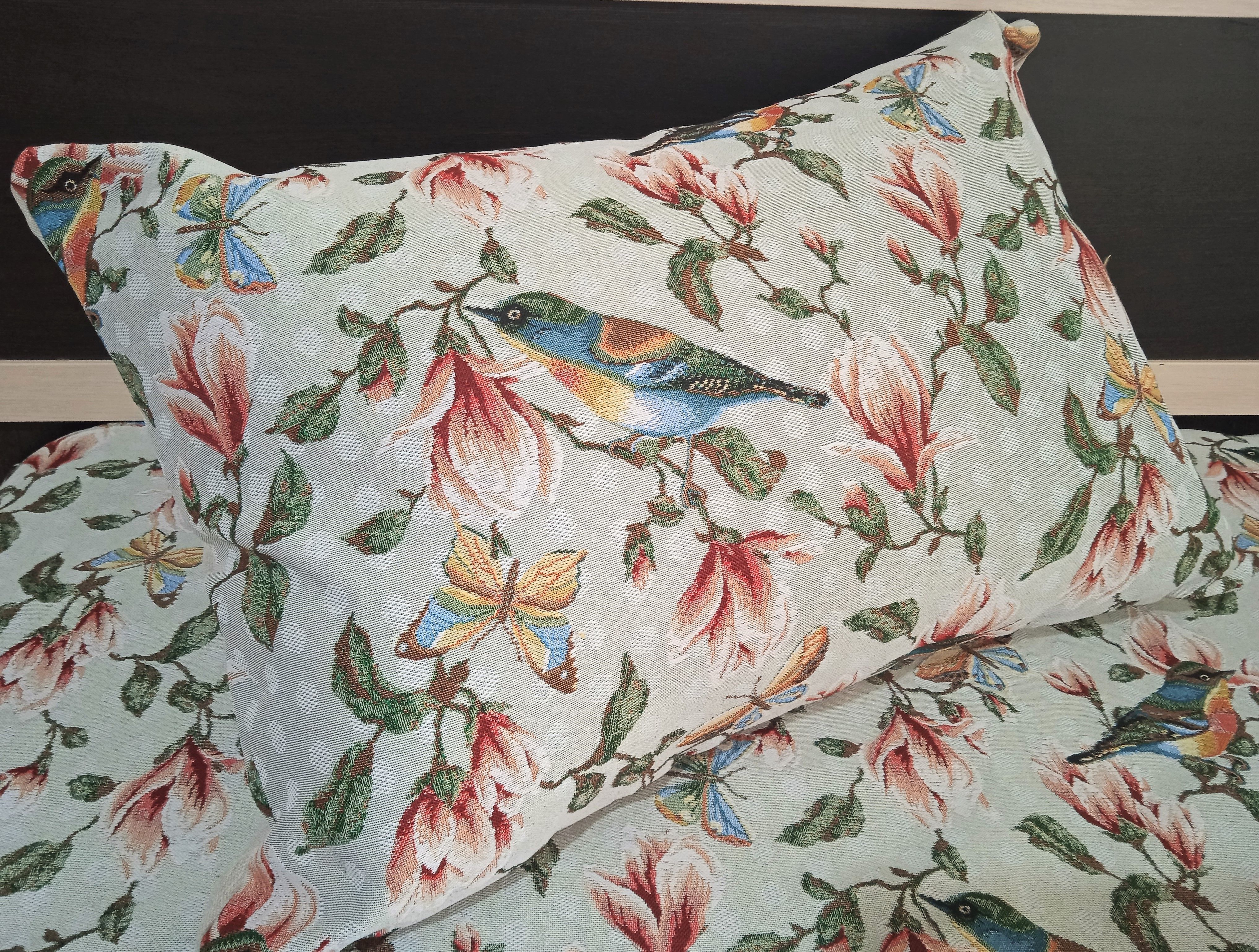 Гобеленовый чехол для декоративной подушки. Размер чехла: 50x70 см. производство Россия. Изделие собственного производства сшито из отечественной жаккардовой ткани. Задняя часть выполнена из мебельной рогожки так же Российского производства. Все ткани используемые для производства декоративного чехла производятся с соблюдением ТУ и ГОСТ Р.Ф. Собственное швейное производство позволяет контролировать качество продукции на всех этапах до поступления на склад и предлагать покупателям товары высокого качества по выгодным ценам. Состав ткани 100% полиэстер. Плотность гобелена 380 г/кв.м. Продается без подушки-наполнителя. Подушку-наполнитель так же можно купить у нас. Размер чехла может отличаться от заявленного +/- 2 см. Допускается деликатная машинная стирка при температуре 30 градусов. Гладить при средней температуре.