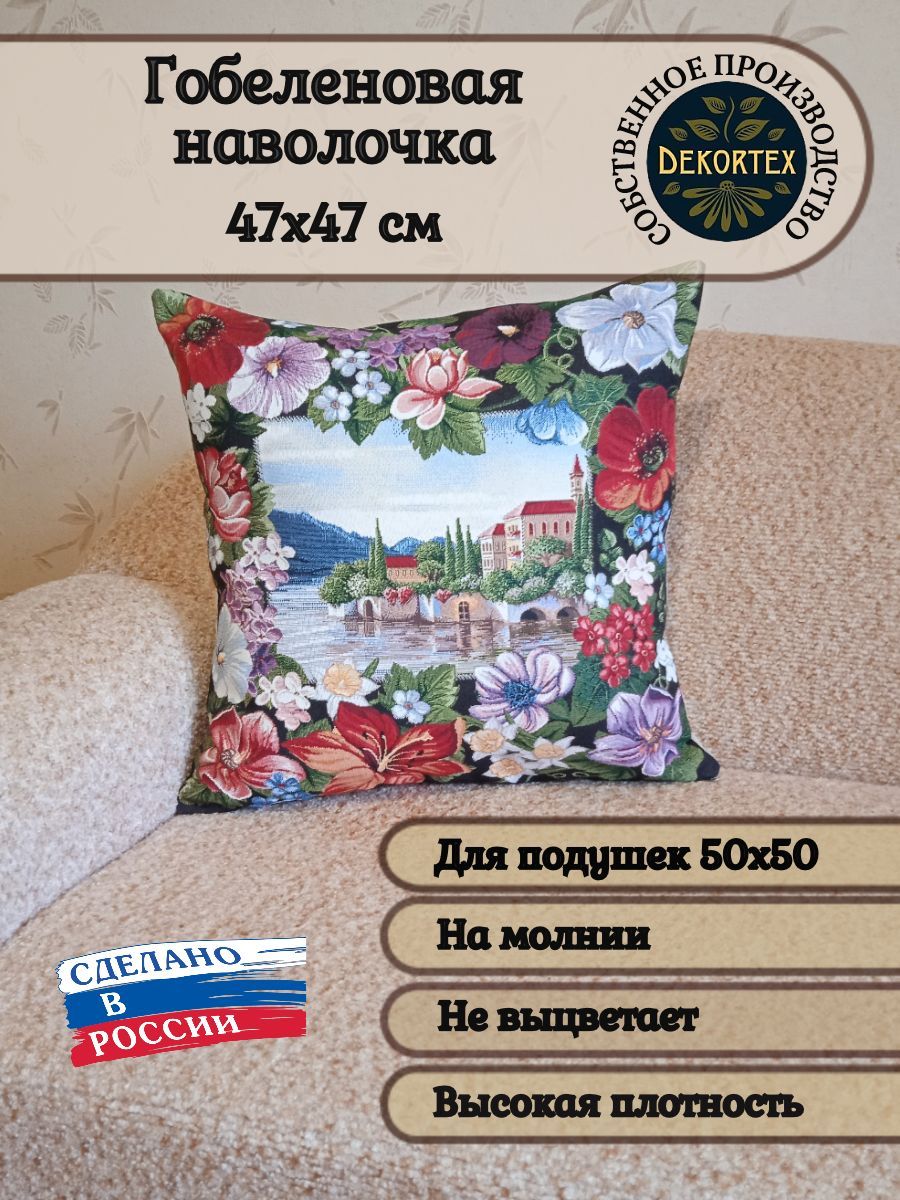 Гобеленовая наволочка для декоративной подушки. Размер наволочки: 47x47см. производство Россия. Изделие собственного производства сшито из отечественной жаккардовой ткани. Задняя часть выполнена из мебельной рогожки так же Российского производства. Все ткани используемые для производства декоративной наволочки производятся с соблюдением ТУ и ГОСТ РФ. Собственное швейное производство позволяет контролировать качество продукции на всех этапах до поступления на склад и предлагать покупателям товары высокого качества по выгодным ценам. Состав ткани 100% полиэстер. Плотность гобелена 380 г/кв.м. Наволочка подходит для подушек размером 50х50 см. Продается без подушки-наполнителя. Подушку-наполнитель так же можно купит у нас. Размер наволочки может отличаться от заявленного +/- 2 см. Допускается деликатная машинная стирка при температуре 30 градусов. Гладить при средней температуре.