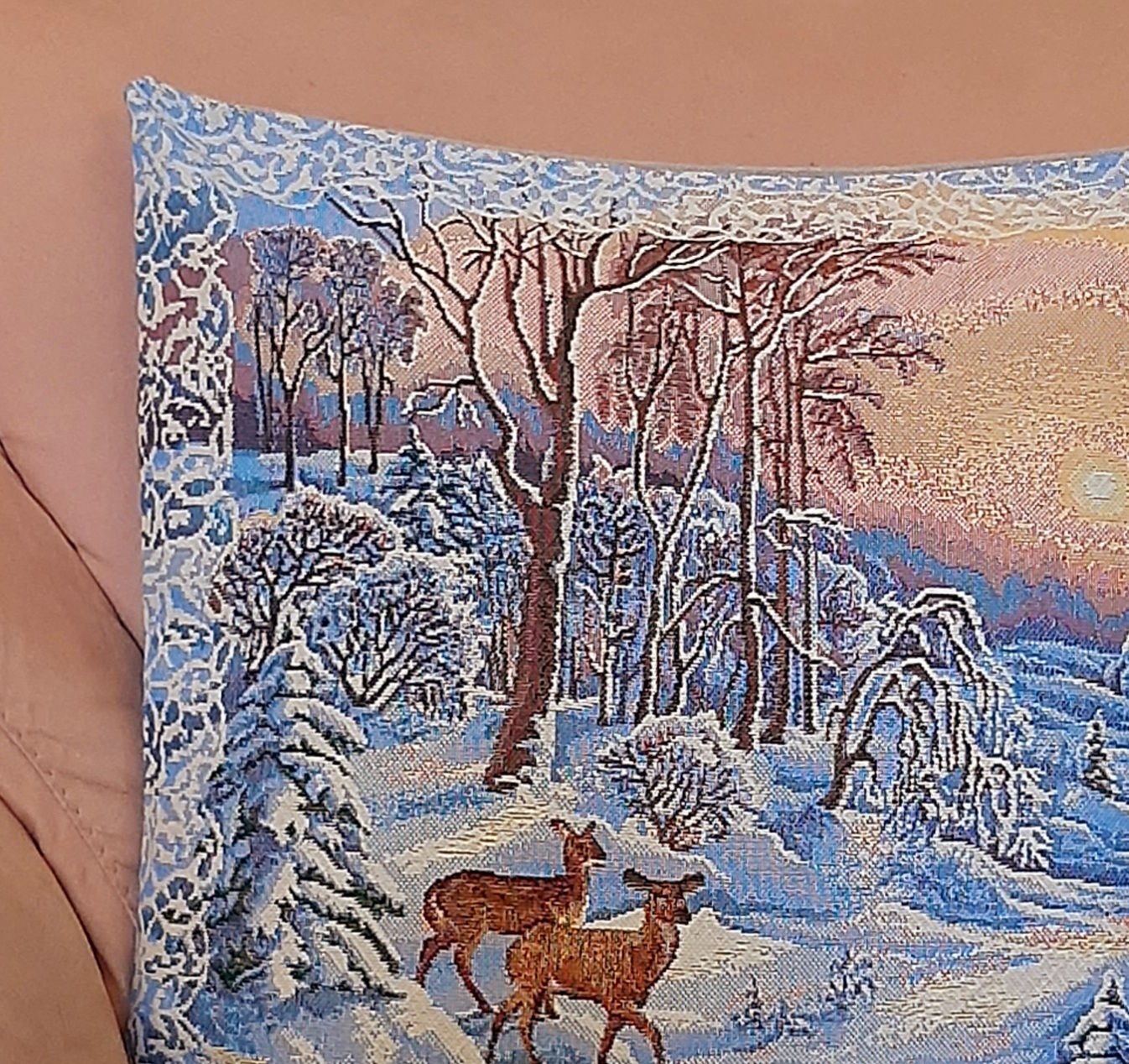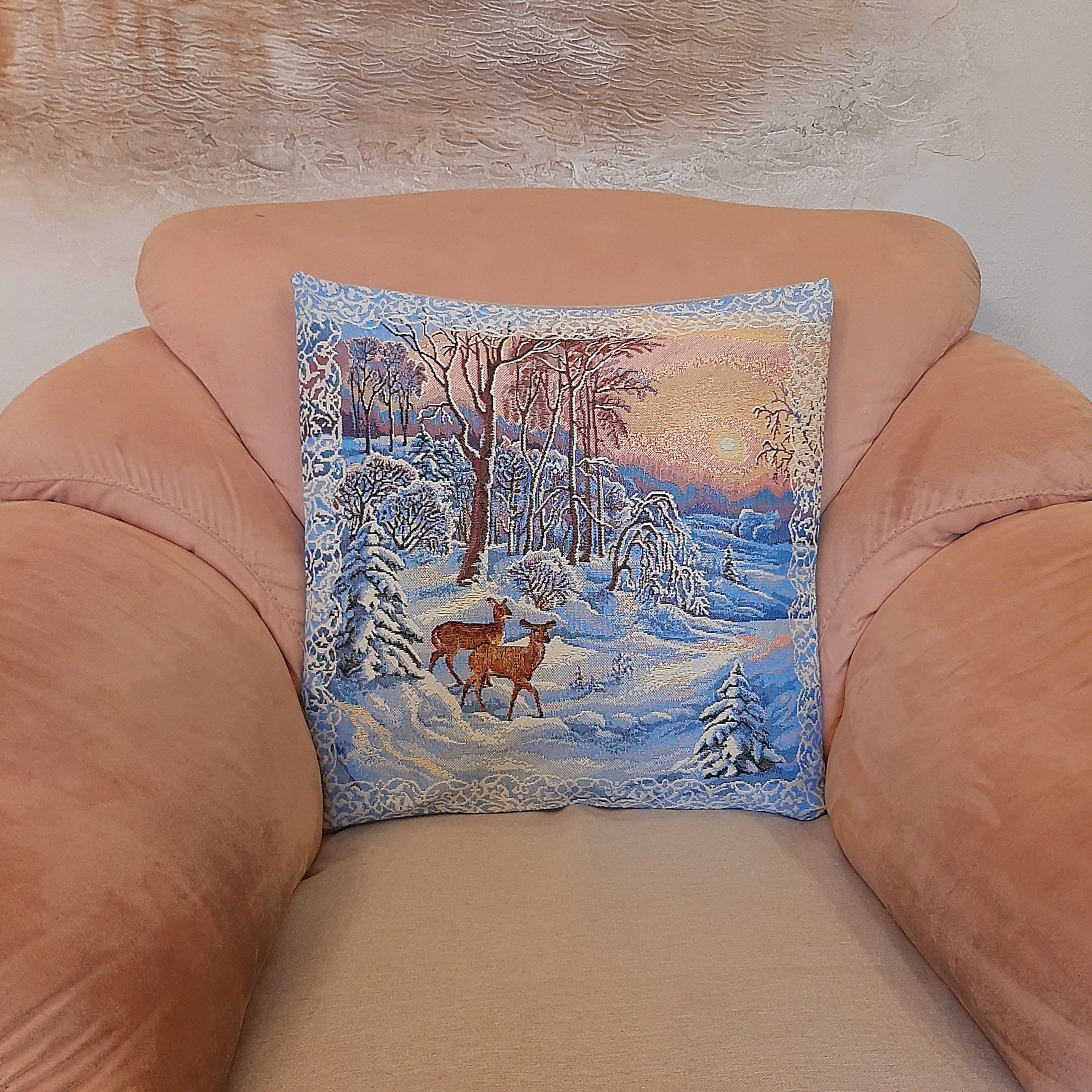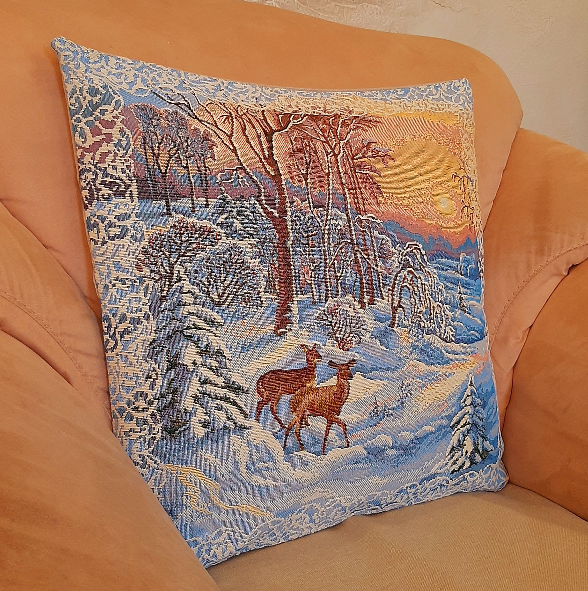Гобеленовая декоративная наволочка с изображением Олений на фоне морозного зимнего пейзажа подойдет для оформления домашнего интерьера в Новогодние праздники. Можно использовать для украшения гостиной, спальни, детской комнаты, кафе, отеля, гостиницы. Можно использовать как дополнительные подушки на диван, кресло, кровать, дачная лавка на веранде. Отличный подарок или сувенир для родных и близких, друзей, коллег по работе, маме, бабушке, теще, тете, сестре, сослуживцам на новый год, новоселье, день рождения, корпоративный подарок, 8 марта.