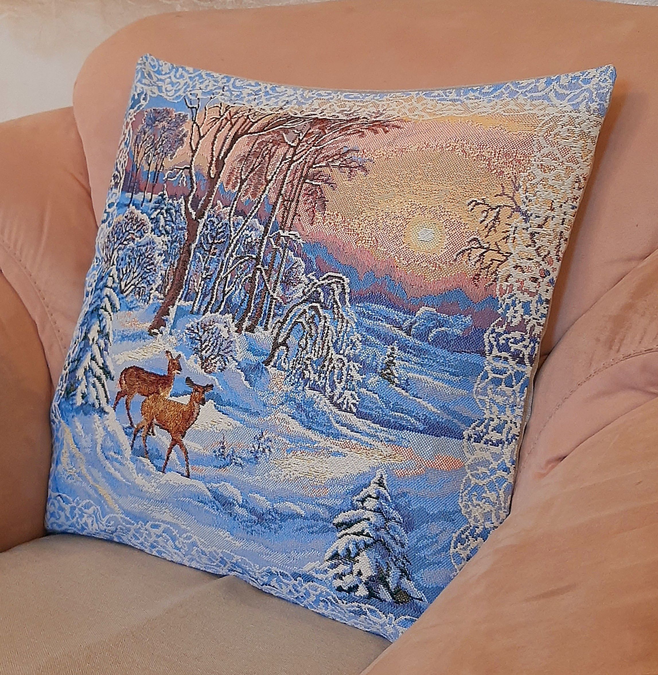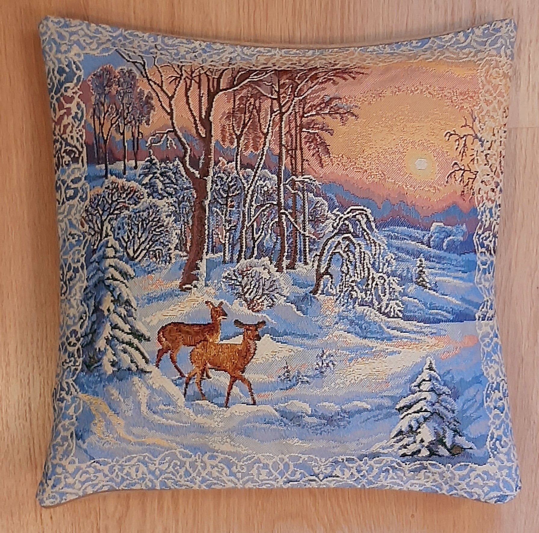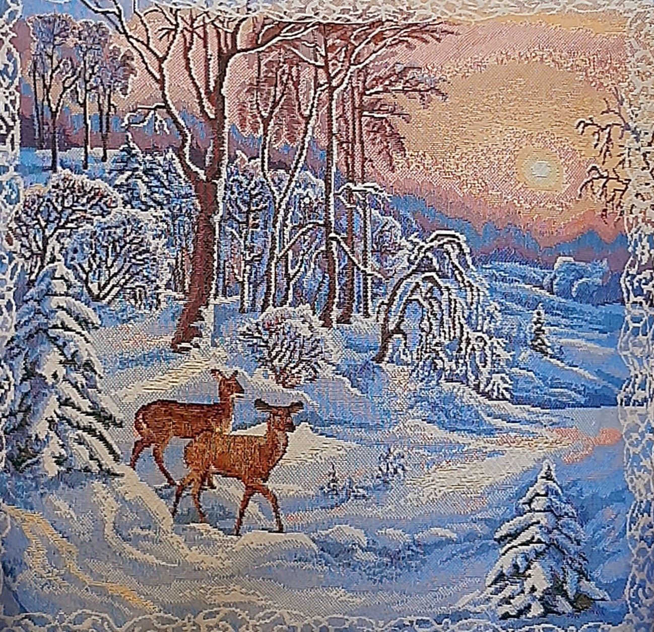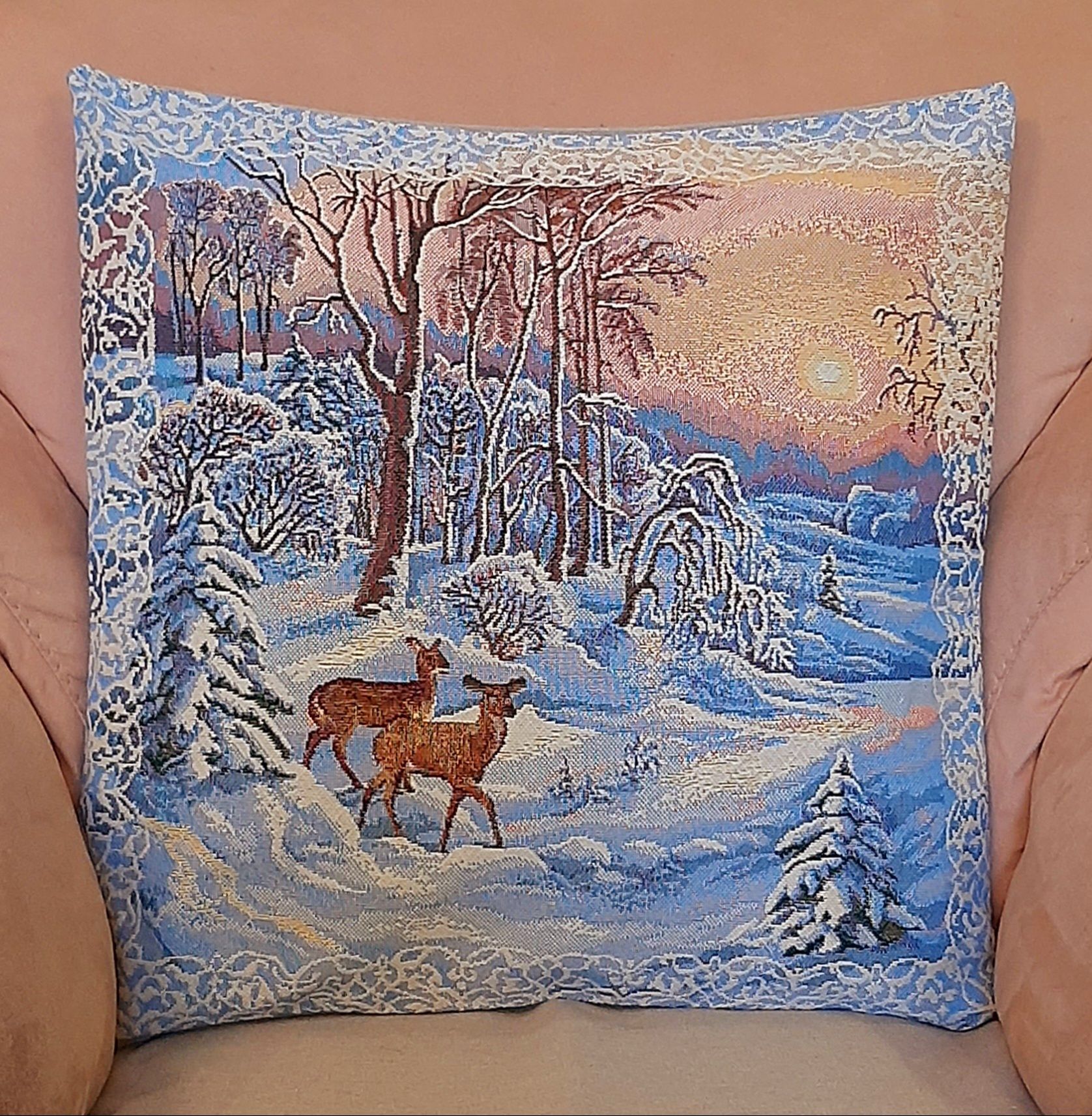 Гобеленовая декоративная наволочка с изображением Олений на фоне морозного зимнего пейзажа подойдет для оформления домашнего интерьера в Новогодние праздники. Можно использовать для украшения гостиной, спальни, детской комнаты, кафе, отеля, гостиницы. Можно использовать как дополнительные подушки на диван, кресло, кровать, дачная лавка на веранде. Отличный подарок или сувенир для родных и близких, друзей, коллег по работе, маме, бабушке, теще, тете, сестре, сослуживцам на новый год, новоселье, день рождения, корпоративный подарок, 8 марта.