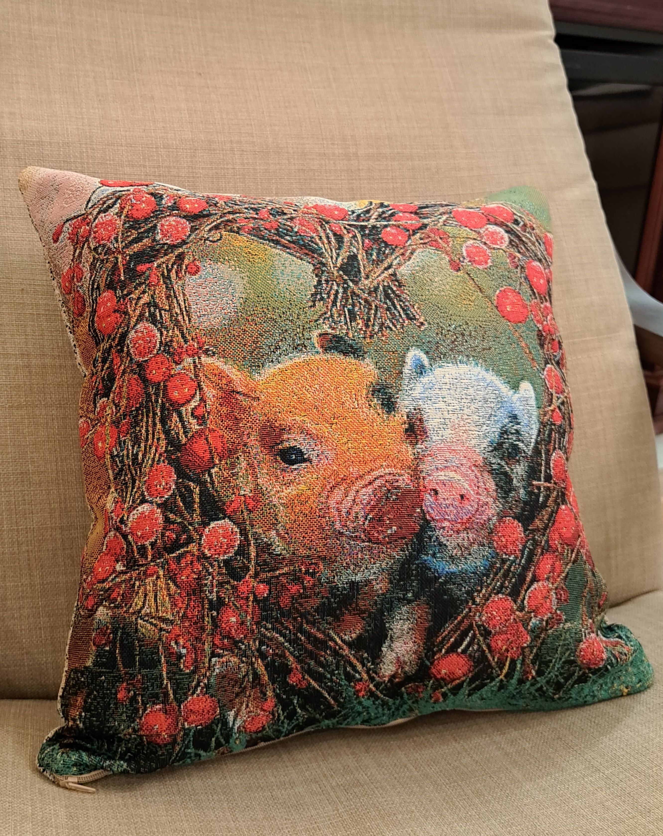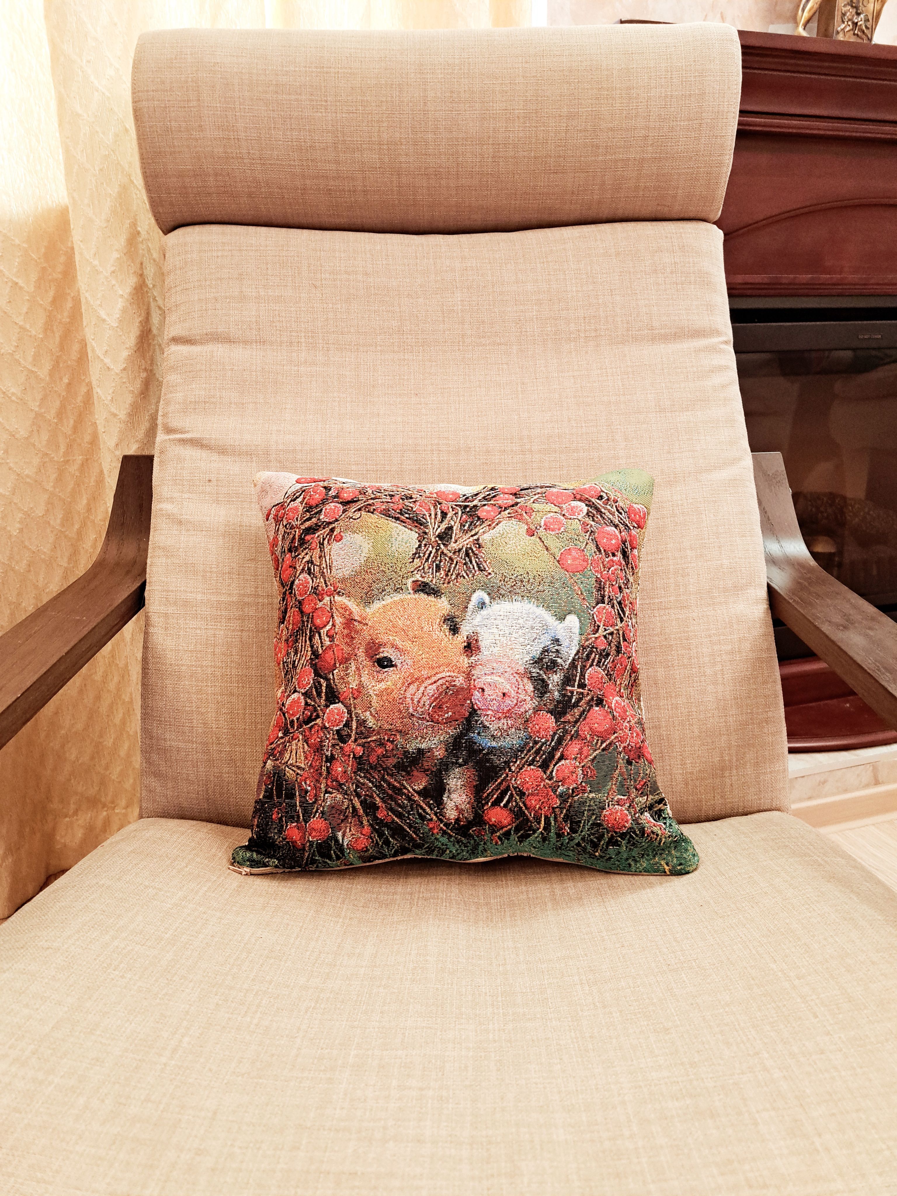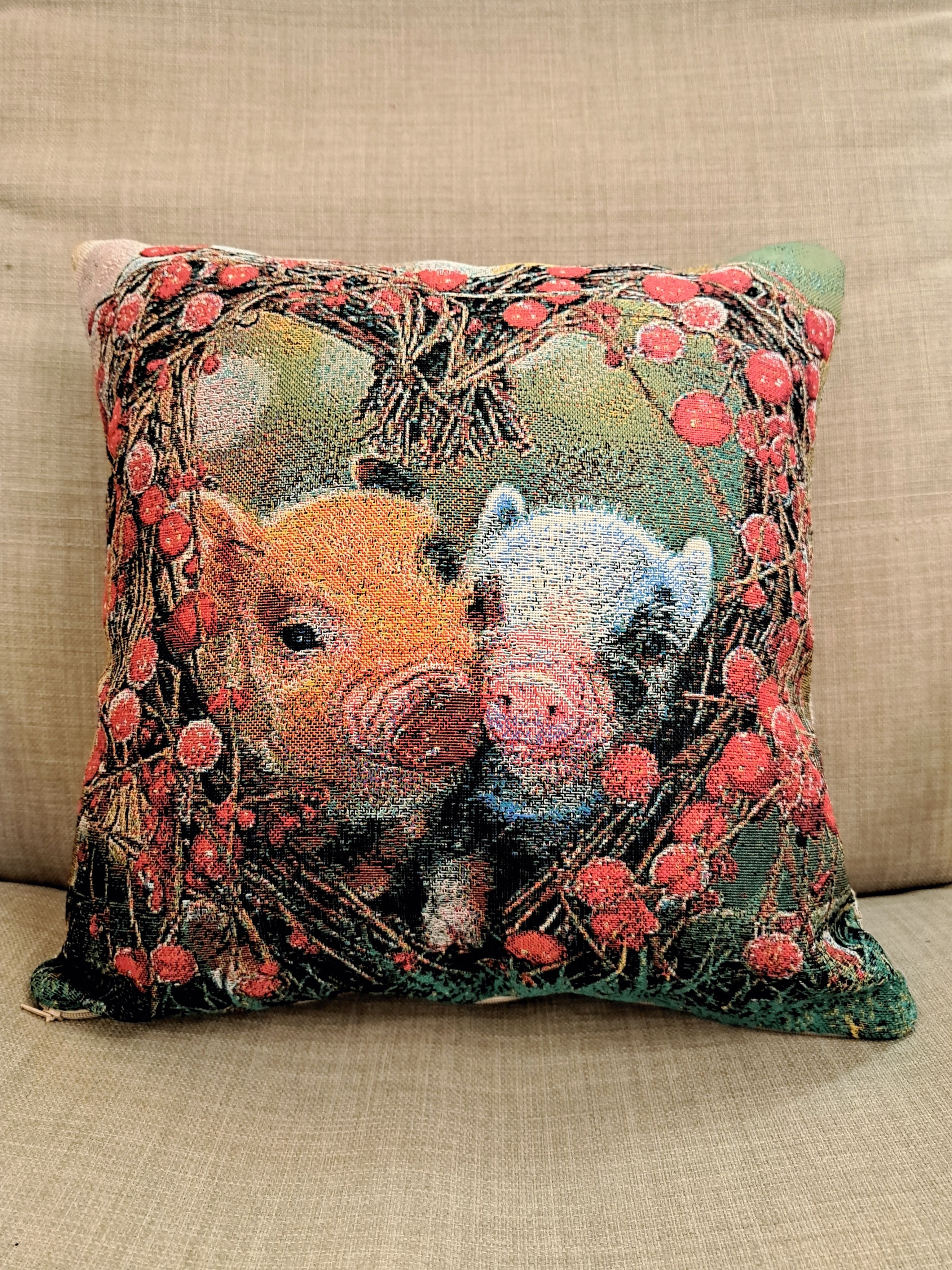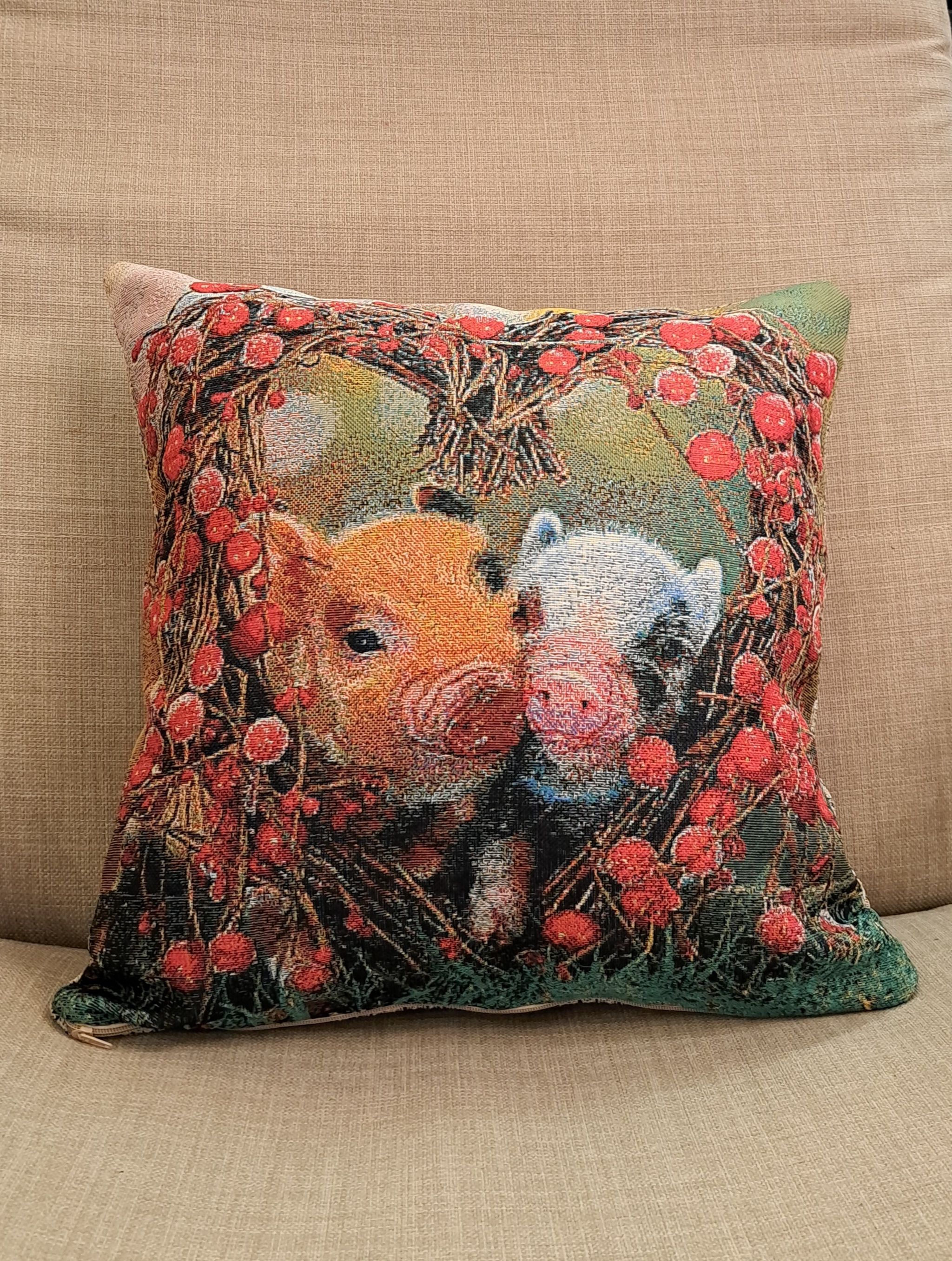 Гобеленовая декоративная наволочка с изображением милых поросят, мини-пиги, в обрамлении цветов (красных роз) в форме сердечка. Подойдет для оформления домашнего интерьера в Новогодние праздники. Можно использовать для украшения гостиной, спальни, детской комнаты, кафе, отеля, гостиницы. Можно использовать как дополнительные подушки на диван, кресло, кровать, дачная лавка на веранде. Отличный подарок или сувенир для родных и близких, друзей, коллег по работе, маме, бабушке, теще, тете, сестре, сослуживцам на новый год, новоселье, день рождения, корпоративный подарок, 8 марта.