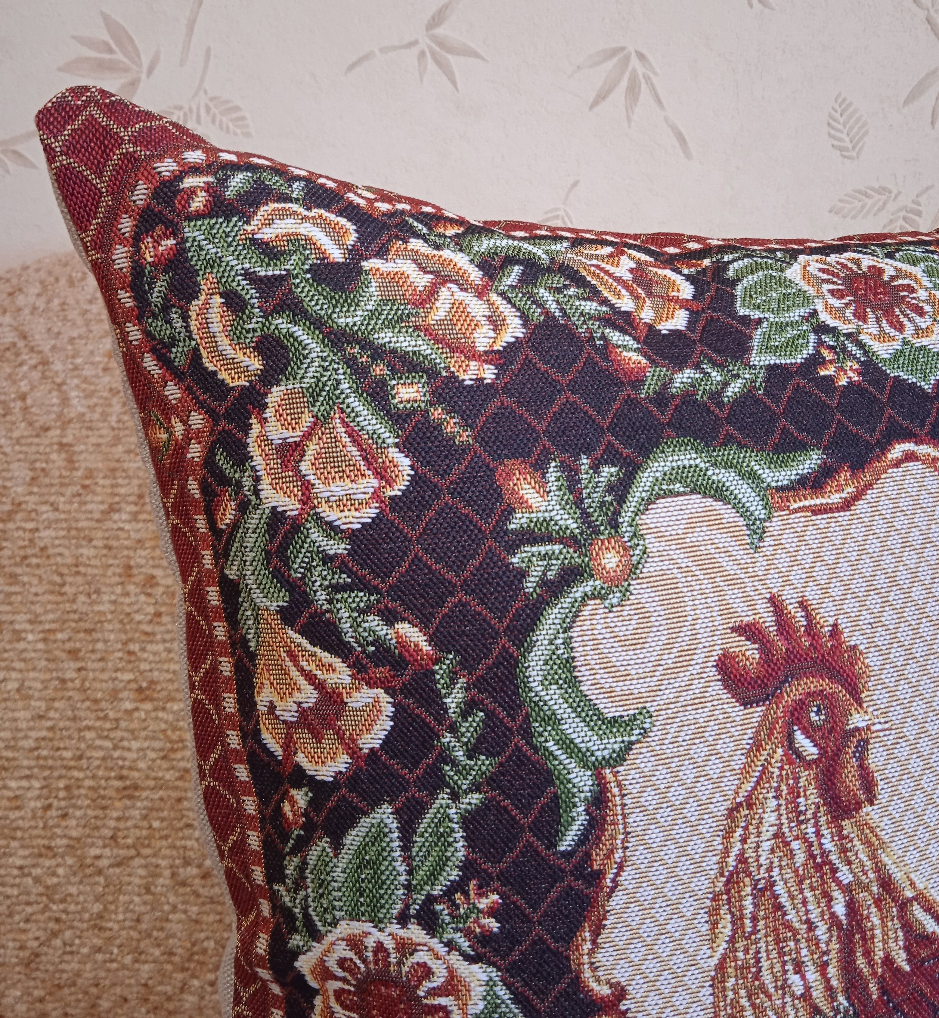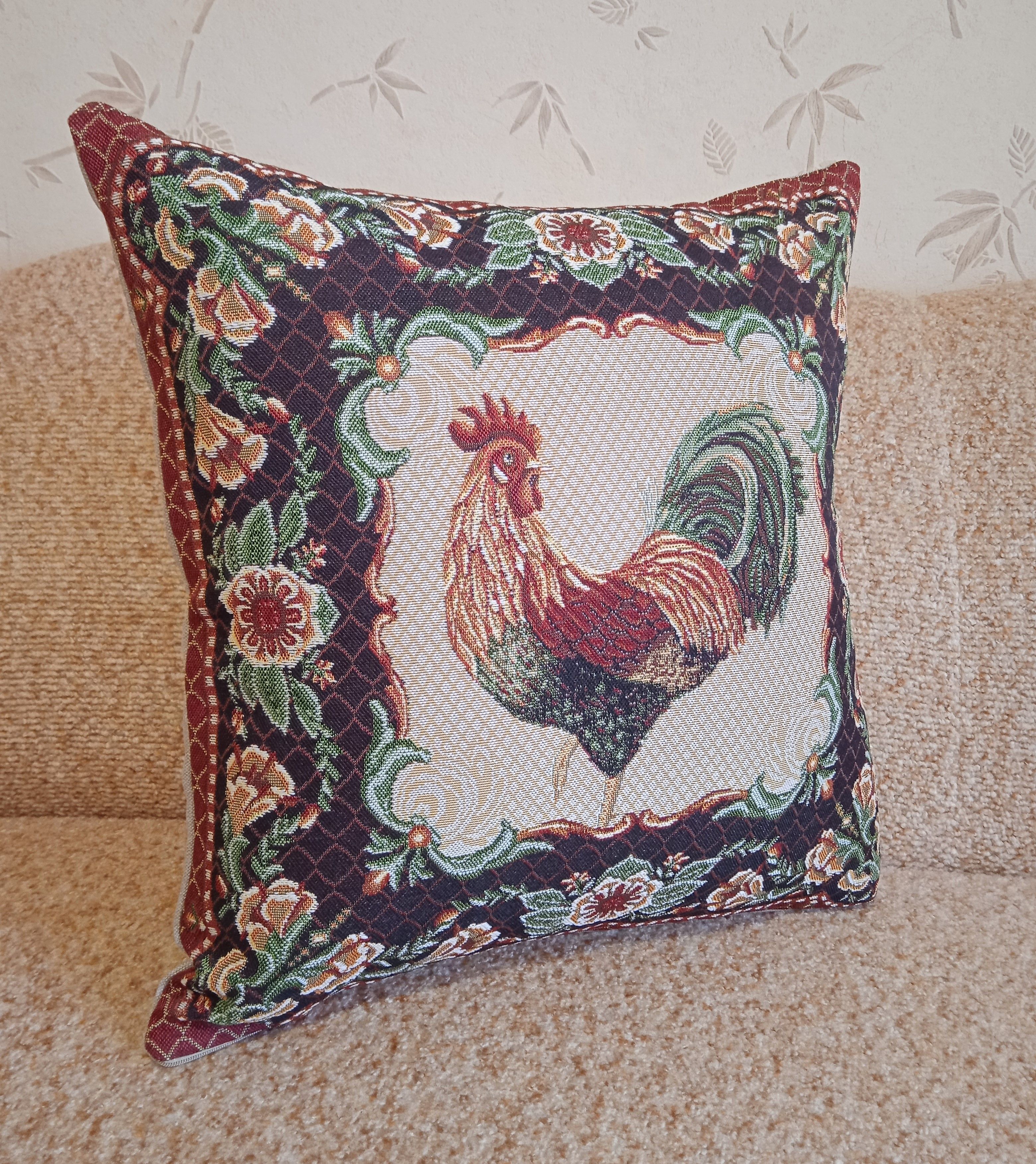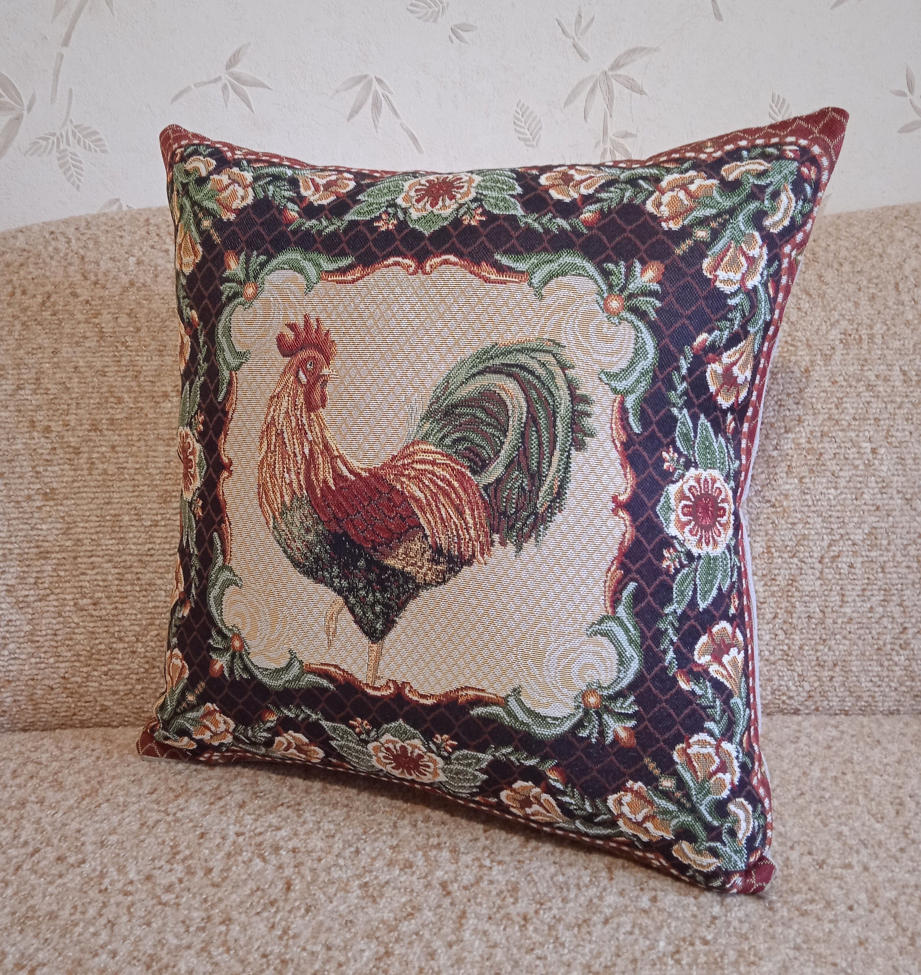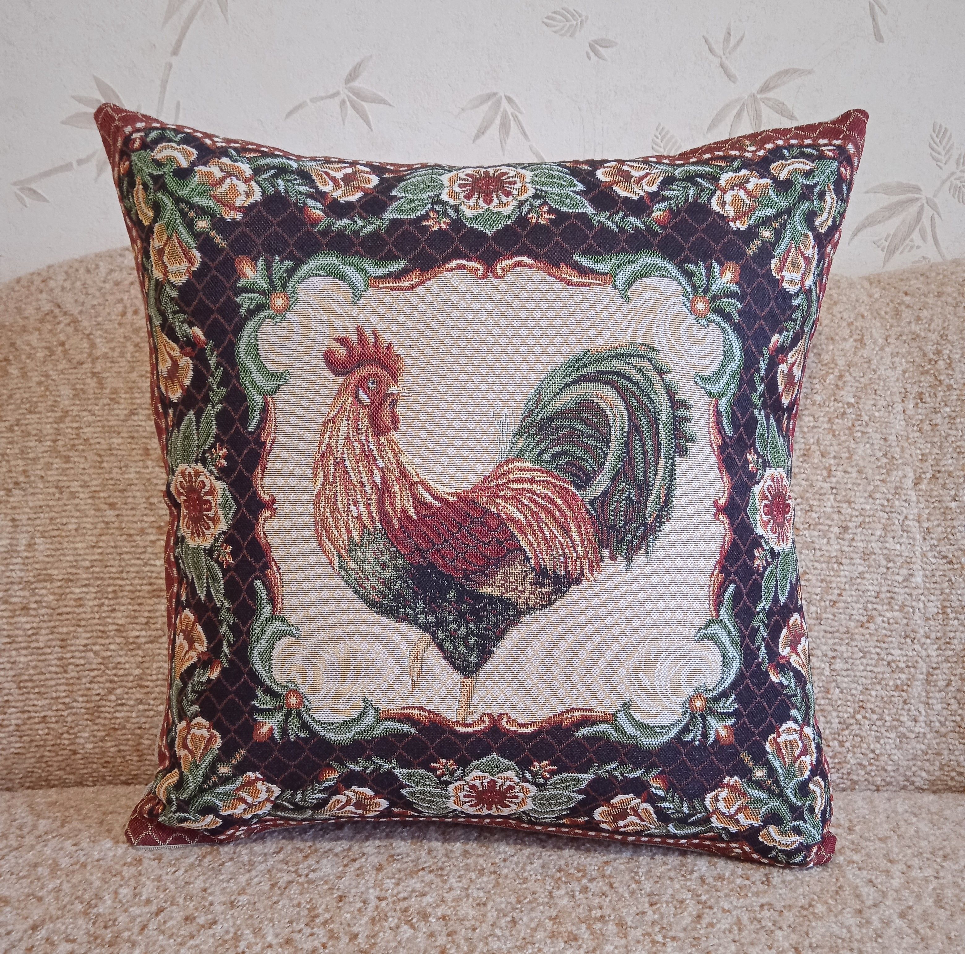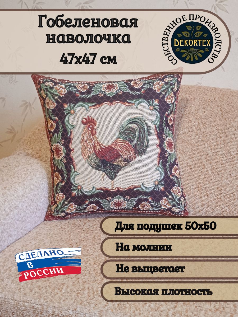 Гобеленовый чехол для декоративной подушки. Размер чехла: 47x47см. производство Россия. Изделие собственного производства сшито из отечественной жаккардовой ткани. Задняя часть выполнена из мебельной рогожки так же Российского производства. Все ткани используемые для производства декоративного чехла производятся с соблюдением ТУ и ГОСТ Р.Ф. Собственное швейное производство позволяет контролировать качество продукции на всех этапах до поступления на склад, и предлагать покупателям товары высокого качества по выгодным ценам. Состав ткани 100% полиэстер. Плотность гобелена 380 г/кв.м. Чехол подходит для подушек размером от 45 до 50 см. Продается без подушки-наполнителя. Подушку-наполнитель так же можно купит у нас. Размер чехла может отличаться от заявленного +/- 2 см. Допускается деликатная машинная стирка при температуре 30 градусов. Гладить при средней температуре.