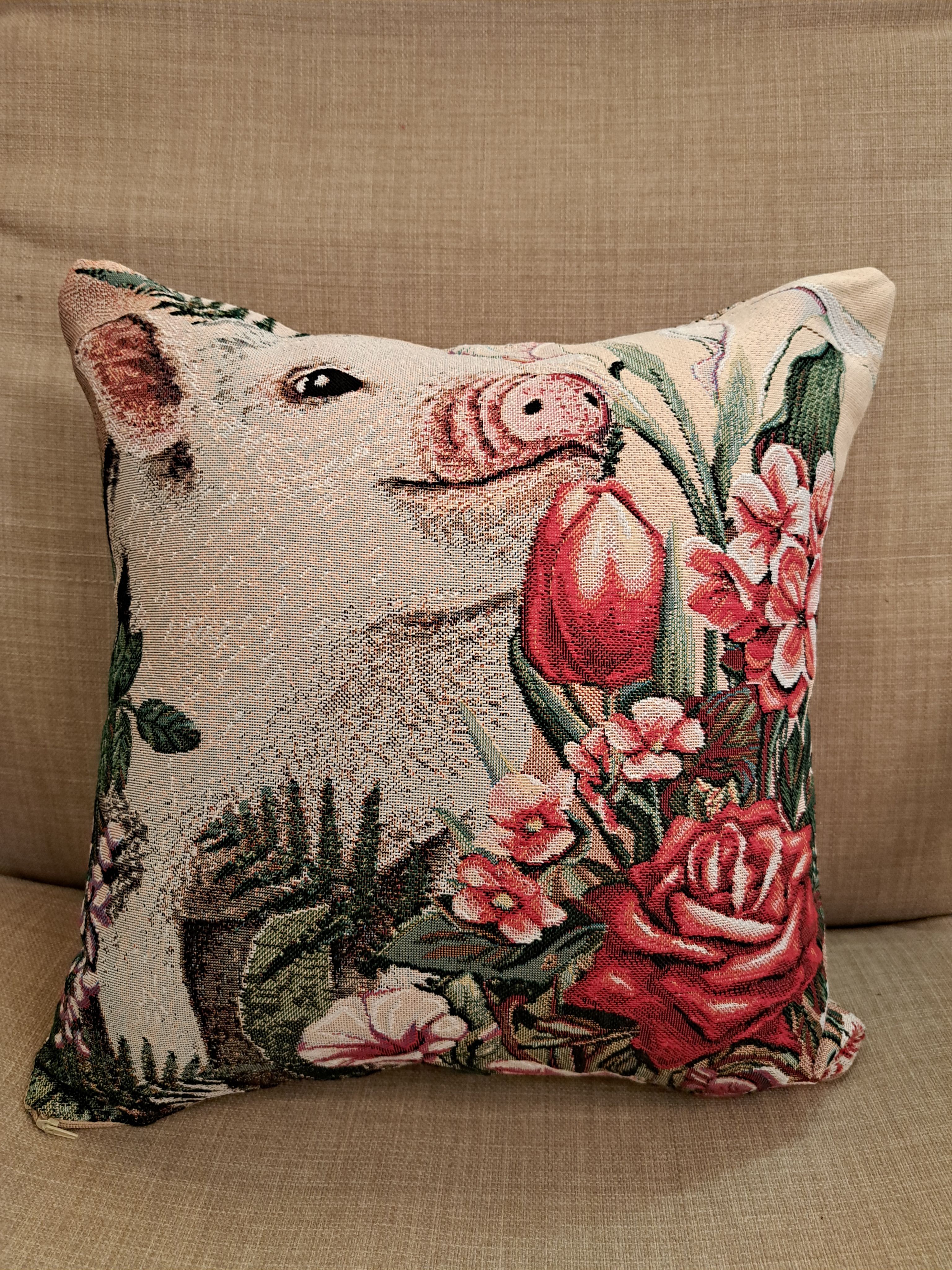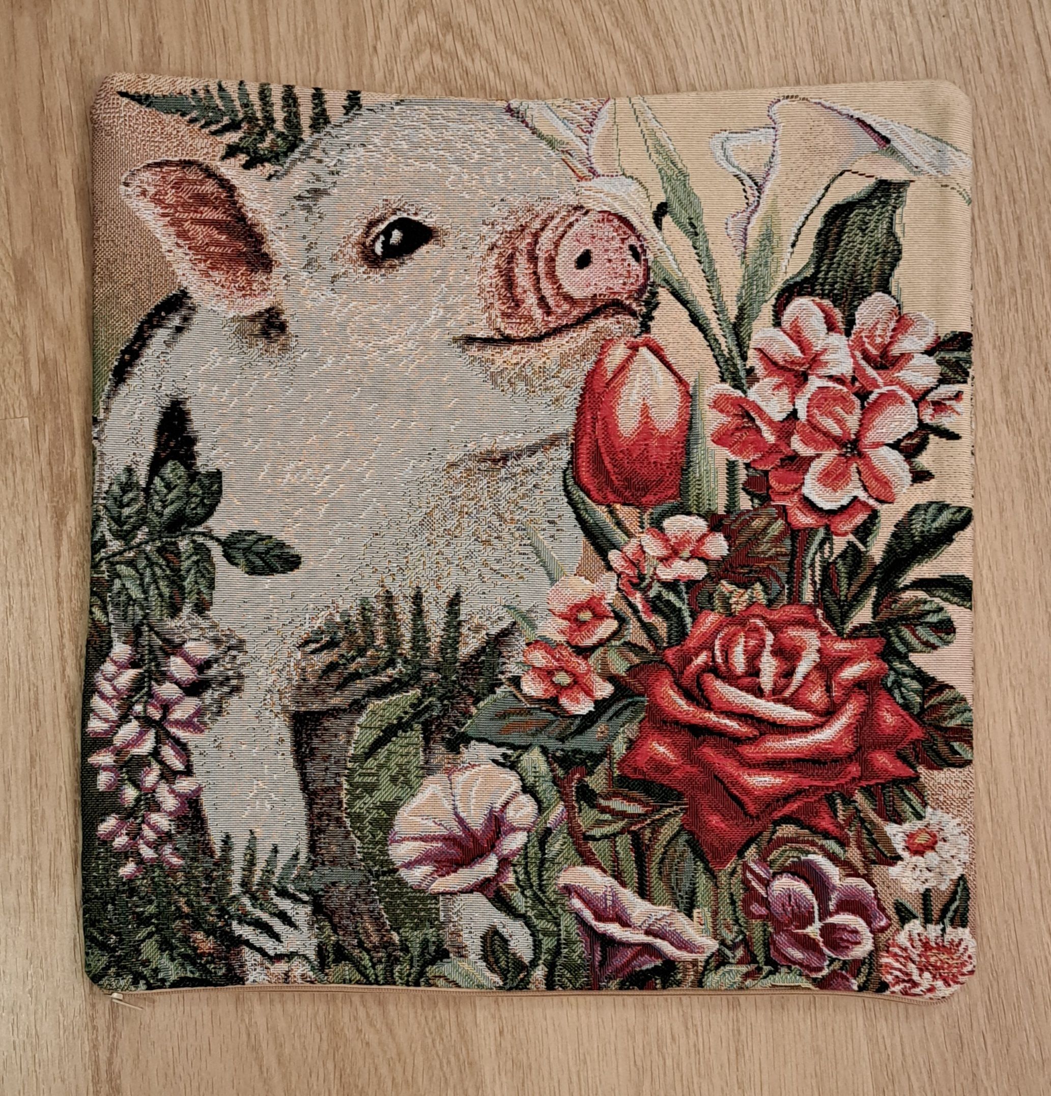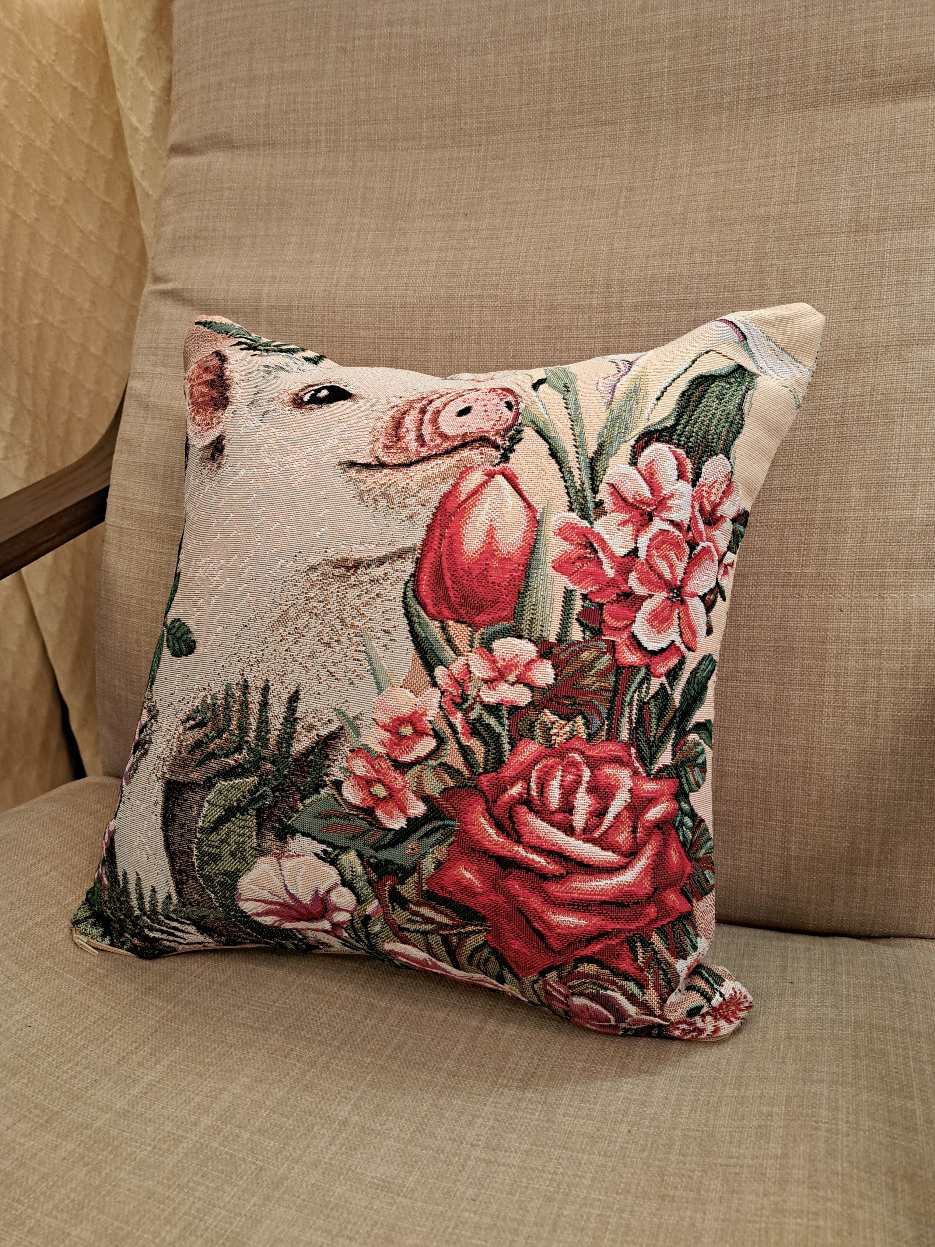 Гобеленовая декоративная наволочка с изображением забавного поросенка, мини-пиги, наслаждающегося ароматом цветов. Подойдет для оформления домашнего интерьера в Новогодние праздники. Можно использовать для украшения гостиной, спальни, детской комнаты, кафе, отеля, гостиницы. Можно использовать как дополнительные подушки на диван, кресло, кровать, дачная лавка на веранде. Отличный подарок или сувенир для родных и близких, друзей, коллег по работе, маме, бабушке, теще, тете, сестре, сослуживцам на новый год, новоселье, день рождения, корпоративный подарок, 8 марта.