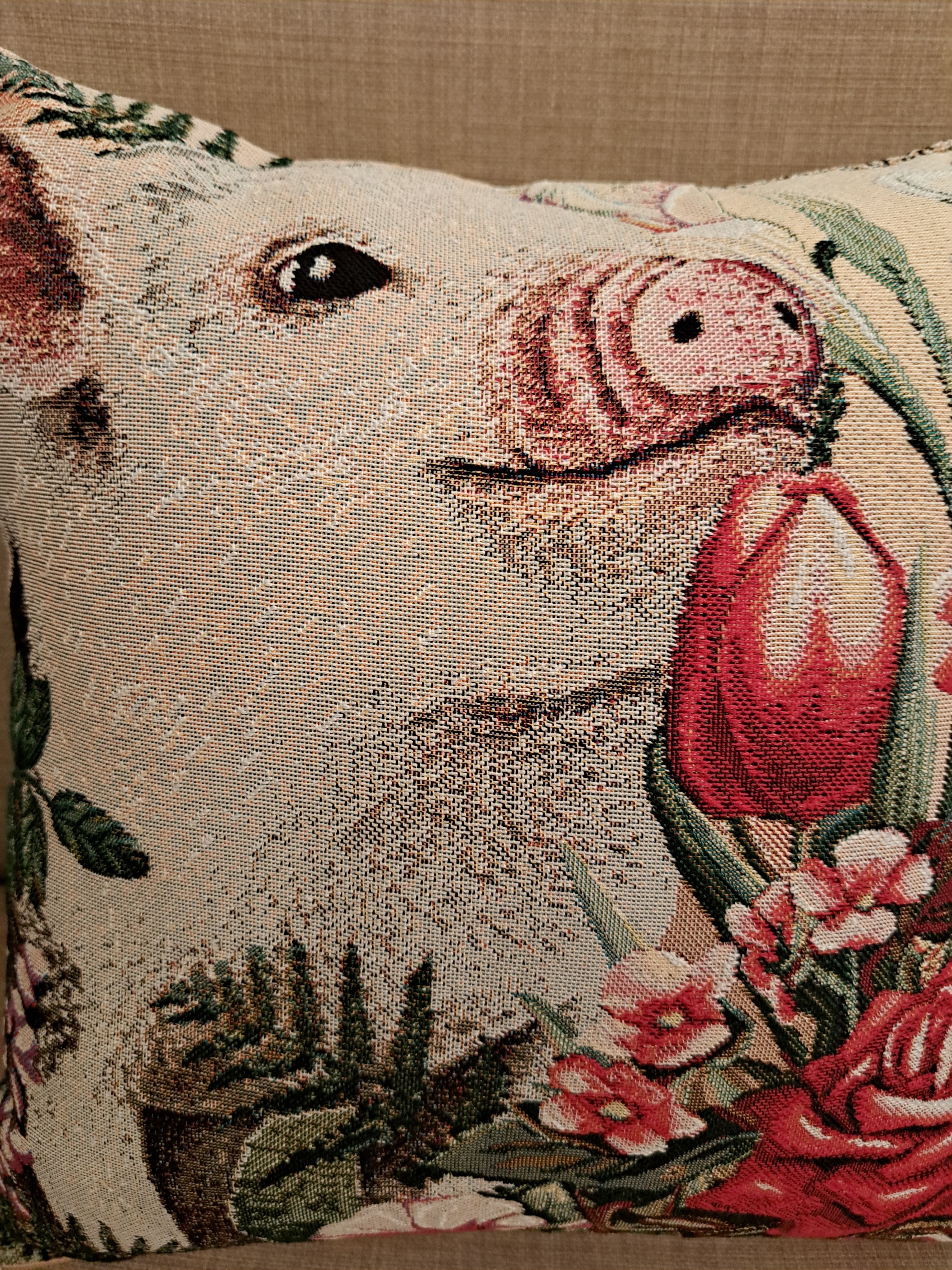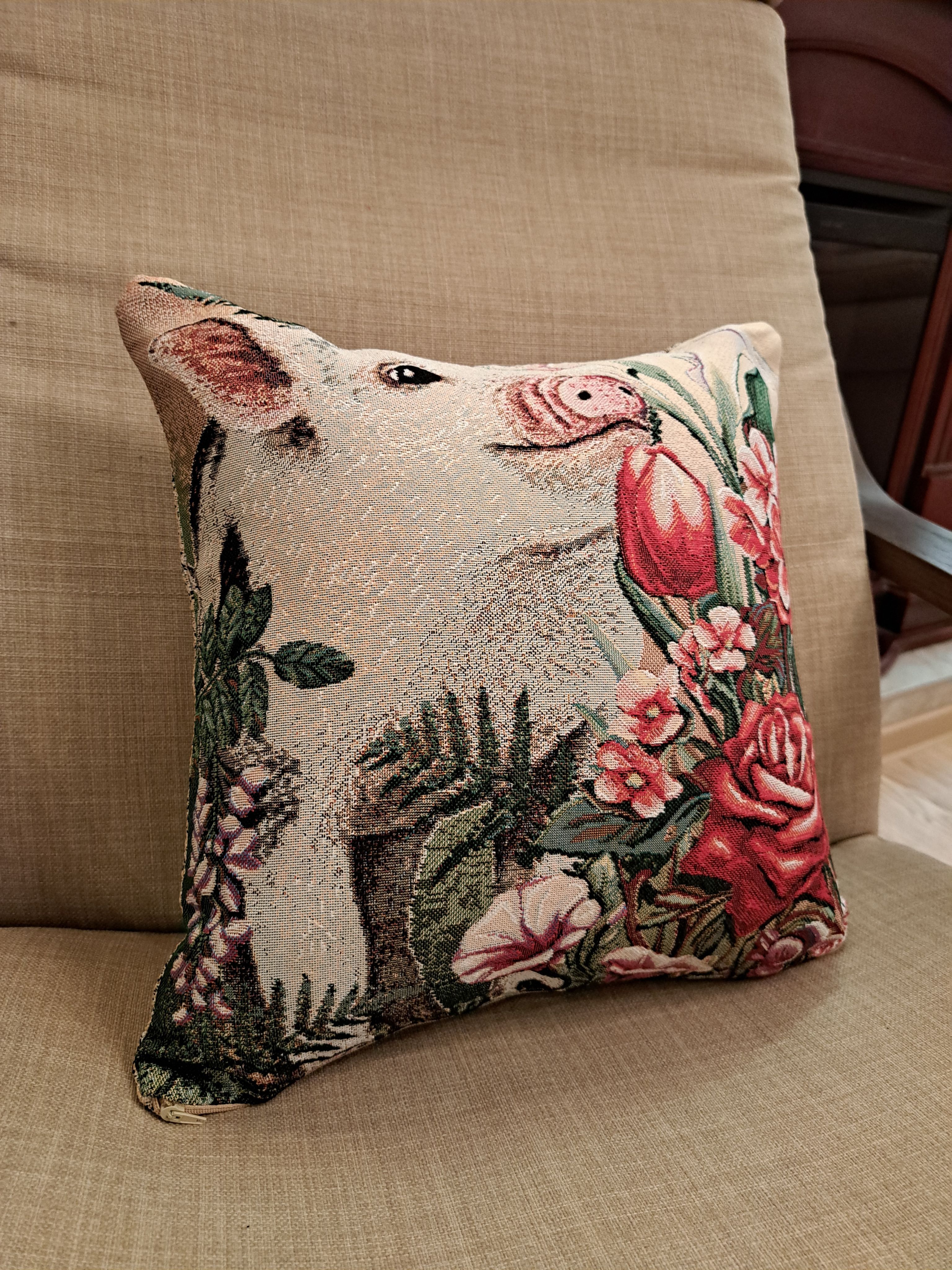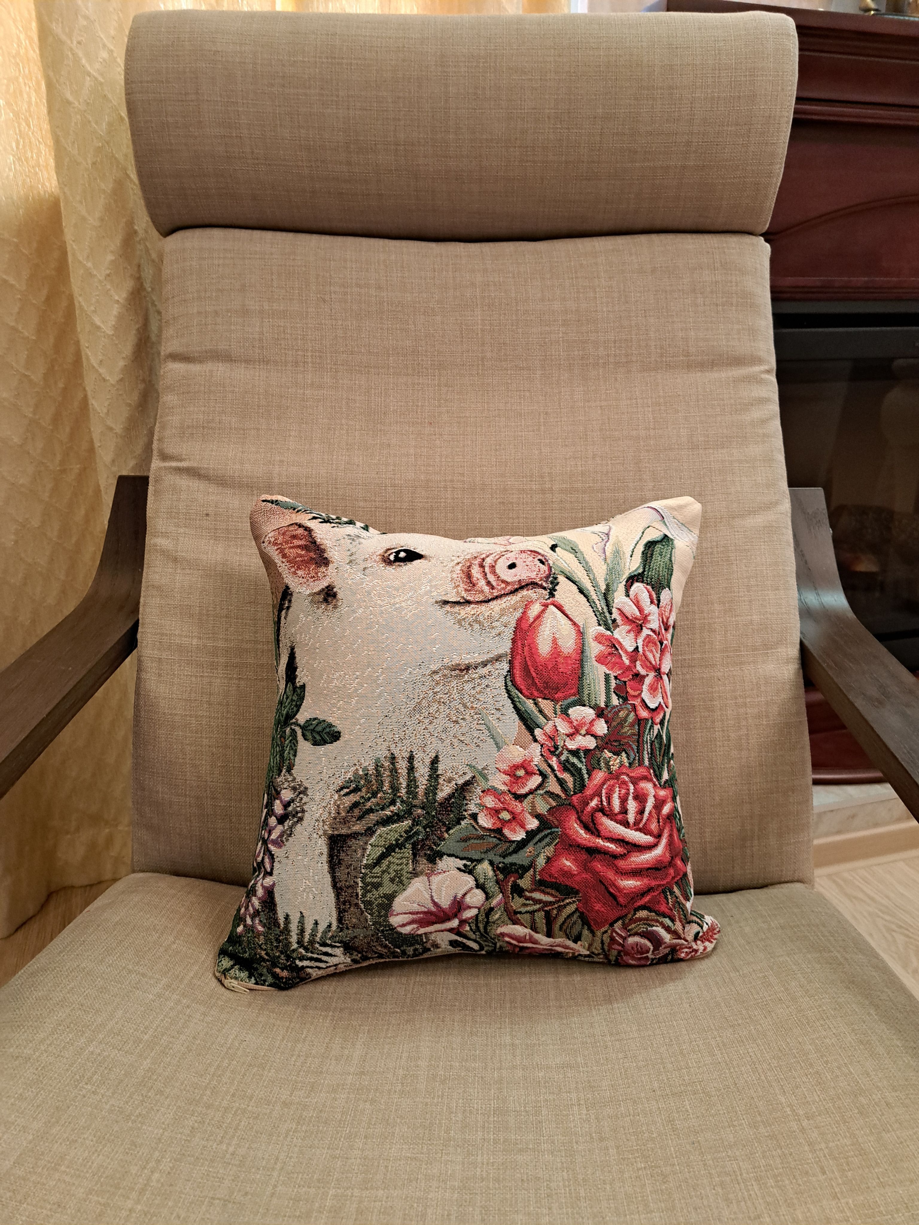 Гобеленовая декоративная наволочка с изображением забавного поросенка, мини-пиги, наслаждающегося ароматом цветов. Подойдет для оформления домашнего интерьера в Новогодние праздники. Можно использовать для украшения гостиной, спальни, детской комнаты, кафе, отеля, гостиницы. Можно использовать как дополнительные подушки на диван, кресло, кровать, дачная лавка на веранде. Отличный подарок или сувенир для родных и близких, друзей, коллег по работе, маме, бабушке, теще, тете, сестре, сослуживцам на новый год, новоселье, день рождения, корпоративный подарок, 8 марта.