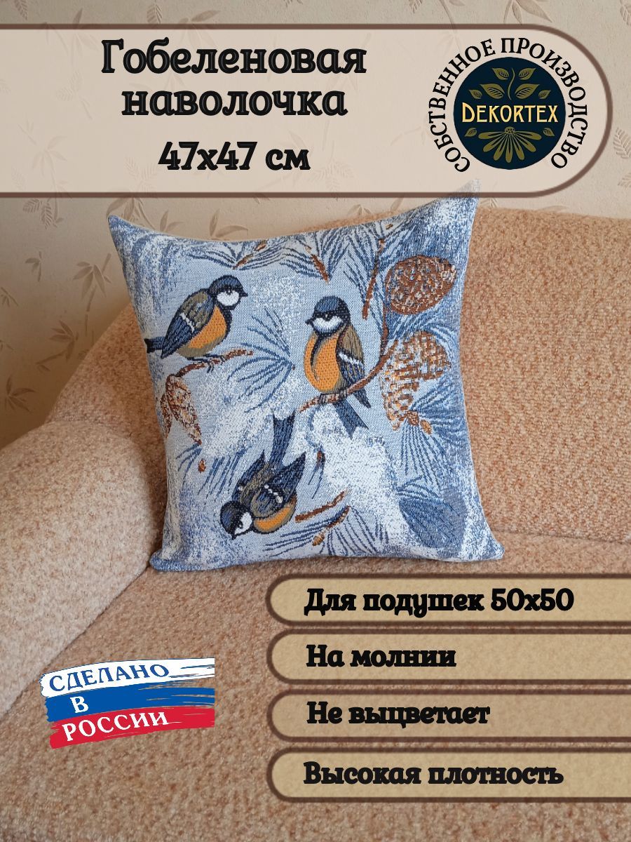 Гобеленовая наволочка для декоративной подушки. Размер наволочки: 47x47см. производство Россия. Изделие собственного производства сшито из отечественной жаккардовой ткани. Задняя часть выполнена из мебельной рогожки так же Российского производства. Все ткани используемые для производства декоративной наволочки производятся с соблюдением ТУ и ГОСТ РФ. Собственное швейное производство позволяет контролировать качество продукции на всех этапах до поступления на склад и предлагать покупателям товары высокого качества по выгодным ценам. Состав ткани 100% полиэстер. Плотность гобелена 380 г/кв.м. Наволочка подходит для подушек размером 50х50 см. Продается без подушки-наполнителя. Подушку-наполнитель так же можно купит у нас. Размер наволочки может отличаться от заявленного +/- 2 см. Допускается деликатная машинная стирка при температуре 30 градусов. Гладить при средней температуре.