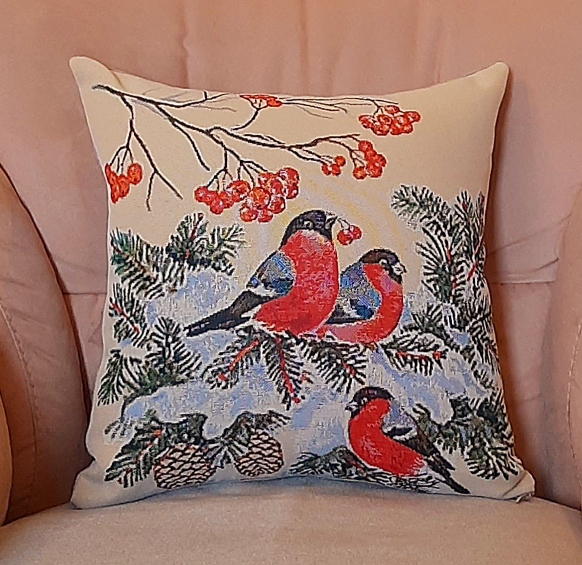 Гобеленовая декоративная наволочка с изображением ярких, красногрудых снегирей на фоне заснеженных сосновых веток и ягод рябины подойдет для оформления домашнего интерьера в Новогодние праздники. Можно использовать для украшения гостиной, спальни, детской комнаты, кафе, отеля, гостиницы. Можно использовать как дополнительные подушки на диван, кресло, кровать, дачная лавка на веранде. Отличный подарок или сувенир для родных и близких, друзей, коллег по работе, маме, бабушке, теще, тете, сестре, сослуживцам на новый год, новоселье, день рождения, корпоративный подарок, 8 марта.