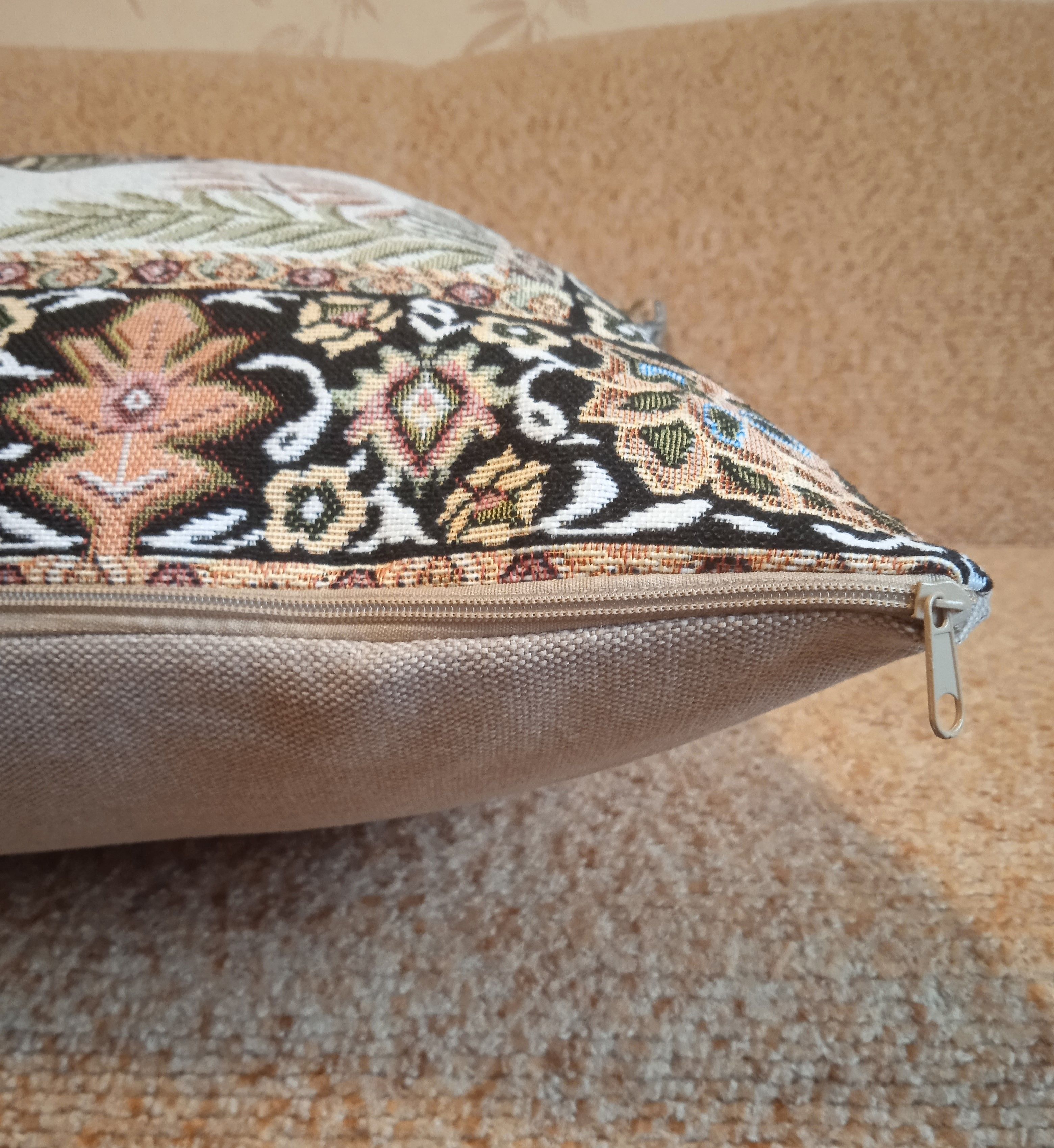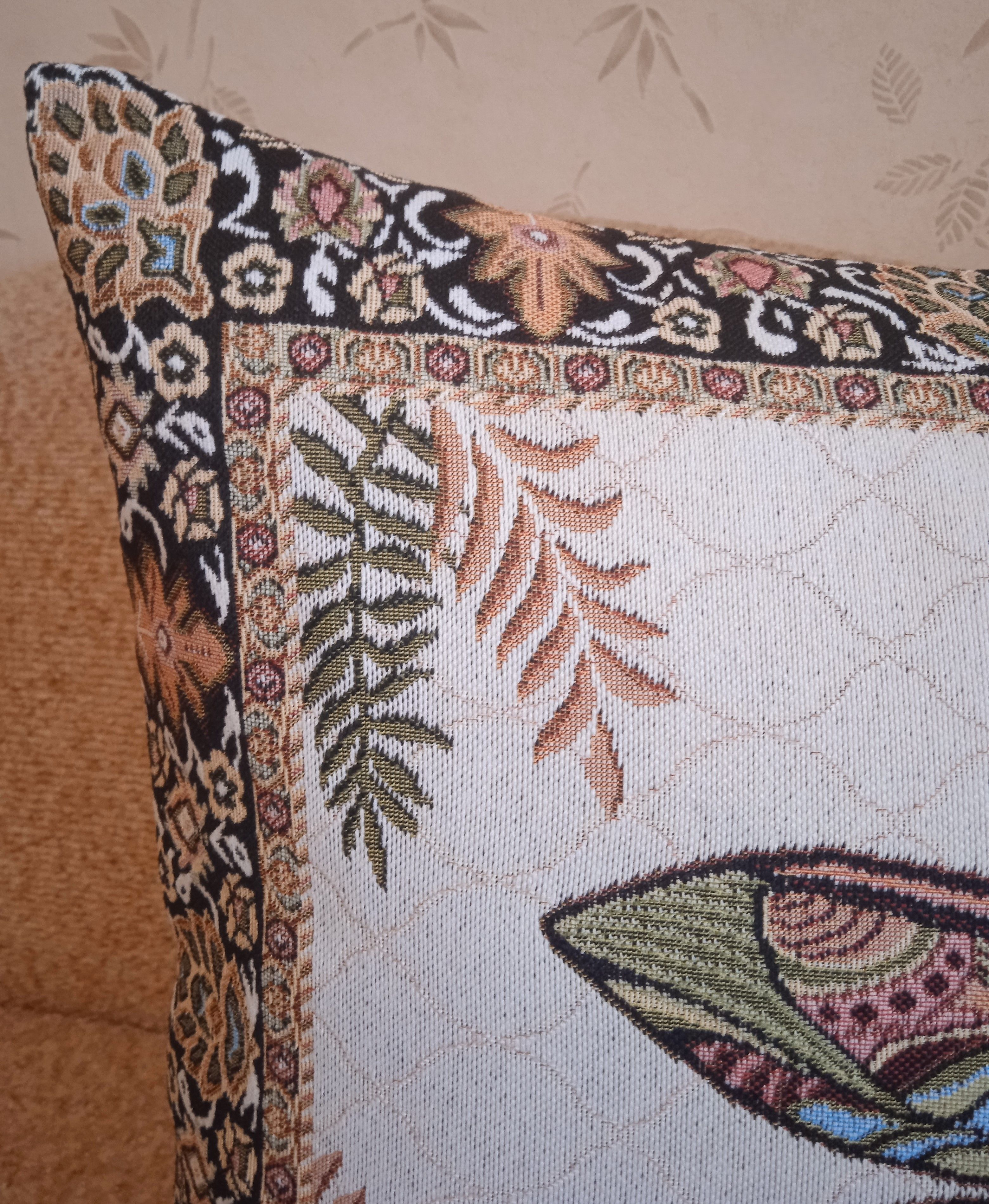 Гобеленовый чехол для декоративной подушки. Размер чехла: 47x68 см. производство Россия. Изделие собственного производства сшито из отечественной жаккардовой ткани. Задняя часть выполнена из мебельной рогожки так же Российского производства. Все ткани используемые для производства декоративного чехла производятся с соблюдением ТУ и ГОСТ РФ. Собственное швейное производство позволяет контролировать качество продукции на всех этапах до поступления на склад и предлагать покупателям товары высокого качества по выгодным ценам. Состав ткани 100% полиэстер. Плотность гобелена 380 г/кв.м. Чехол подходит для подушек размером 70х50 см. Продается без подушки-наполнителя. Подушку-наполнитель так же можно купит у нас. Размер чехла может отличаться от заявленного +/- 2 см. Допускается деликатная машинная стирка при температуре 30 градусов. Гладить при средней температуре.