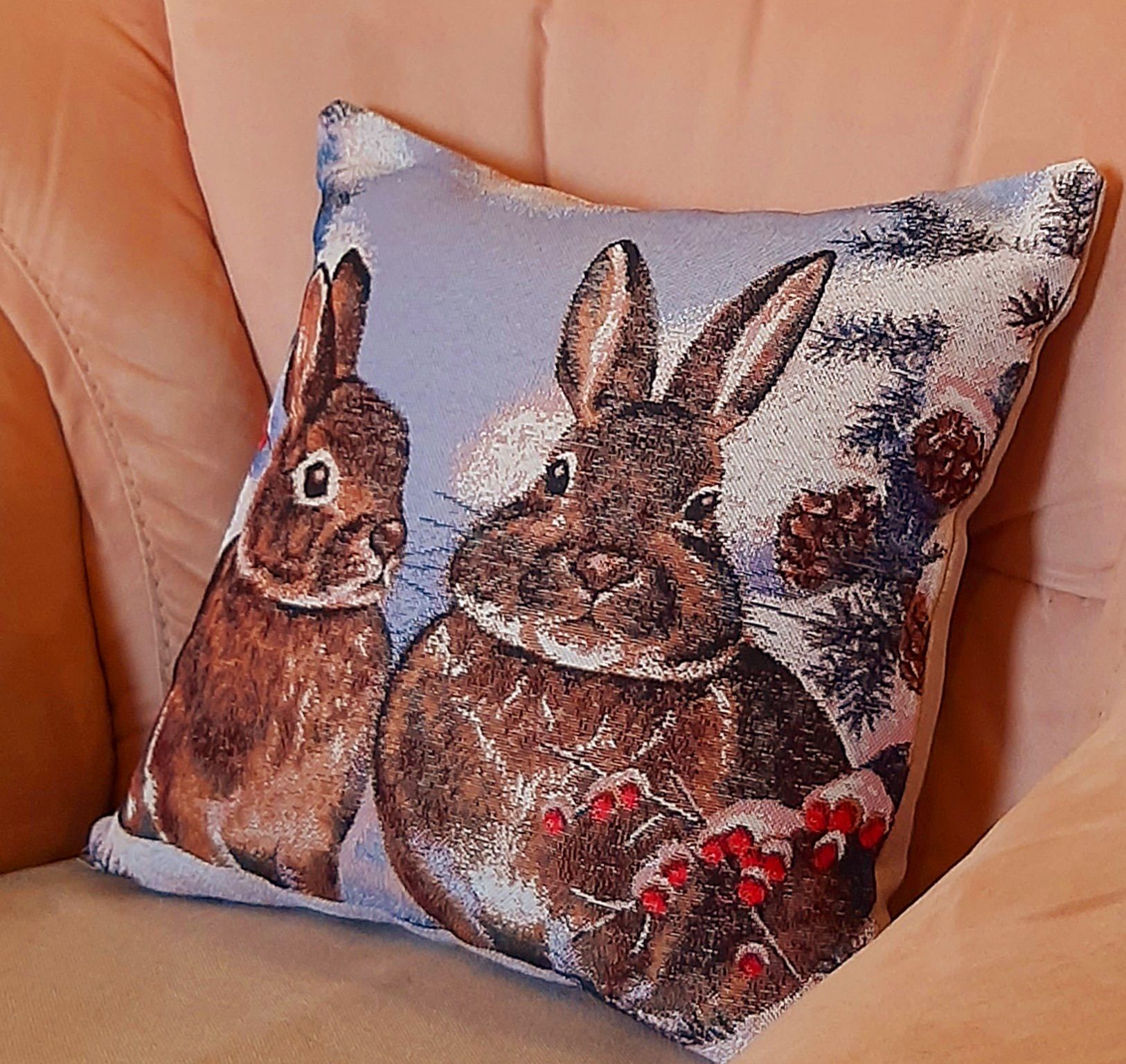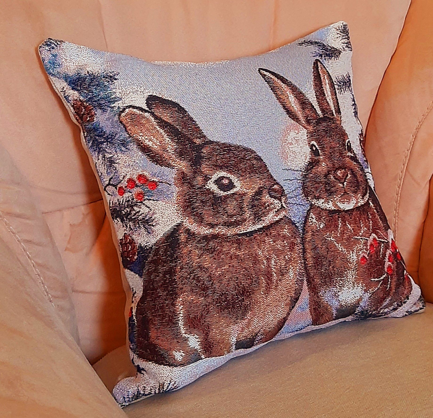 Гобеленовая декоративная наволочка с изображением пушистых серых зайчиков на фоне заснеженных сосновых веток и ягод рябины подойдет для оформления домашнего интерьера в Новогодние праздники. Можно использовать для украшения гостиной, спальни, детской комнаты, кафе, отеля, гостиницы. Можно использовать как дополнительные подушки на диван, кресло, кровать, дачная лавка на веранде. Отличный подарок или сувенир для родных и близких, друзей, коллег по работе, маме, бабушке, теще, тете, сестре, сослуживцам на новый год, новоселье, день рождения, корпоративный подарок, 8 марта.