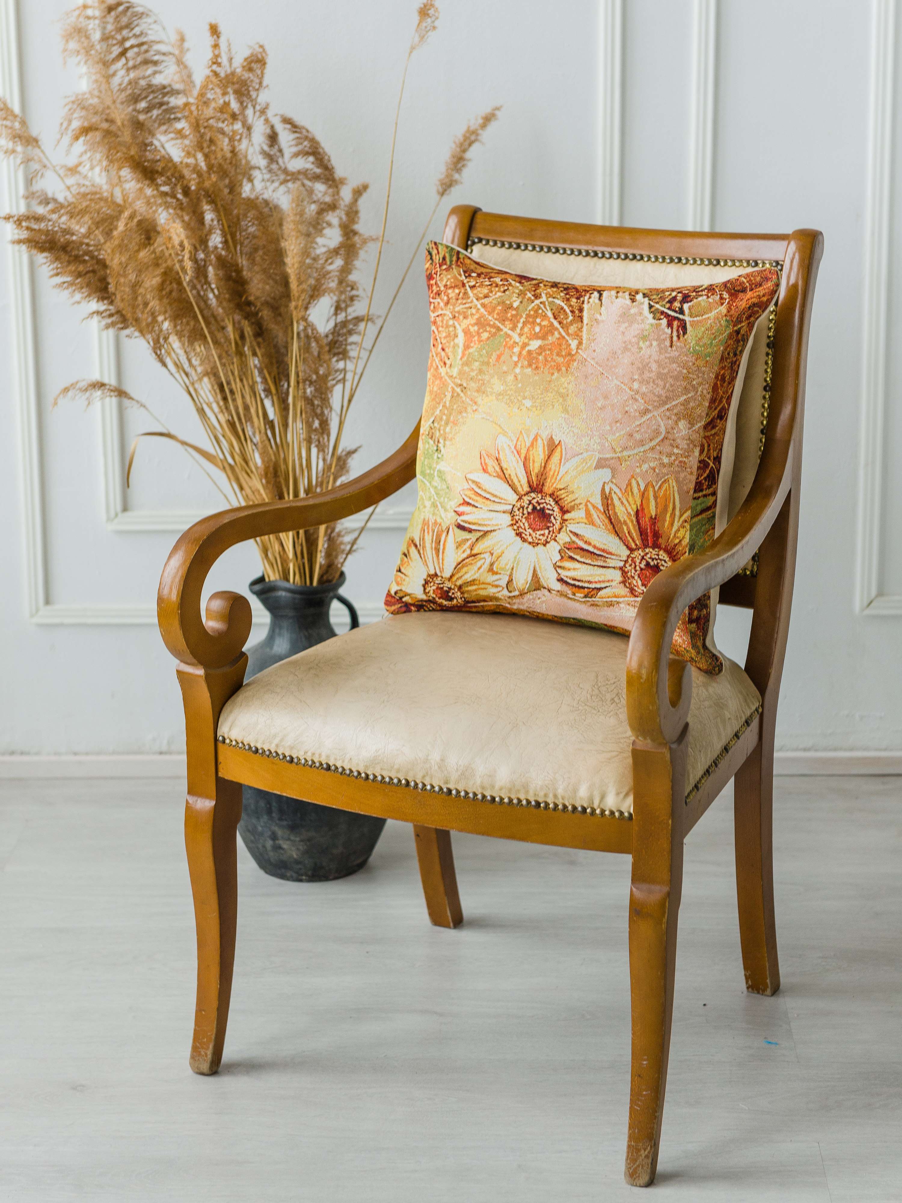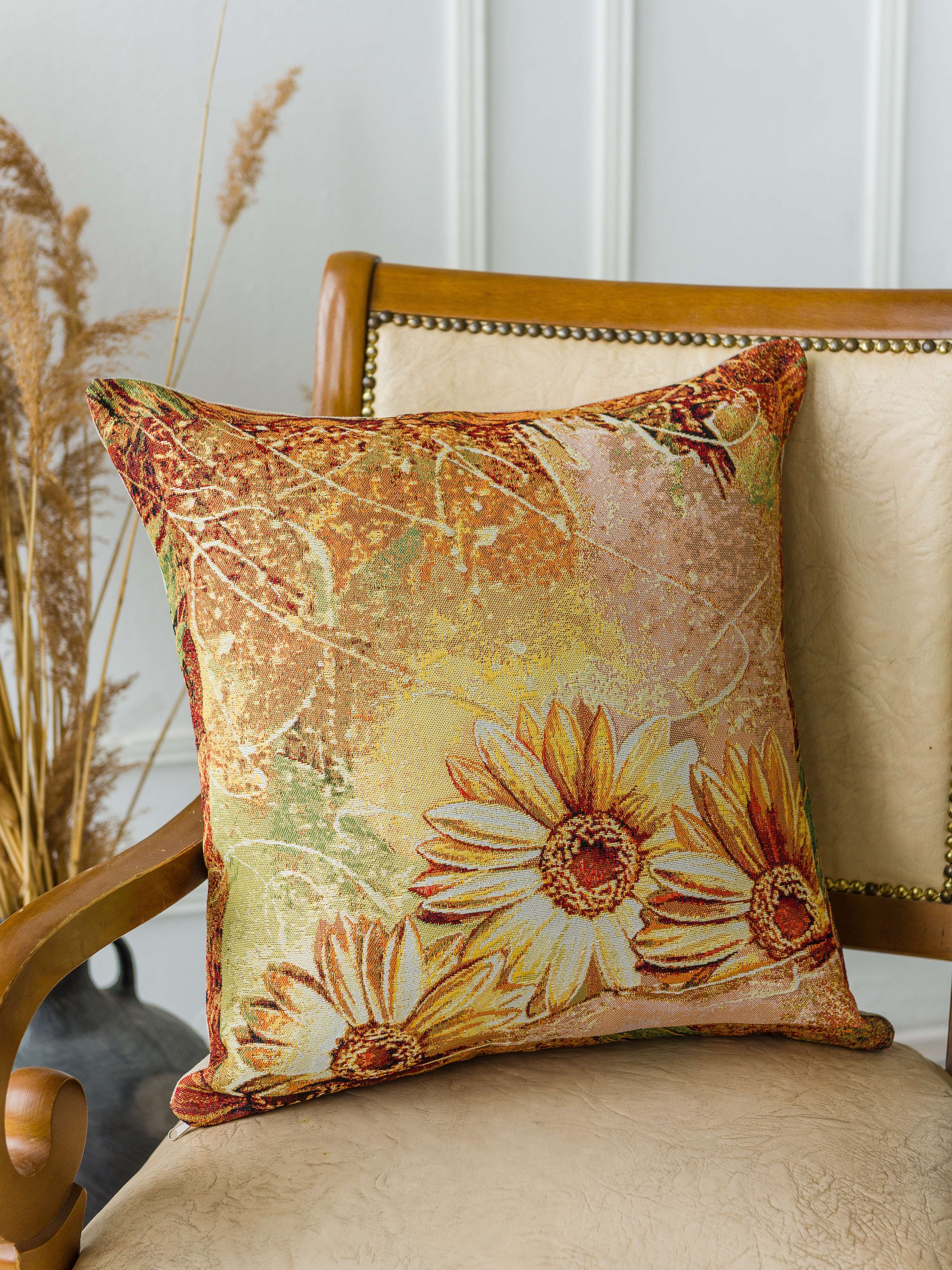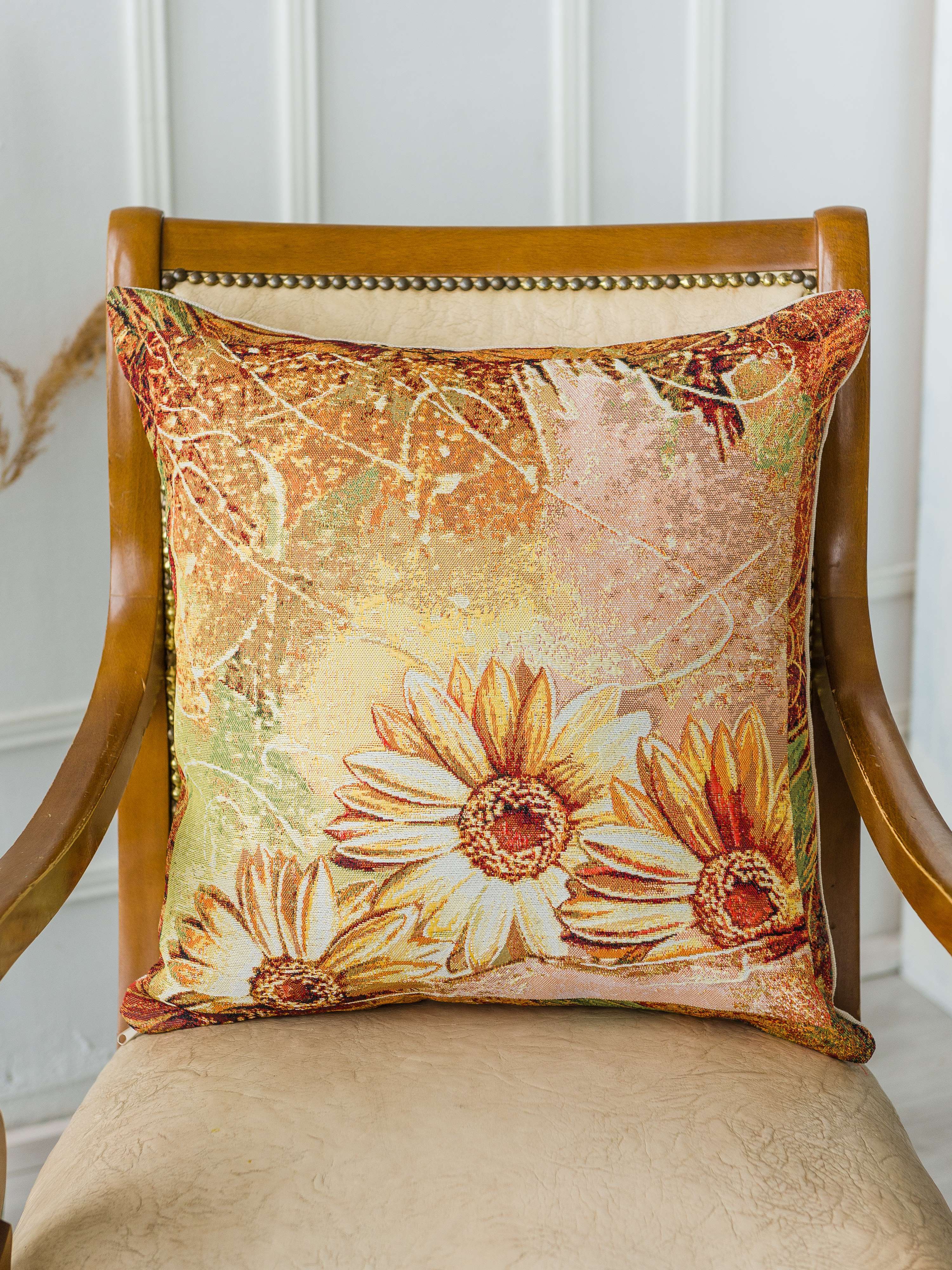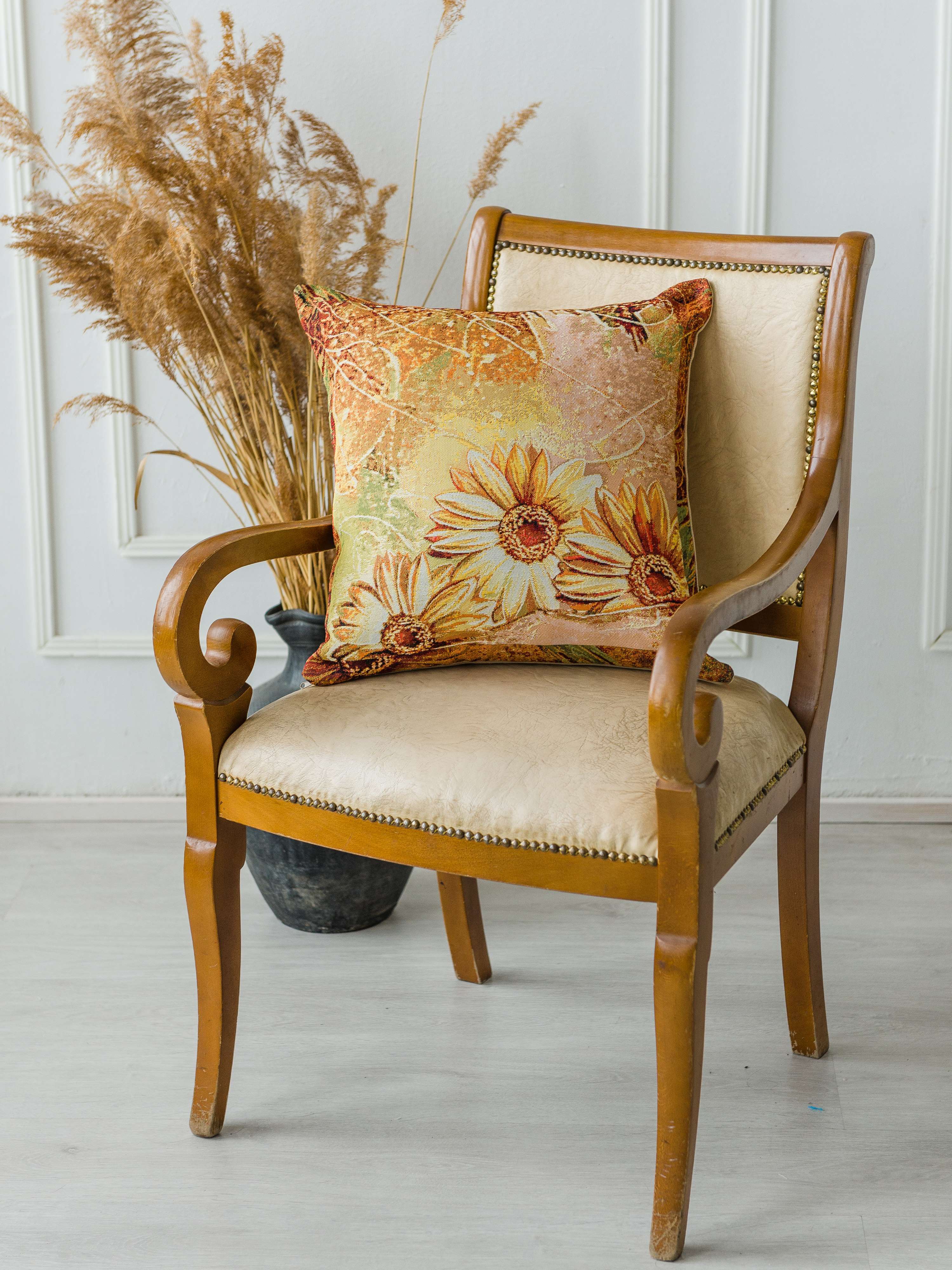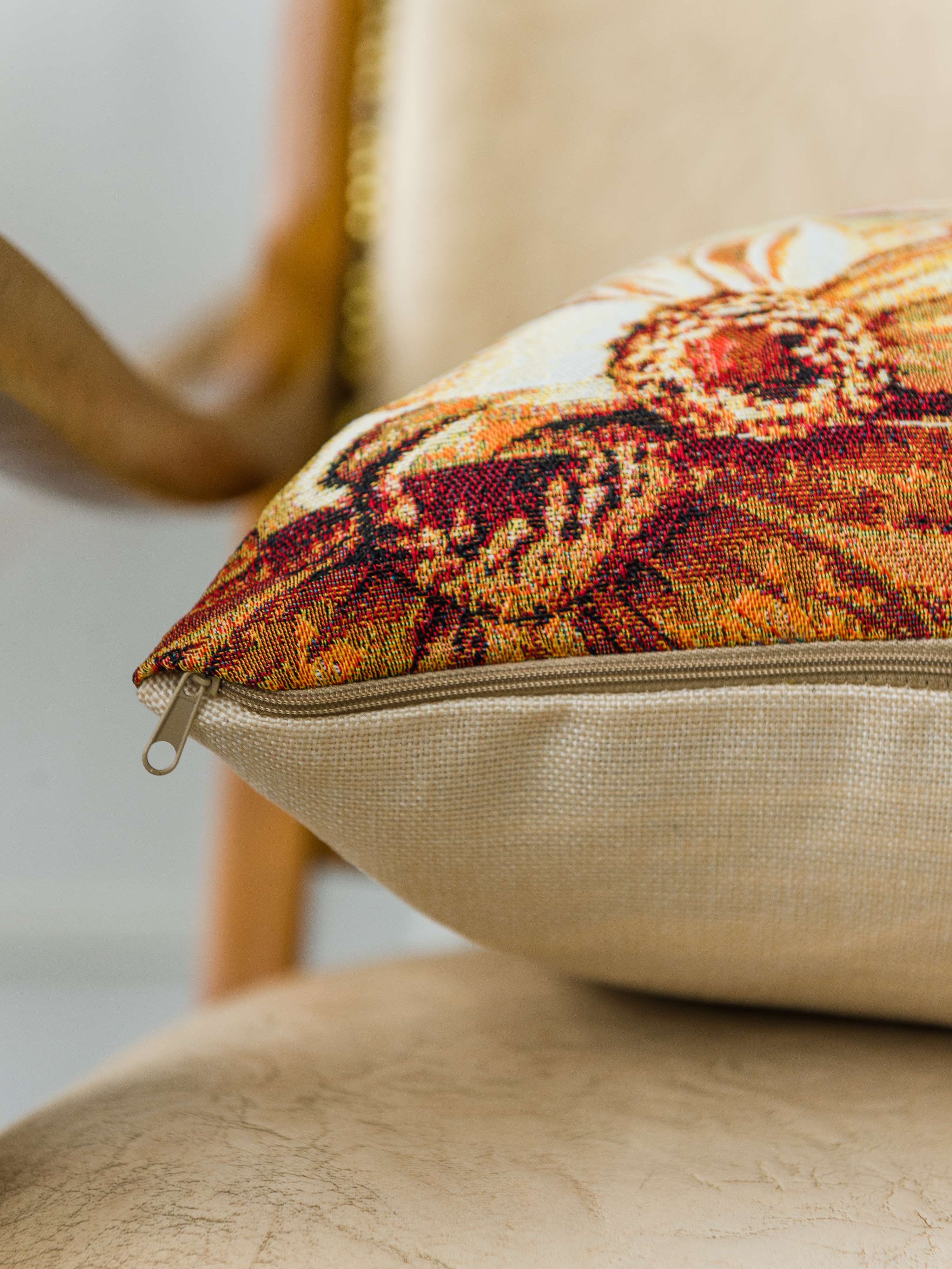 Гобеленовый чехол для декоративной подушки. Размер чехла: 47x47см. производство Россия. Изделие собственного производства сшито из отечественной жаккардовой ткани. Задняя часть выполнена из мебельной рогожки так же Российского производства. Все ткани используемые для производства декоративного чехла производятся с соблюдением ТУ и ГОСТ Р.Ф. Собственное швейное производство позволяет контролировать качество продукции на всех этапах до поступления на склад и предлагать покупателям товары высокого качества по выгодным ценам. Состав ткани 100% полиэстер. Плотность гобелена 380 г/кв.м. Чехол подходит для подушек размером от 45 до 50 см. Продается без подушки-наполнителя. Подушку-наполнитель так же можно купит у нас. Размер чехла может отличаться от заявленного +/- 2 см. Допускается деликатная машинная стирка при температуре 30 градусов. Гладить при средней температуре.