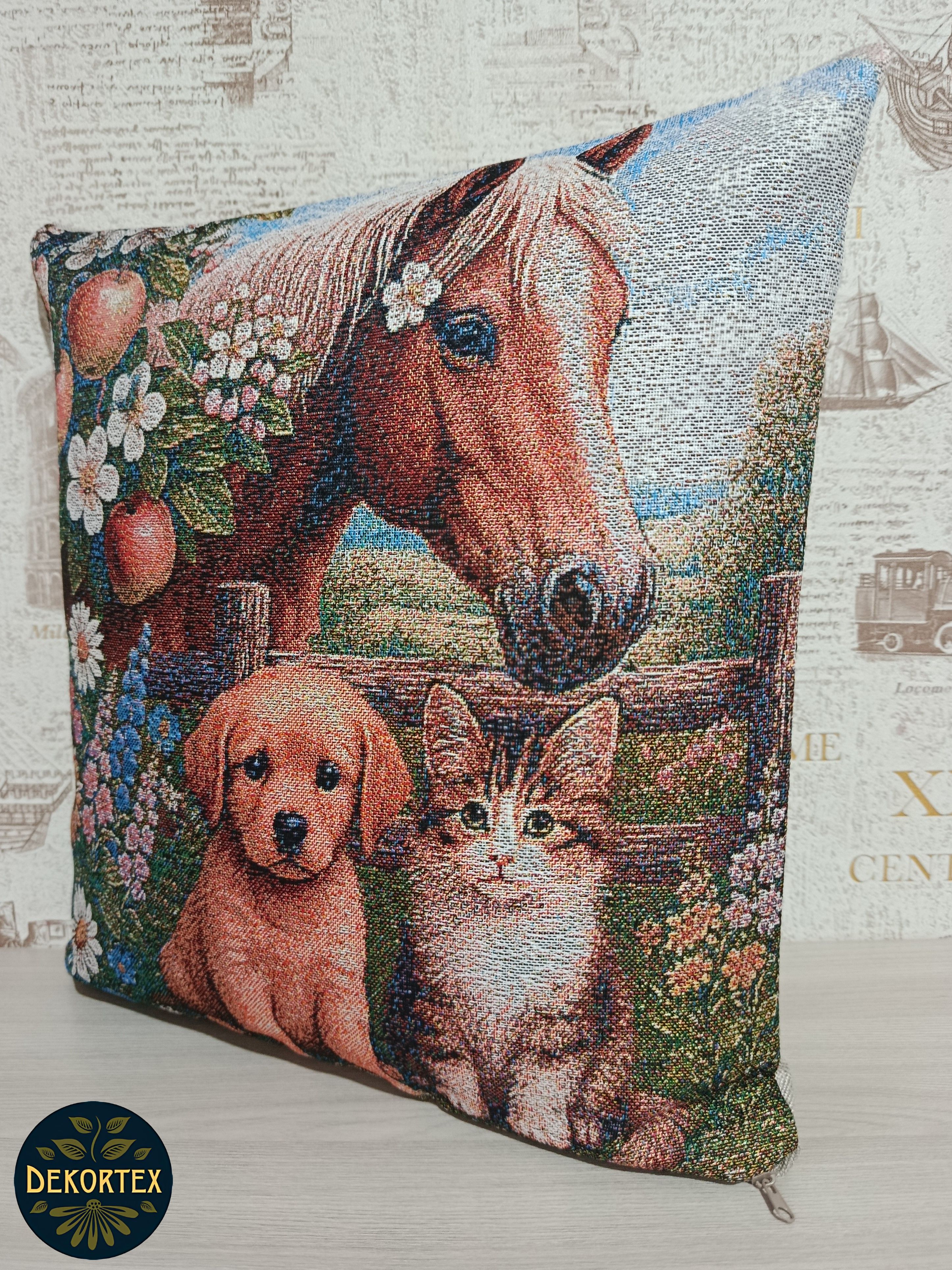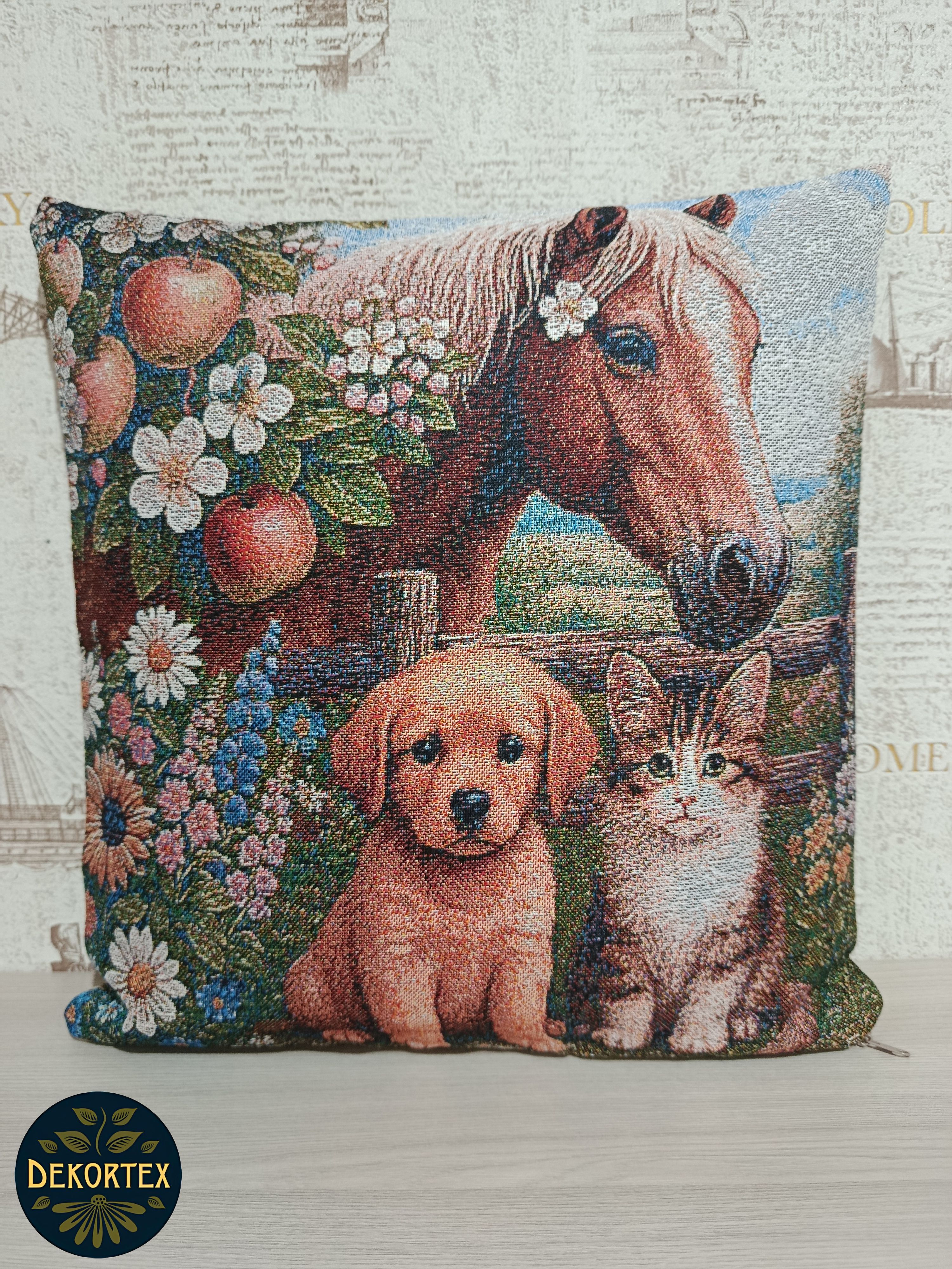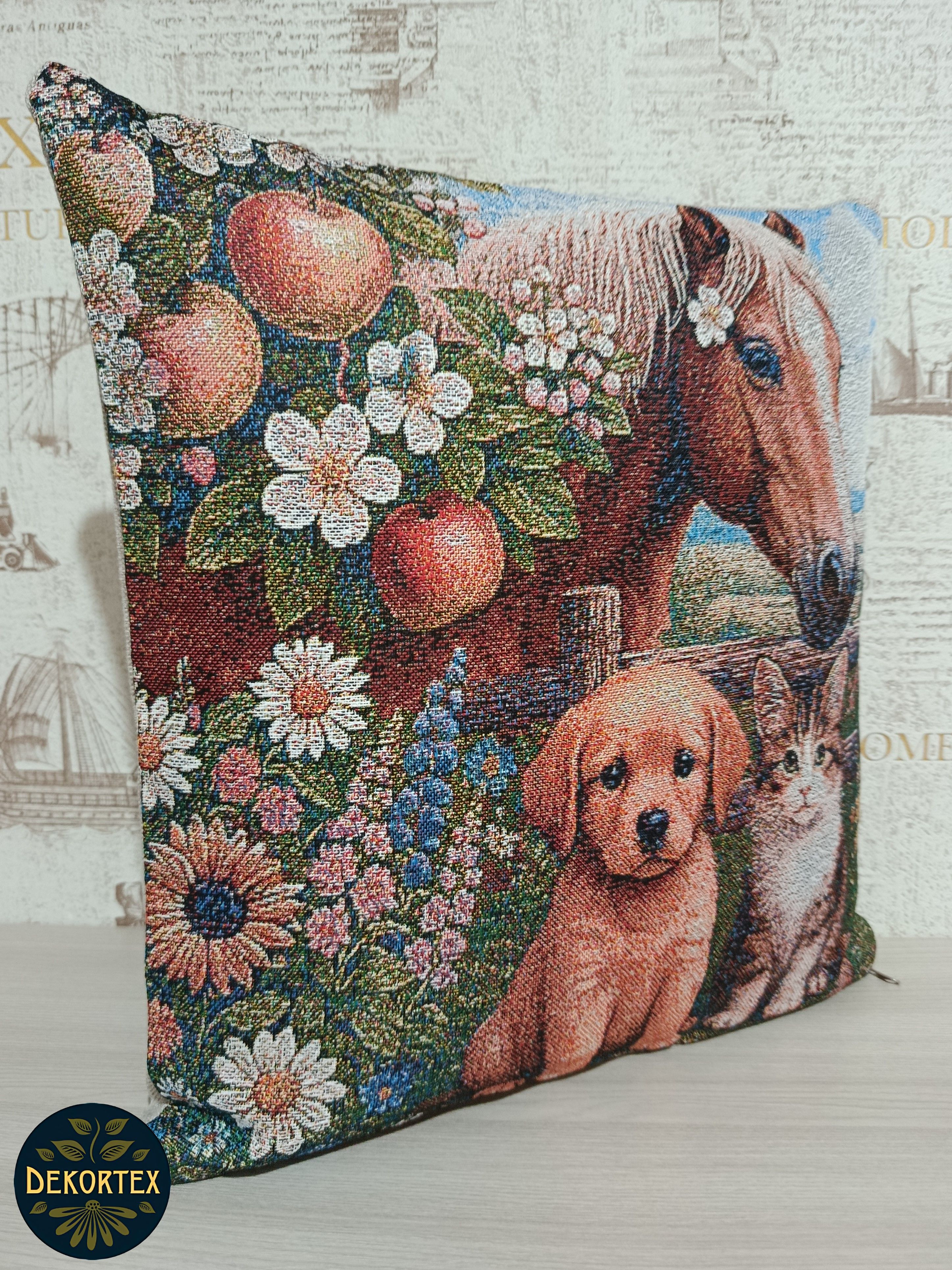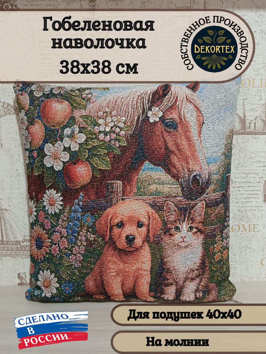 Гобеленовая наволочка для декоративной подушки. Размер наволочки: 38x38см. производство Россия. Изделие собственного производства сшито из отечественной жаккардовой ткани. Задняя часть выполнена из мебельной рогожки так же Российского производства. Все ткани используемые для производства декоративной наволочки производятся с соблюдением ТУ и ГОСТ РФ. Собственное швейное производство позволяет контролировать качество продукции на всех этапах до поступления на склад и предлагать покупателям товары высокого качества по выгодным ценам. Состав ткани 100% полиэстер с добавлением люрекса. Плотность гобелена 380 г/кв.м. Наволочка подходит для подушек размером 40х40 см. Продается без подушки-наполнителя. Подушку-наполнитель так же можно купит у нас. Размер наволочки может отличаться от заявленного +/- 2 см. Допускается деликатная машинная стирка при температуре 30 градусов. Гладить при средней температуре.