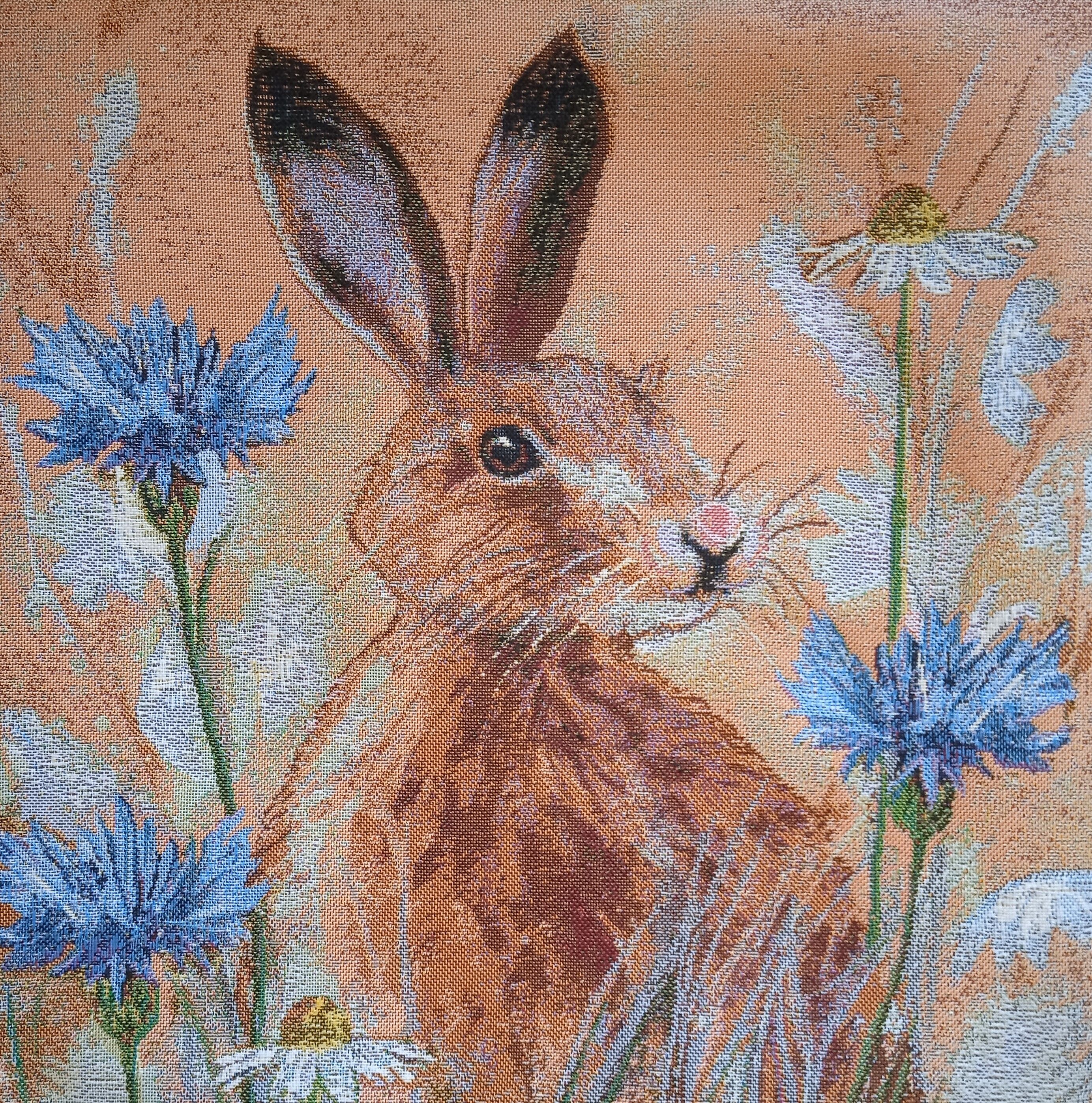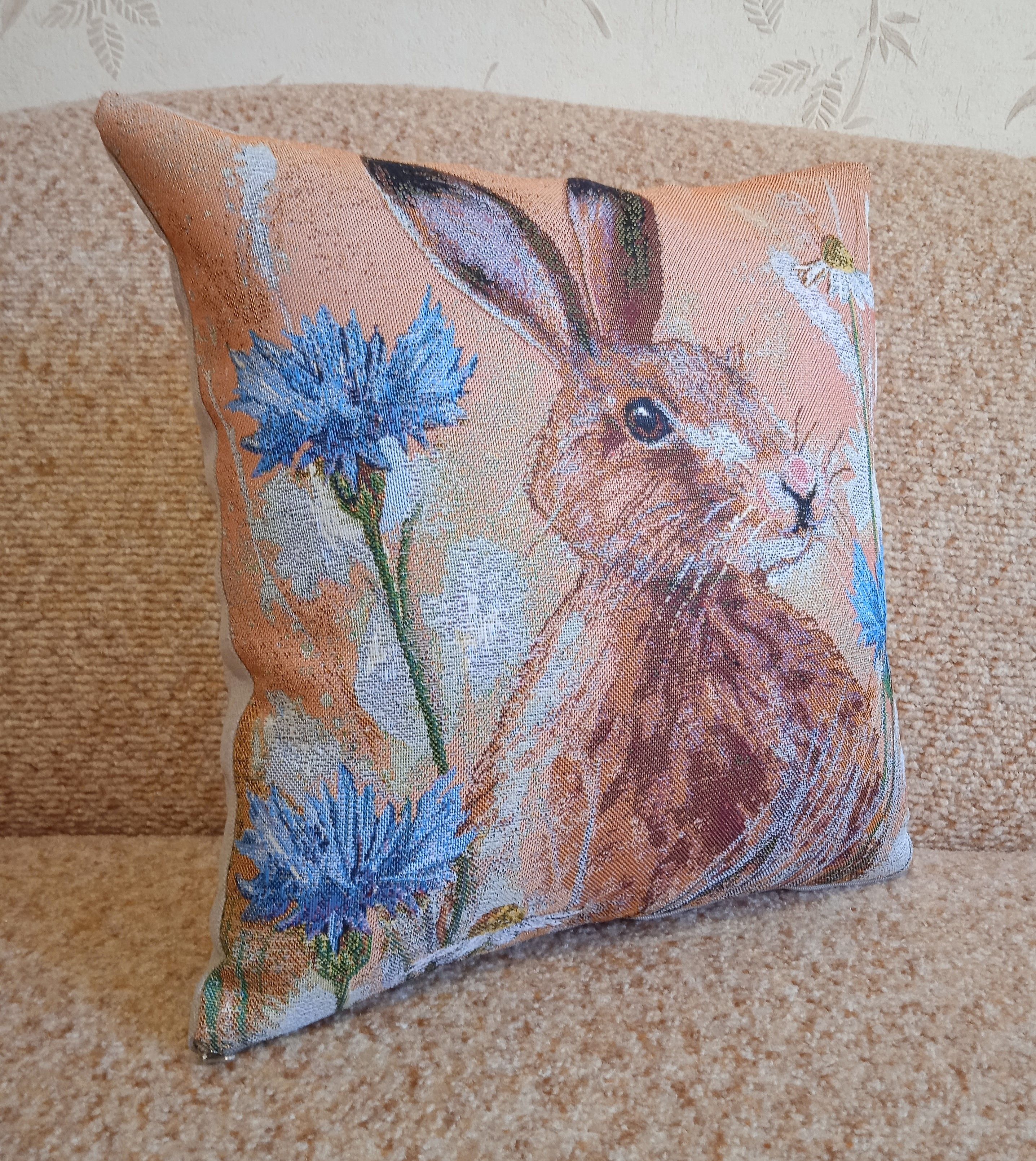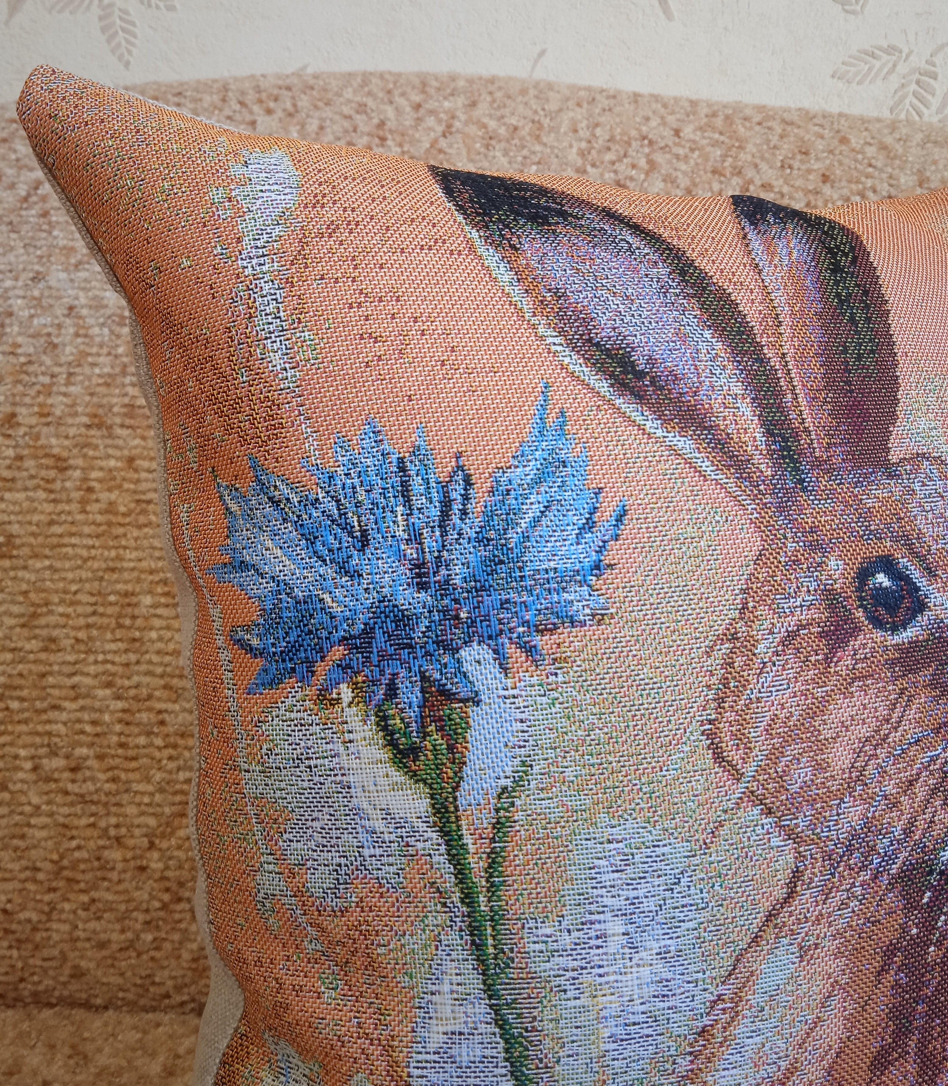 Гобеленовая декоративная наволочка с изображением зайчика на фоне цветов васильков подойдет для оформления домашнего интерьера в Новогодние праздники. Можно использовать для украшения гостиной, спальни, детской комнаты, кафе, отеля, гостиницы. Можно использовать как дополнительные подушки на диван, кресло, кровать, дачная лавка на веранде. Отличный подарок или сувенир для родных и близких, друзей, коллег по работе, маме, бабушке, теще, тете, сестре, сослуживцам на новый год, новоселье, день рождения, корпоративный подарок, 8 марта.