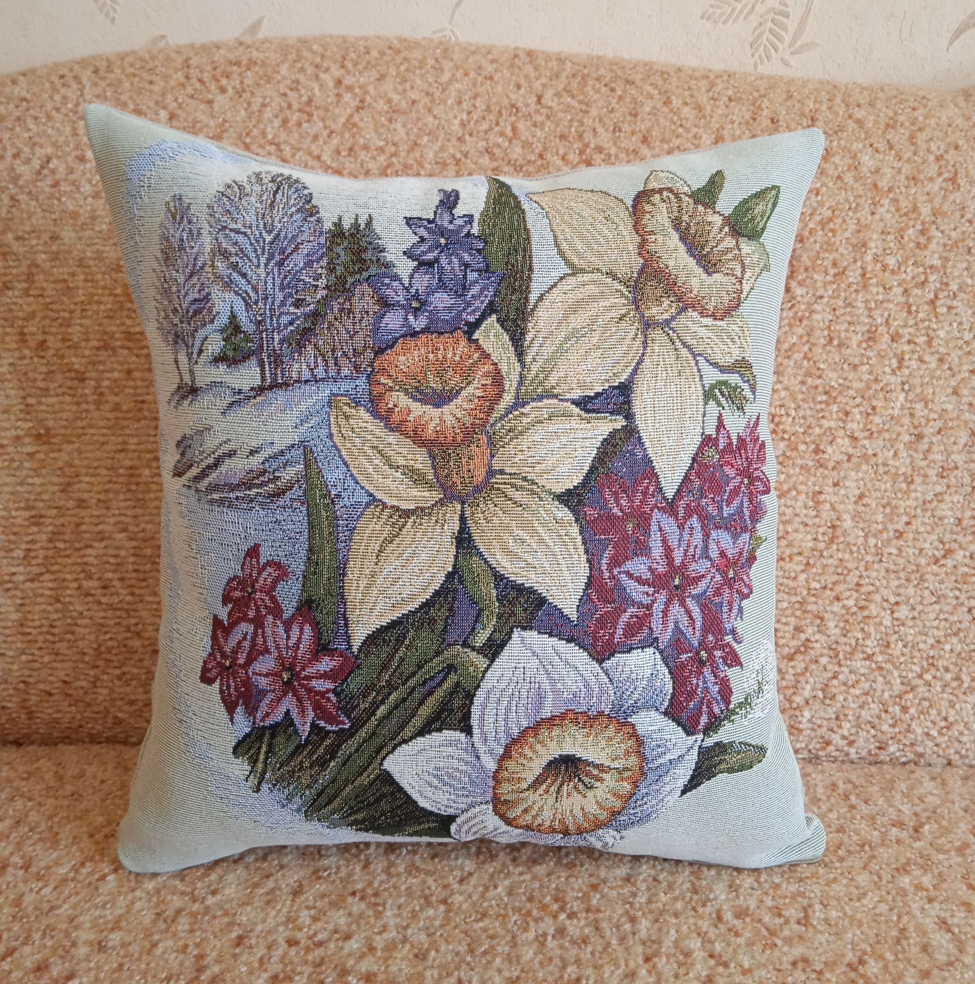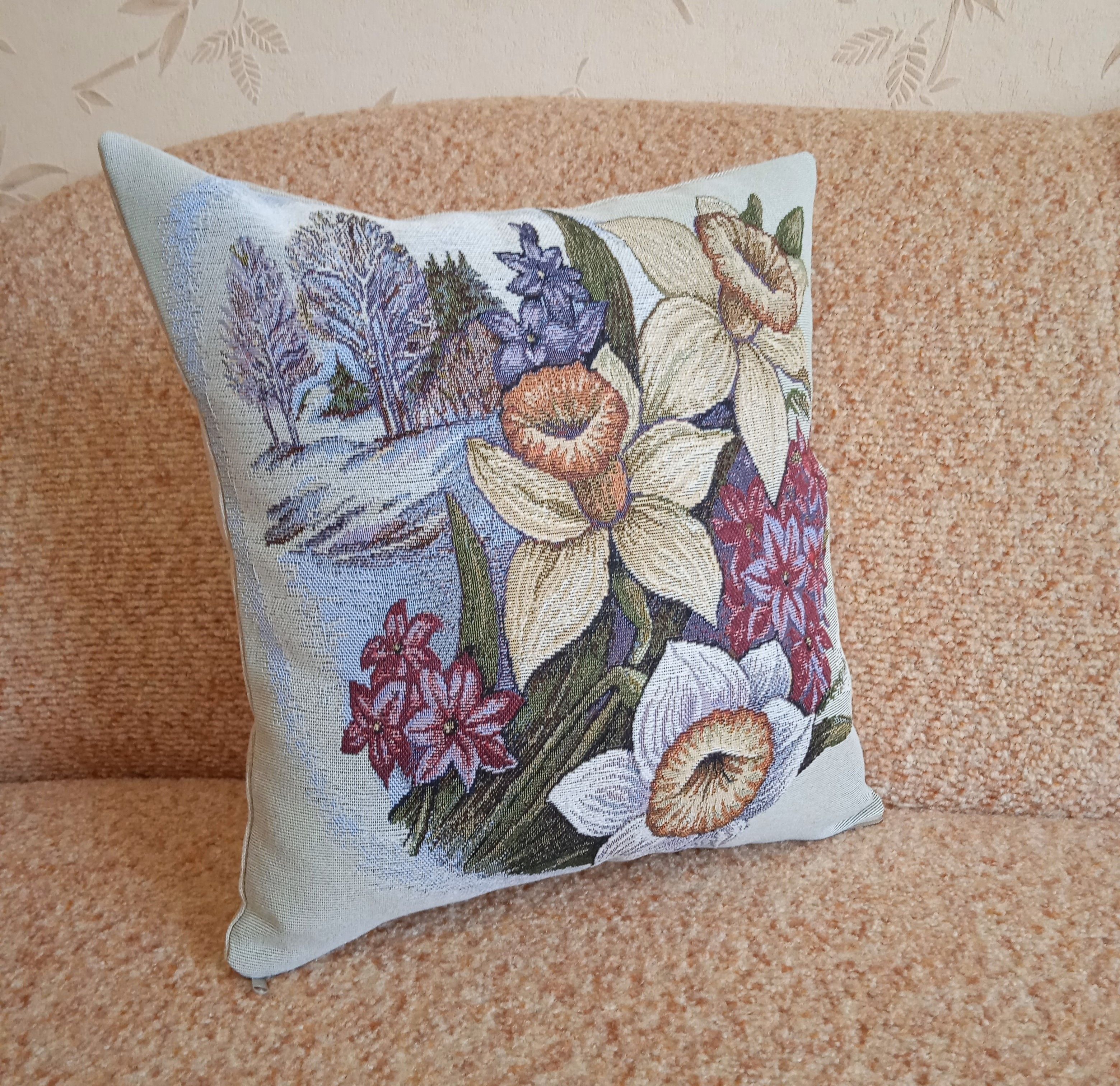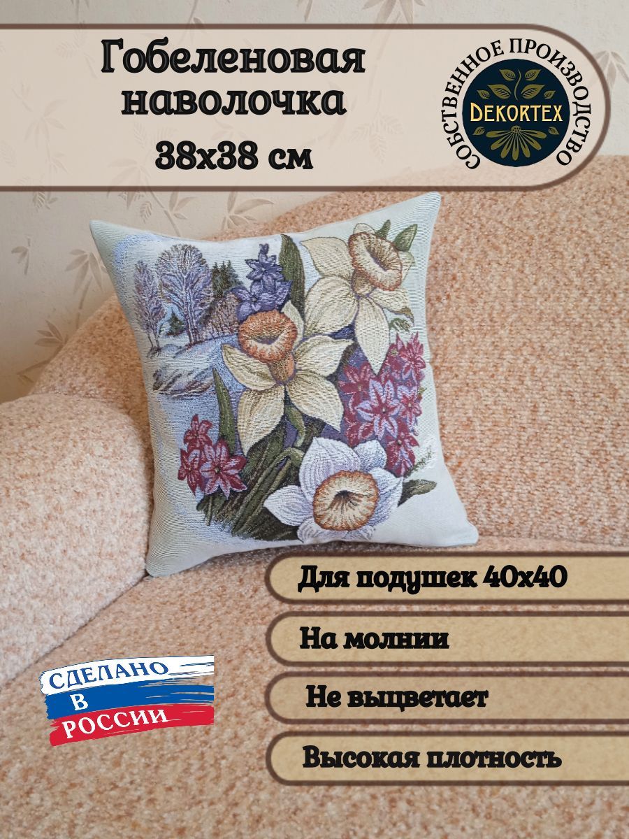 Гобеленовая наволочка для декоративной подушки с изображением весенних цветов. Размер наволочки: 38x38см. производство Россия. Изделие собственного производства сшито из отечественной жаккардовой ткани. Задняя часть выполнена из мебельной рогожки так же Российского производства. Все ткани используемые для производства декоративной наволочки производятся с соблюдением ТУ и ГОСТ РФ. Собственное швейное производство позволяет контролировать качество продукции на всех этапах до поступления на склад и предлагать покупателям товары высокого качества по выгодным ценам. Состав ткани 100% полиэстер. Плотность гобелена 380 г/кв.м. Наволочка подходит для подушек размером 40х40 см. Продается без подушки-наполнителя. Подушку-наполнитель так же можно купит у нас. Размер наволочки может отличаться от заявленного +/- 2 см. Допускается деликатная машинная стирка при температуре 30 градусов. Гладить при средней температуре.