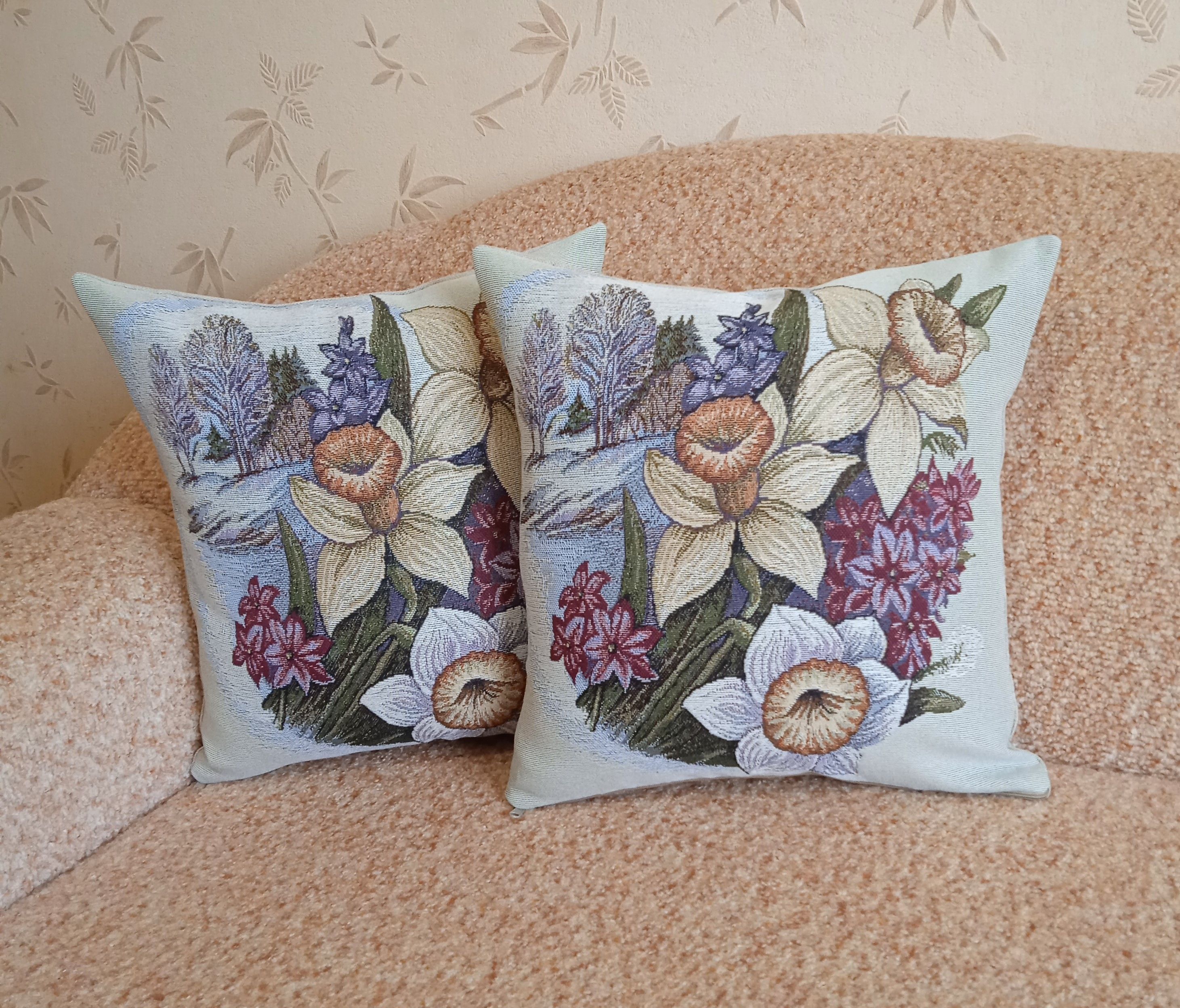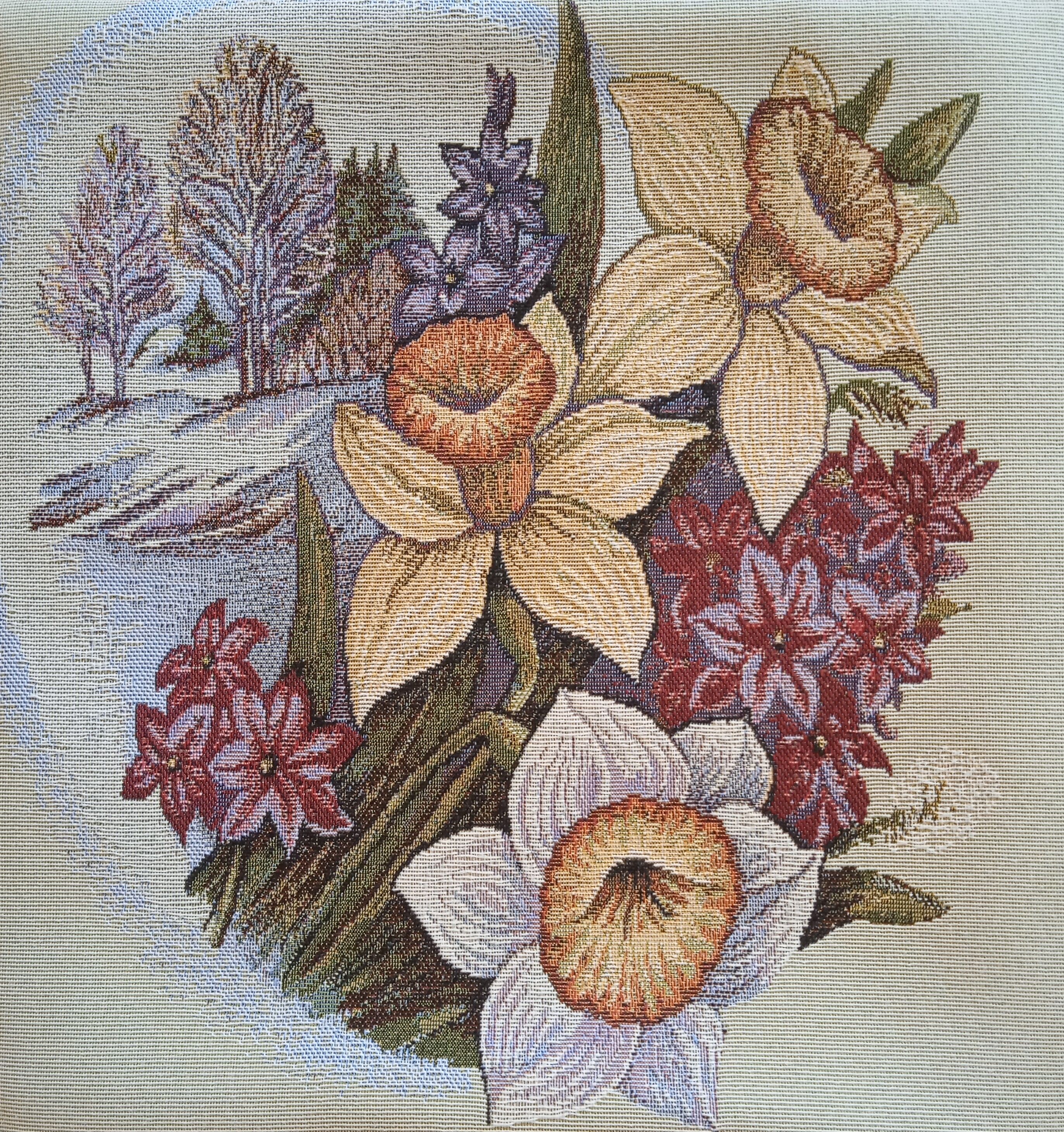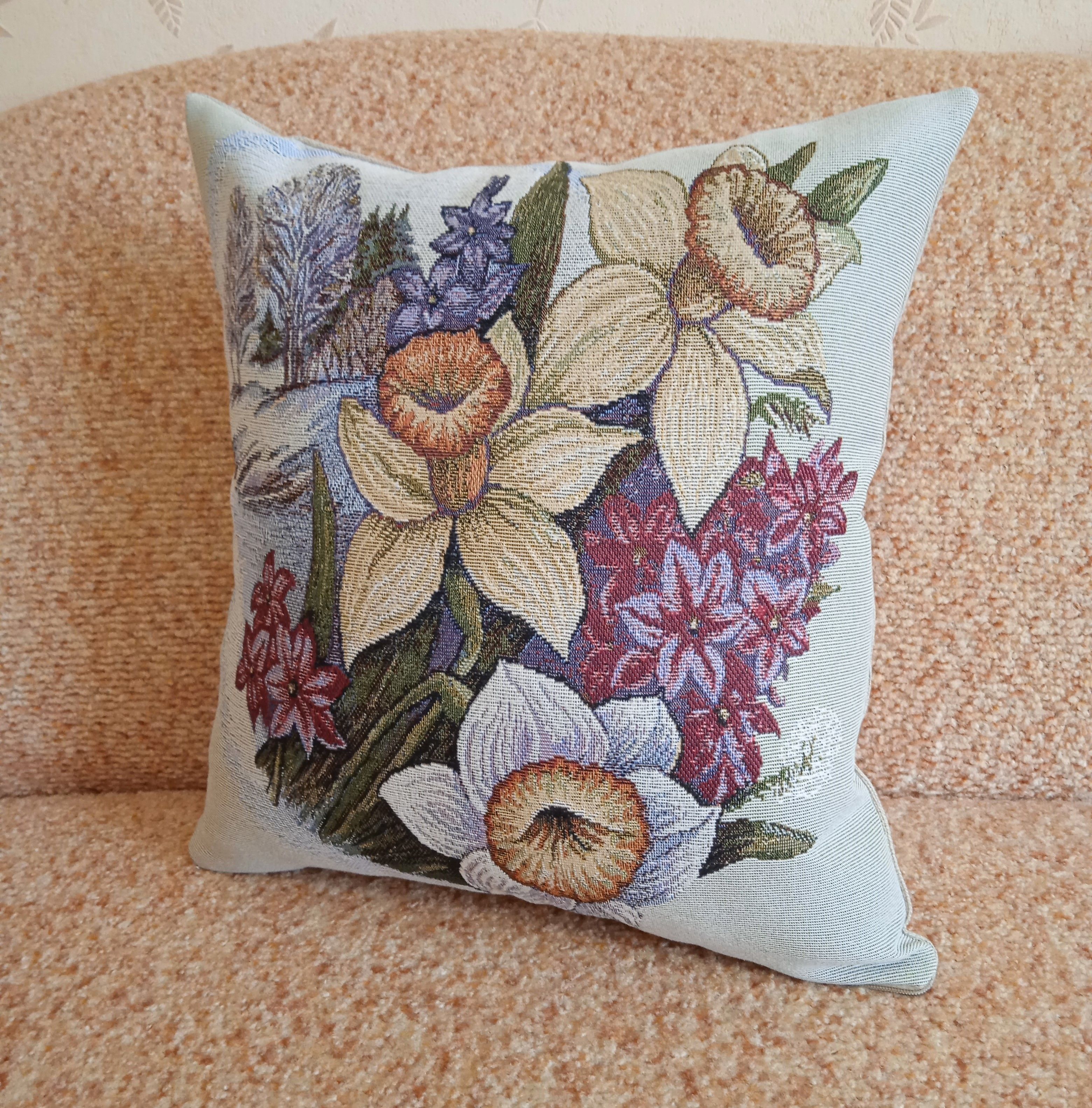 Гобеленовая наволочка для декоративной подушки с изображением весенних цветов. Размер наволочки: 38x38см. производство Россия. Изделие собственного производства сшито из отечественной жаккардовой ткани. Задняя часть выполнена из мебельной рогожки так же Российского производства. Все ткани используемые для производства декоративной наволочки производятся с соблюдением ТУ и ГОСТ РФ. Собственное швейное производство позволяет контролировать качество продукции на всех этапах до поступления на склад и предлагать покупателям товары высокого качества по выгодным ценам. Состав ткани 100% полиэстер. Плотность гобелена 380 г/кв.м. Наволочка подходит для подушек размером 40х40 см. Продается без подушки-наполнителя. Подушку-наполнитель так же можно купит у нас. Размер наволочки может отличаться от заявленного +/- 2 см. Допускается деликатная машинная стирка при температуре 30 градусов. Гладить при средней температуре.