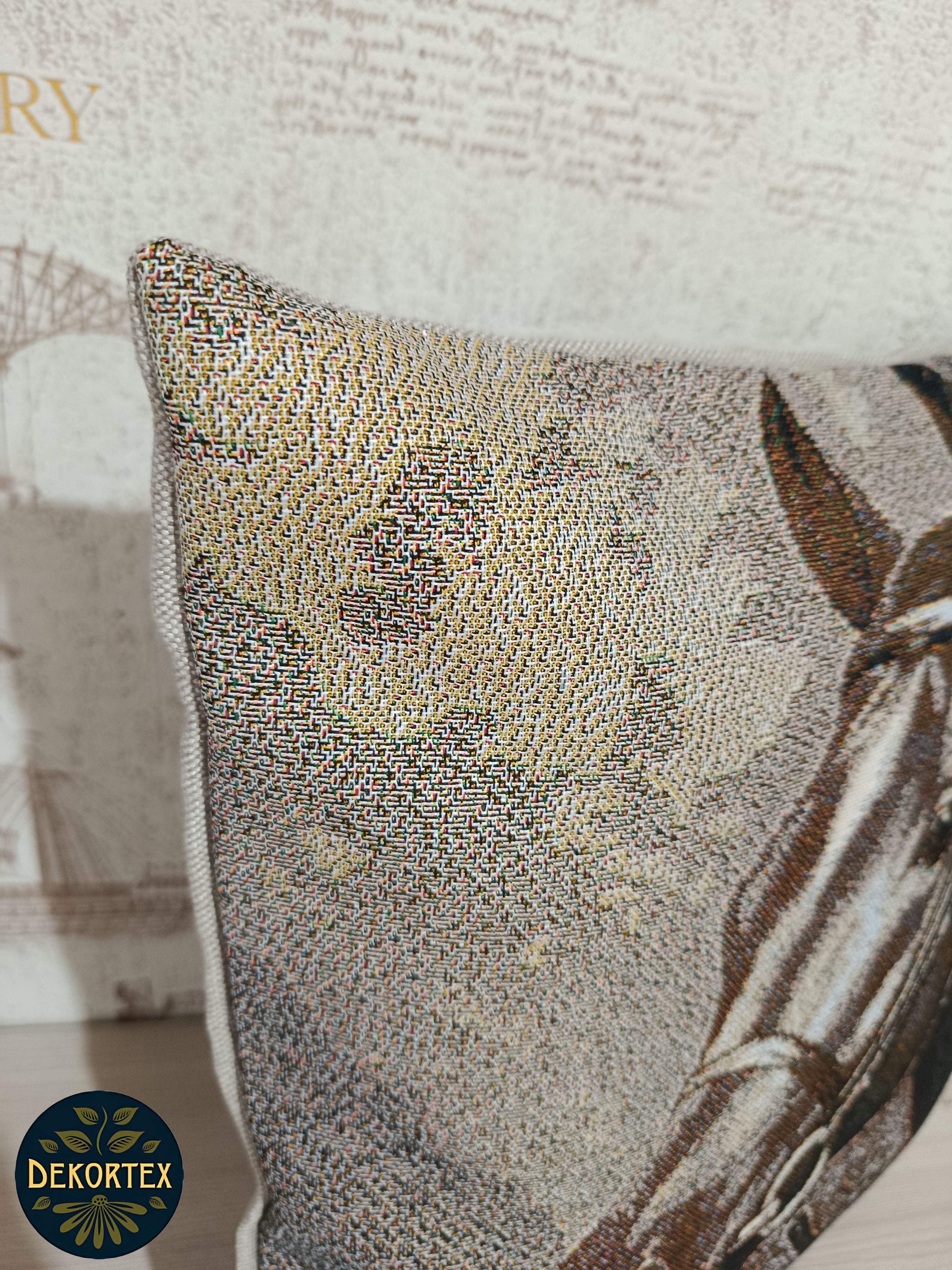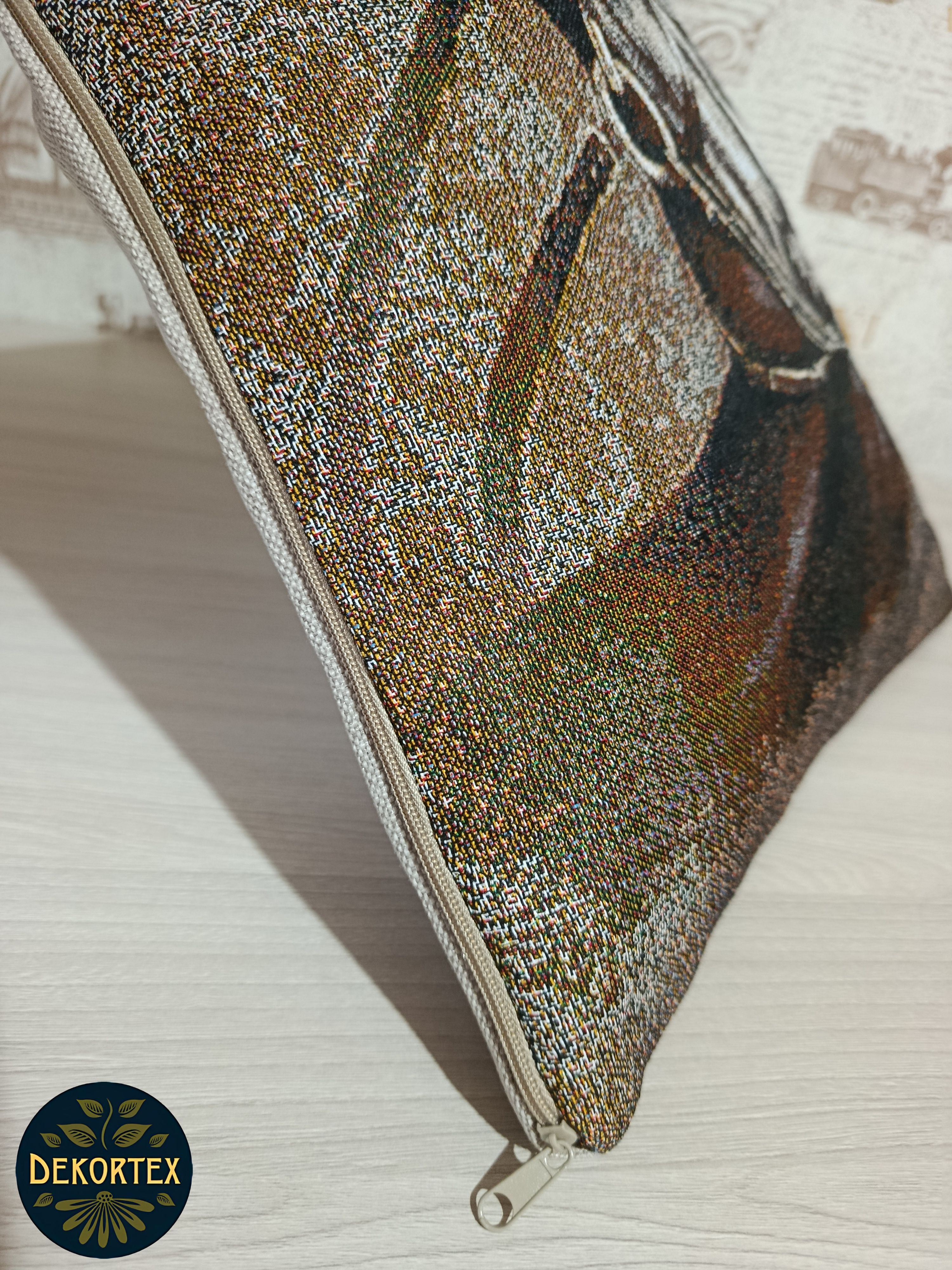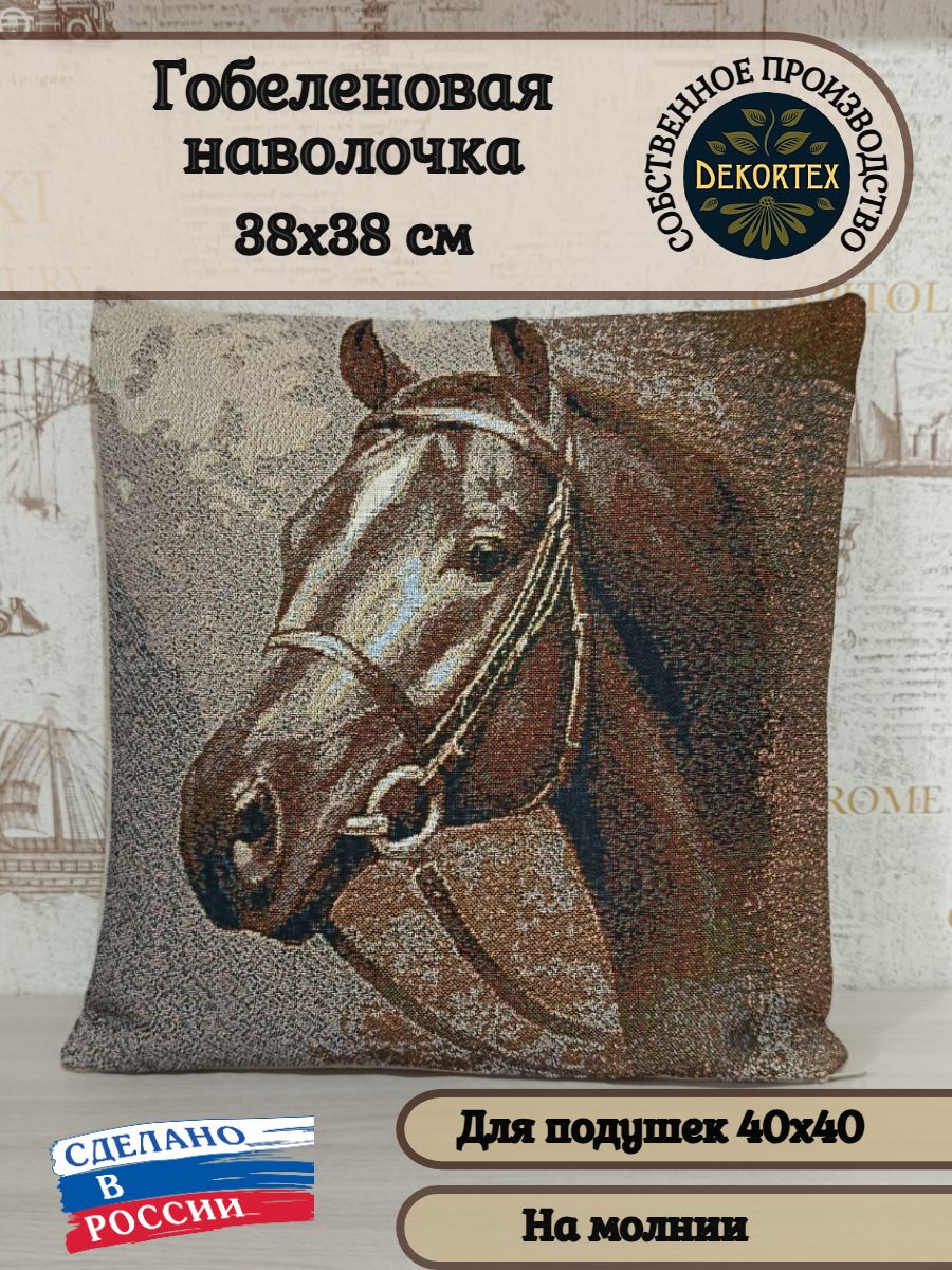 Гобеленовая наволочка для декоративной подушки. Размер наволочки: 38x38см. производство Россия. Изделие собственного производства сшито из отечественной жаккардовой ткани. Задняя часть выполнена из мебельной рогожки так же Российского производства. Все ткани используемые для производства декоративной наволочки производятся с соблюдением ТУ и ГОСТ РФ. Собственное швейное производство позволяет контролировать качество продукции на всех этапах до поступления на склад и предлагать покупателям товары высокого качества по выгодным ценам. Состав ткани 100% полиэстер с добавлением люрекса. Плотность гобелена 380 г/кв.м. Наволочка подходит для подушек размером 40х40 см. Продается без подушки-наполнителя. Подушку-наполнитель так же можно купит у нас. Размер наволочки может отличаться от заявленного +/- 2 см. Допускается деликатная машинная стирка при температуре 30 градусов. Гладить при средней температуре.