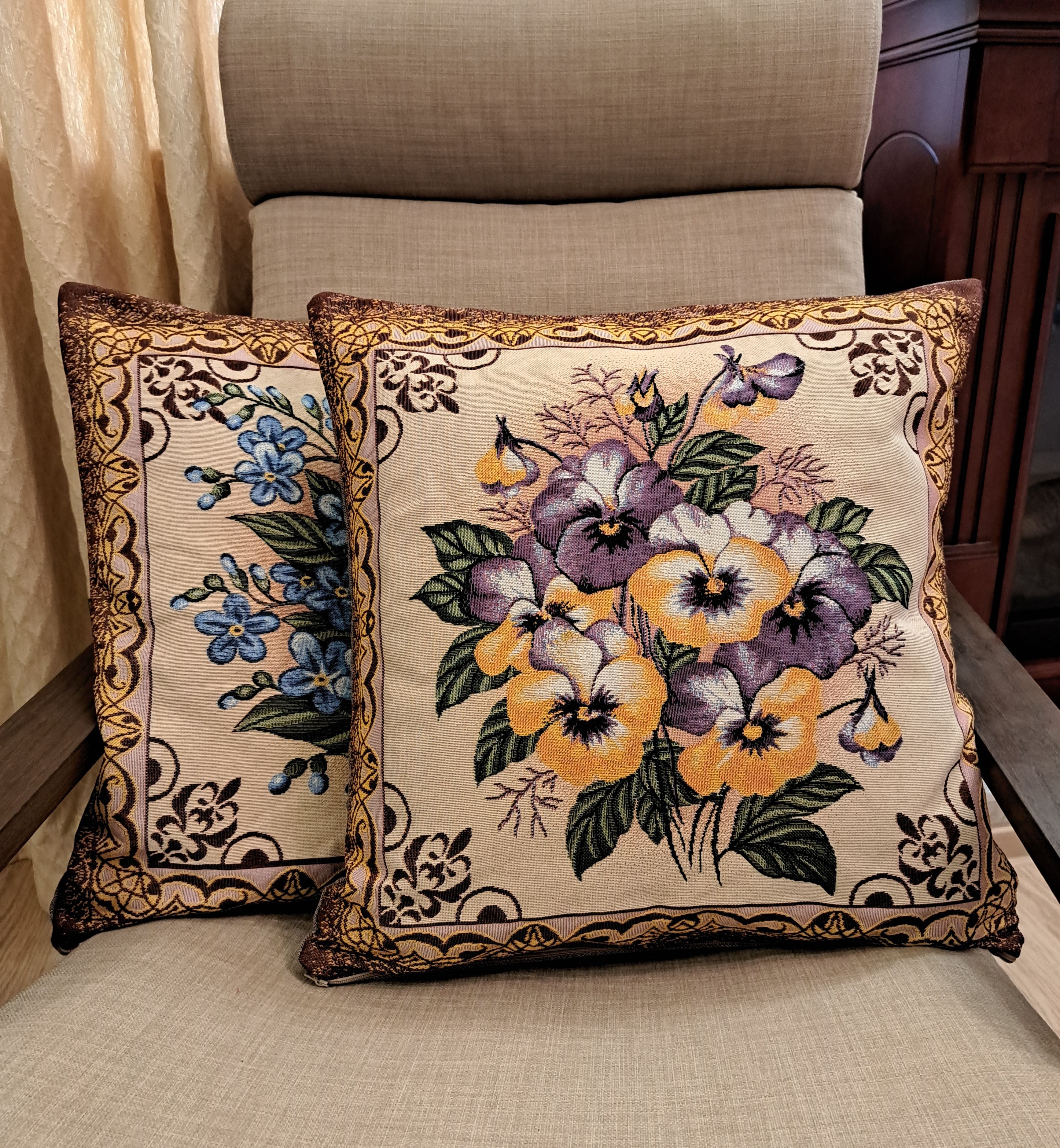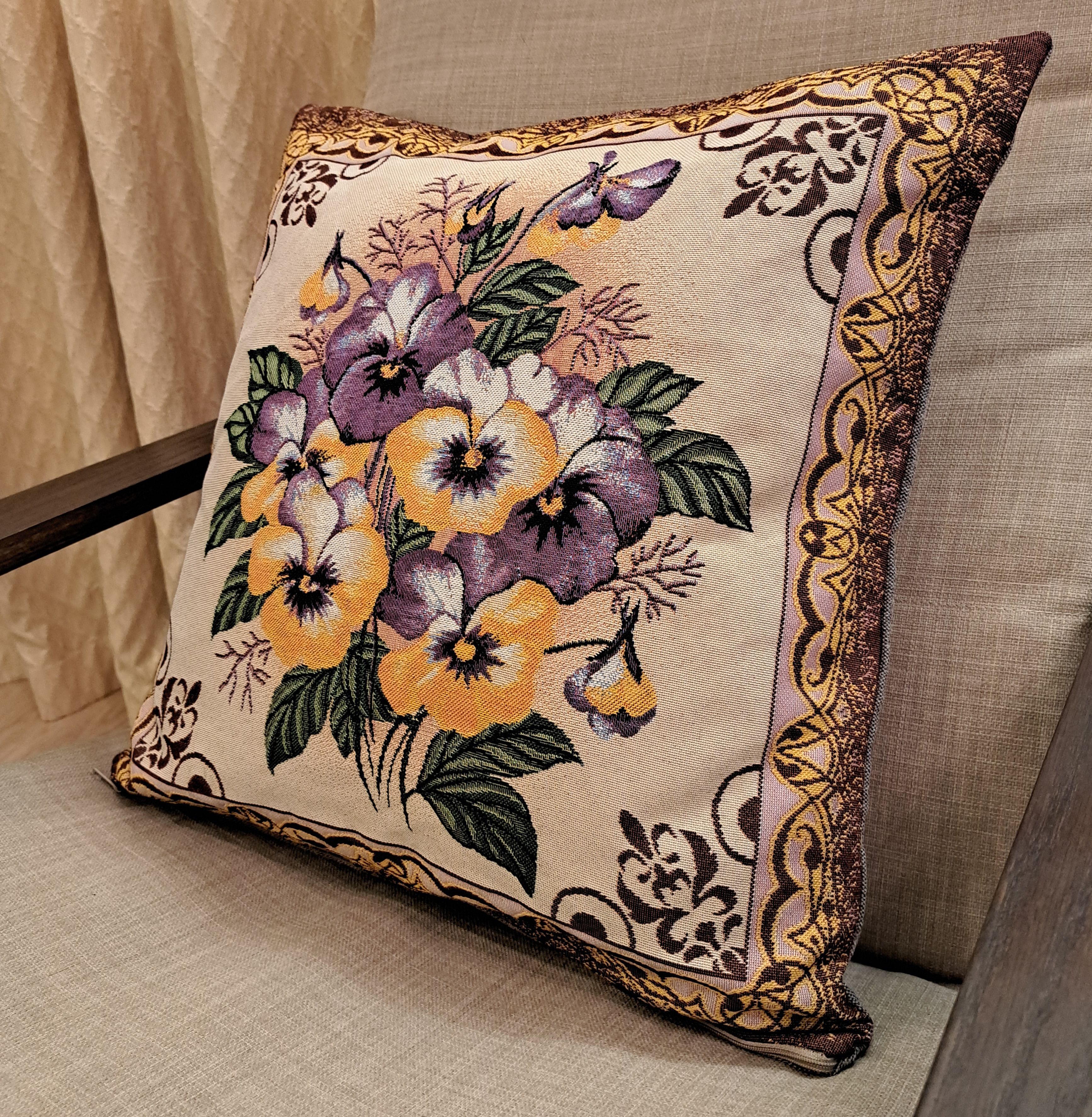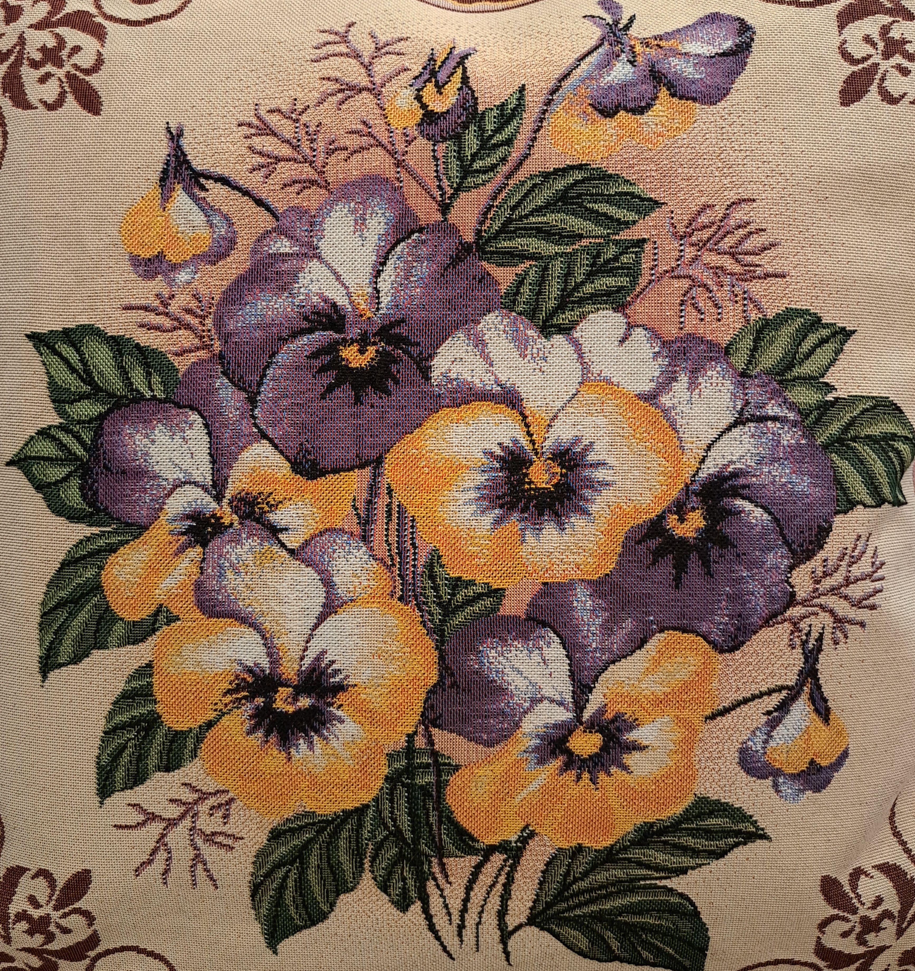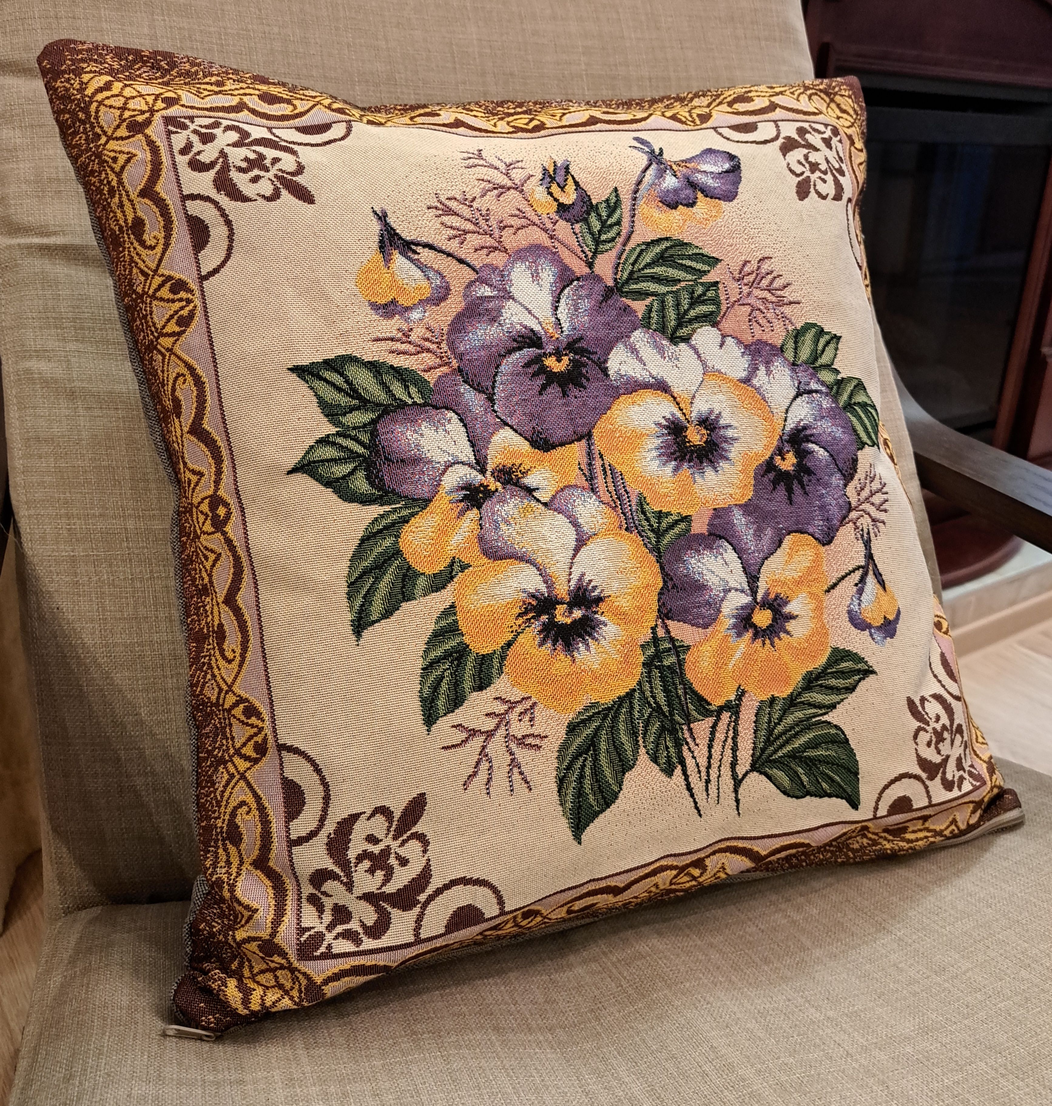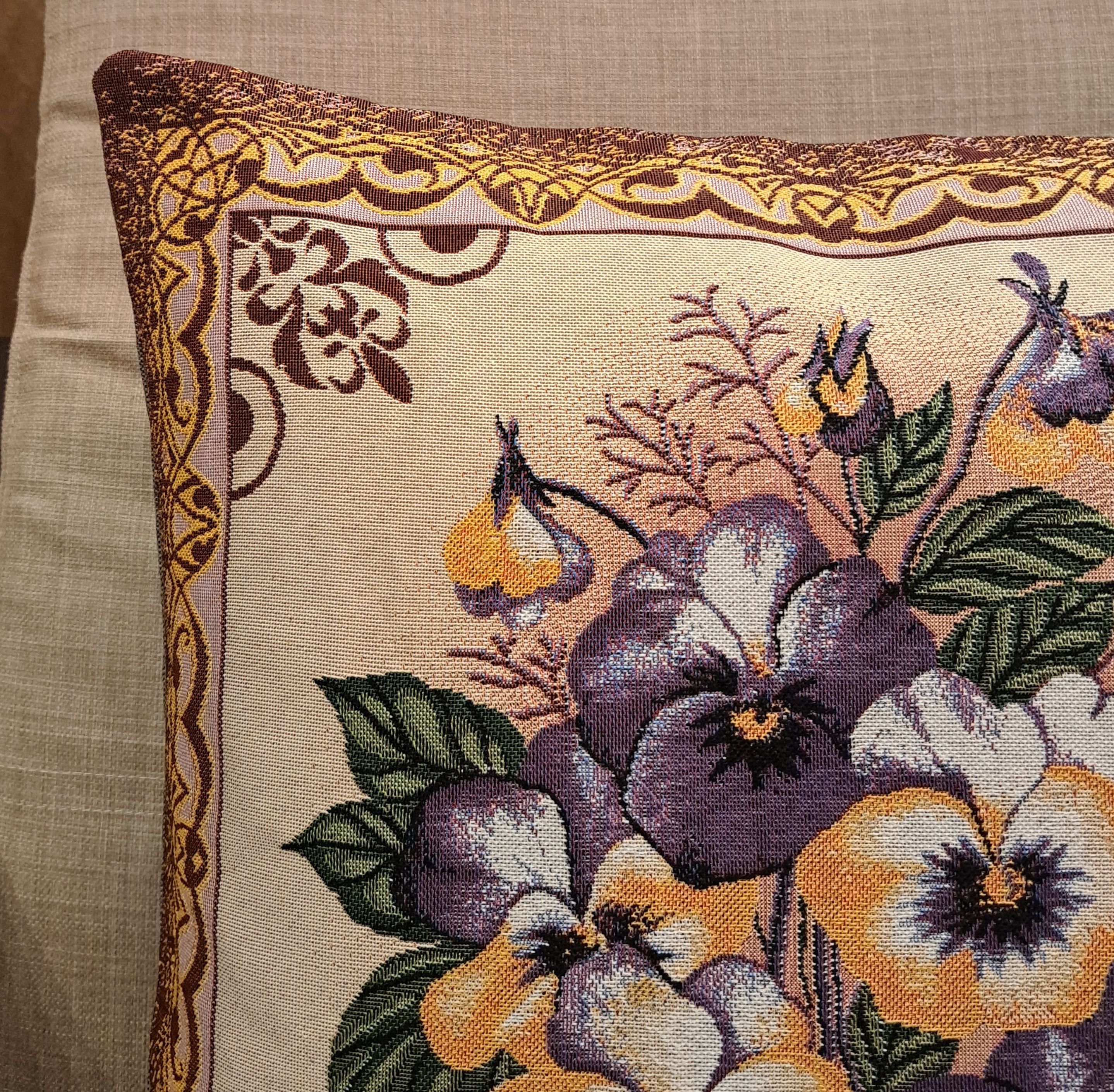 Гобеленовая декоративная наволочка с изображением цветов, желтых и синих виол подойдет для оформления домашнего интерьера в Новогодние праздники. Можно использовать для украшения гостиной, спальни, детской комнаты, кафе, отеля, гостиницы. Можно использовать как дополнительные подушки на диван, кресло, кровать, дачная лавка на веранде. Отличный подарок или сувенир для родных и близких, друзей, коллег по работе, маме, бабушке, теще, тете, сестре, сослуживцам на новый год, новоселье, день рождения, корпоративный подарок, 8 марта.