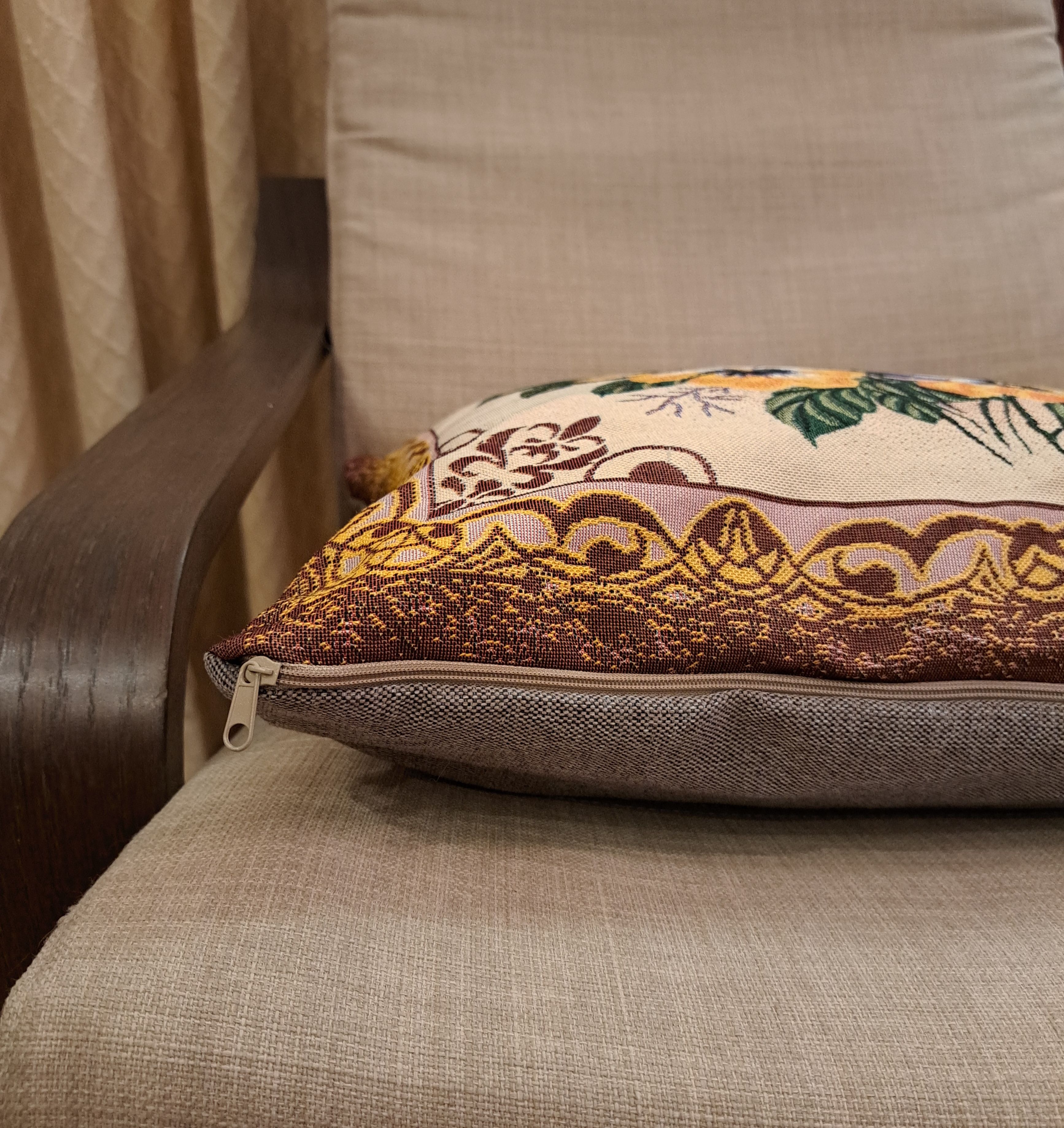 Гобеленовая наволочка для декоративной подушки. Размер наволочки: 47x47см. производство Россия. Изделие собственного производства сшито из отечественной жаккардовой ткани. Задняя часть выполнена из мебельной рогожки так же Российского производства. Все ткани используемые для производства декоративной наволочки производятся с соблюдением ТУ и ГОСТ РФ. Собственное швейное производство позволяет контролировать качество продукции на всех этапах до поступления на склад и предлагать покупателям товары высокого качества по выгодным ценам. Состав ткани 100% полиэстер. Плотность гобелена 380 г/кв.м. Наволочка подходит для подушек размером 50х50 см. Продается без подушки-наполнителя. Подушку-наполнитель так же можно купит у нас. Размер наволочки может отличаться от заявленного +/- 2 см. Допускается деликатная машинная стирка при температуре 30 градусов. Гладить при средней температуре.