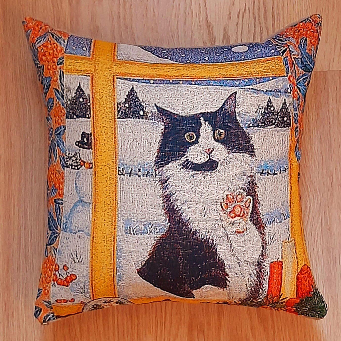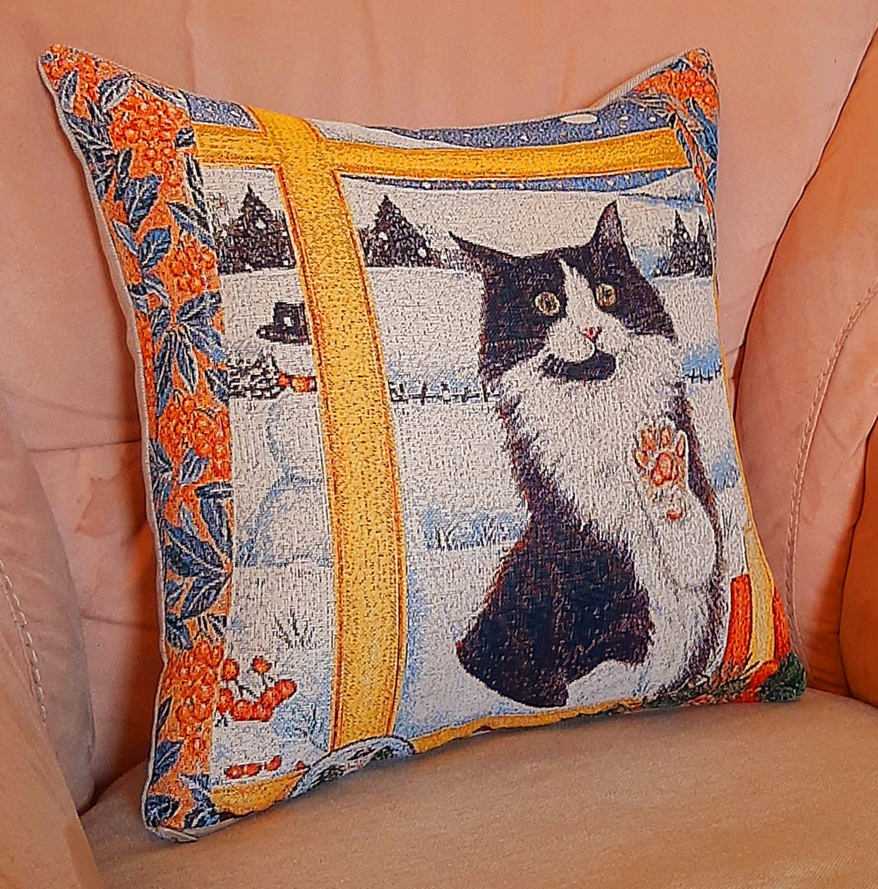 Гобеленовый чехол для декоративной подушки. Размер чехла: 38x38см. производство Россия. Изделие собственного производства сшито из отечественной жаккардовой ткани. Задняя часть выполнена из мебельной рогожки так же Российского производства. Все ткани используемые для производства декоративного чехла производятся с соблюдением ТУ и ГОСТ Р.Ф. Собственное швейное производство позволяет контролировать качество продукции на всех этапах до поступления на склад, и предлагать покупателям товары высокого качества по выгодным ценам. Состав ткани 100% полиэстер. Плотность гобелена 380 г/кв.м. Чехол подходит для подушек размером от 36 до 40 см. Продается без подушки-наполнителя. Подушку-наполнитель так же можно купит у нас. Размер чехла может отличаться от заявленного +/- 2 см. Допускается деликатная машинная стирка при температуре 30 градусов. Гладить при средней температуре.