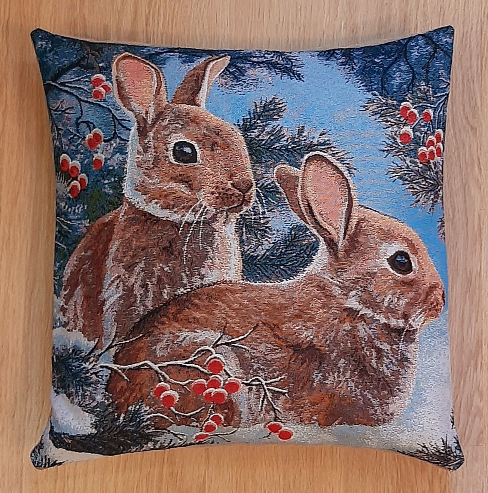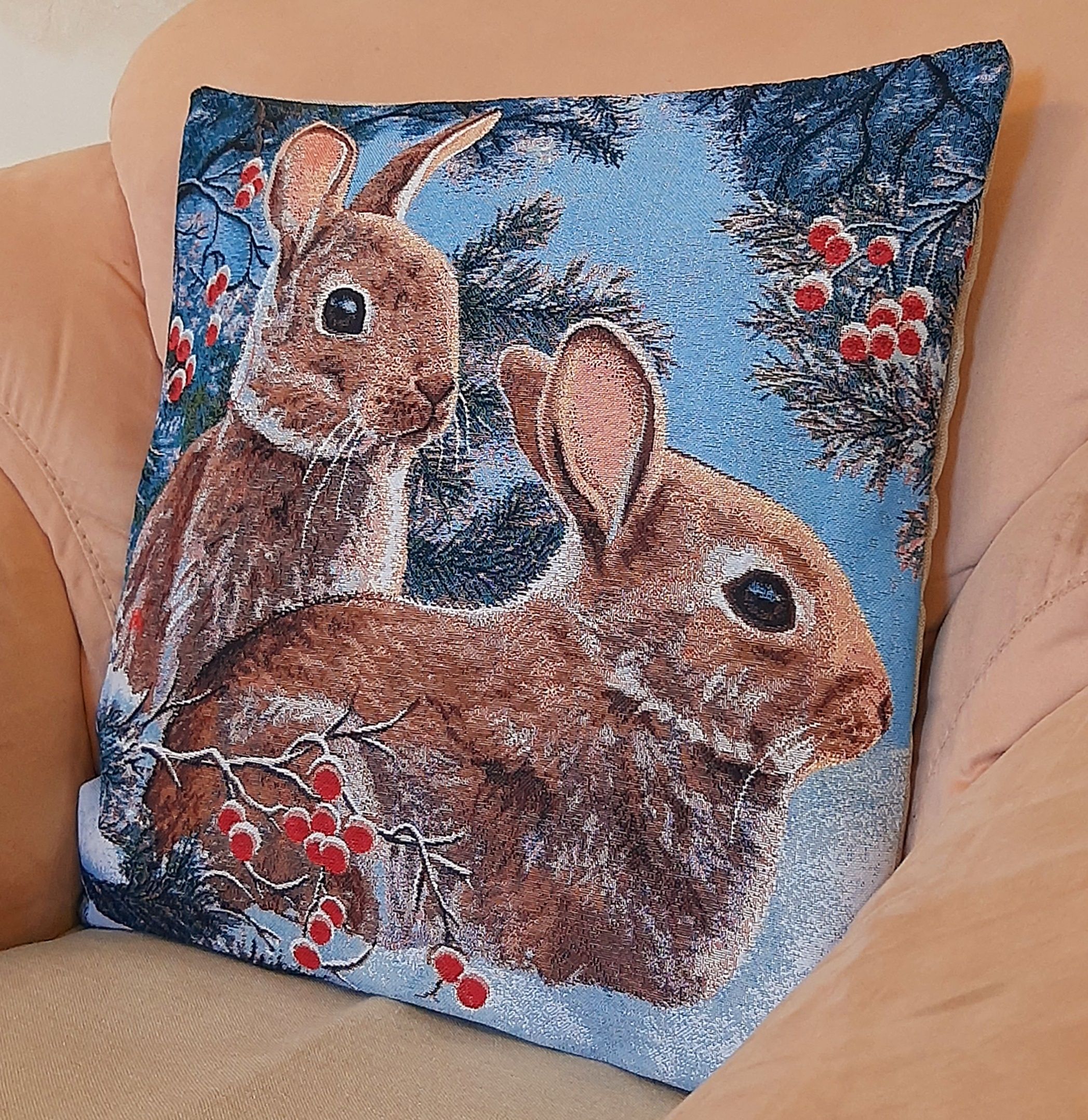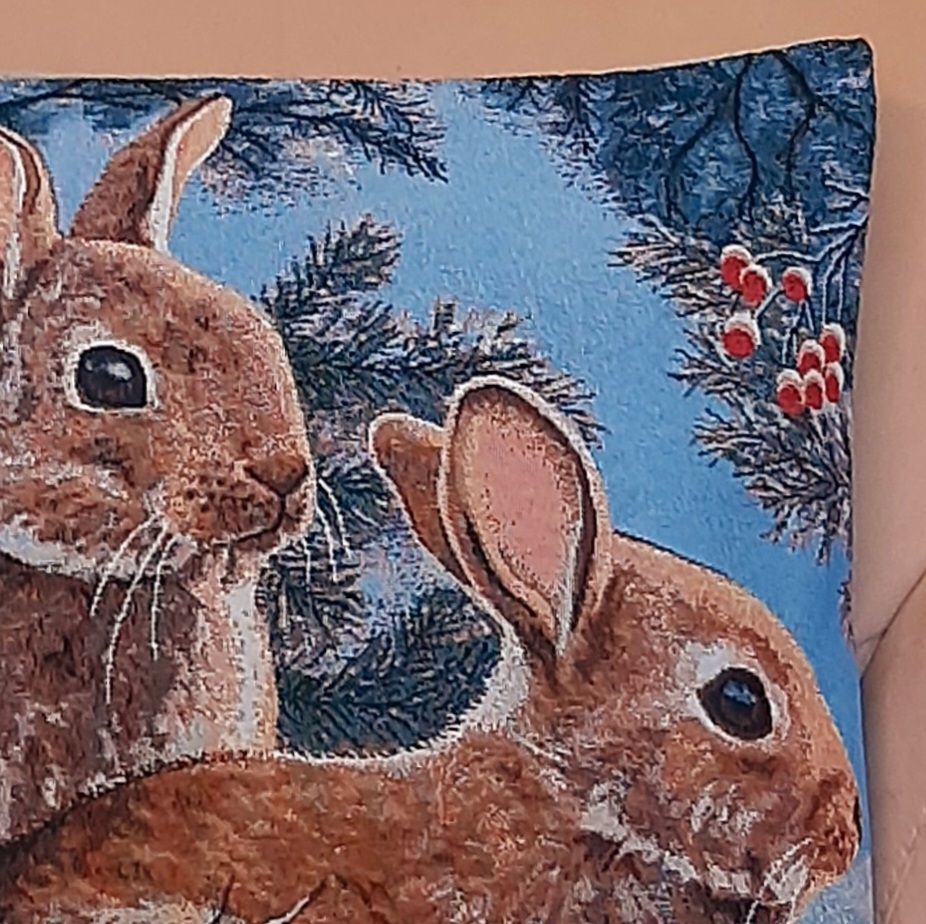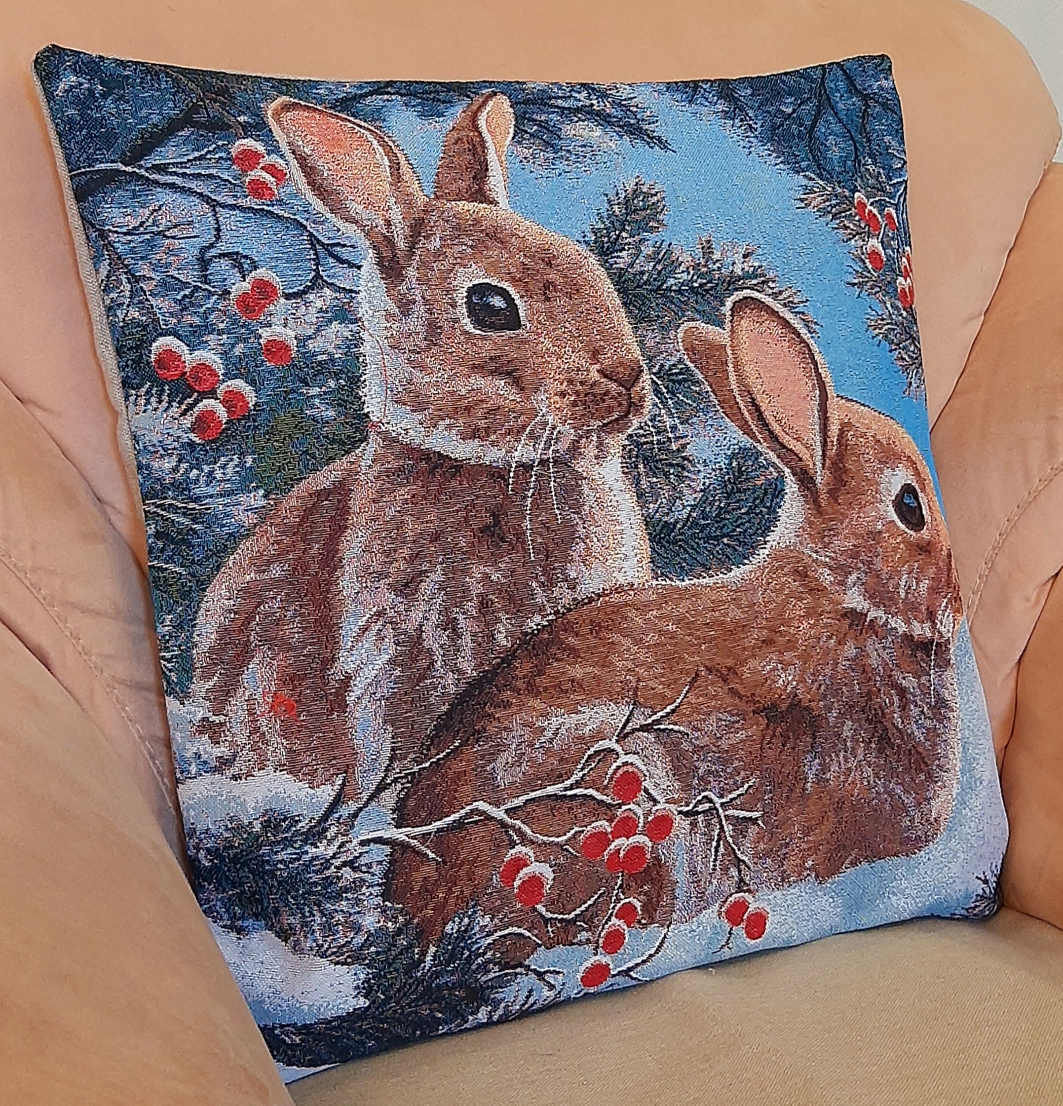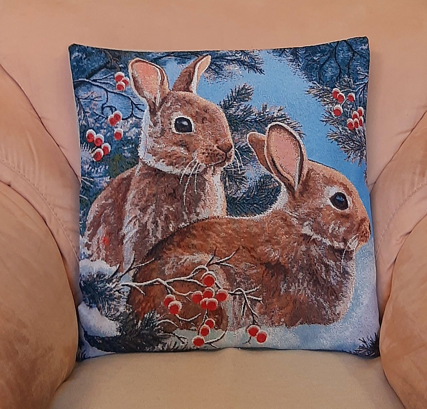 Гобеленовая декоративная наволочка с изображением Зайчат на снегу среди пушистых сосновых веток и красных ягод подойдет для оформления домашнего интерьера в Новогодние праздники. Можно использовать для украшения гостиной, спальни, детской комнаты, кафе, отеля, гостиницы. Можно использовать как дополнительные подушки на диван, кресло, кровать, дачная лавка на веранде. Отличный подарок или сувенир для родных и близких, друзей, коллег по работе, маме, бабушке, теще, тете, сестре, сослуживцам на новый год, новоселье, день рождения, корпоративный подарок, 8 марта.