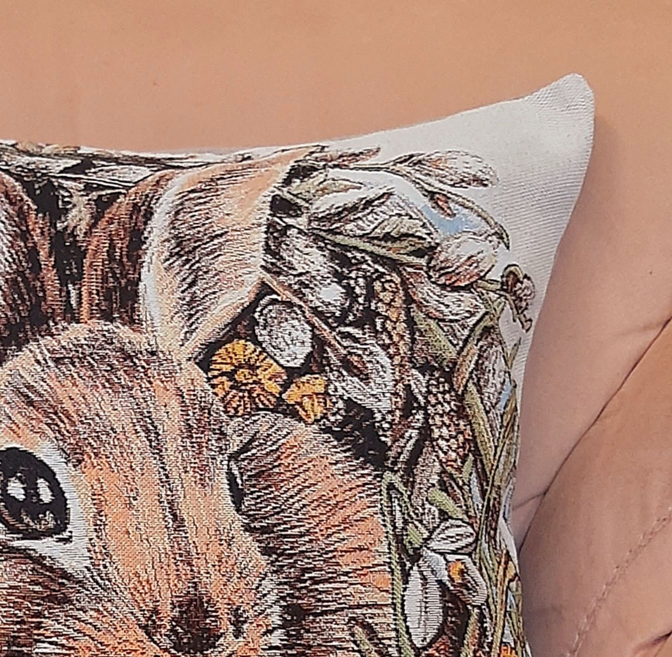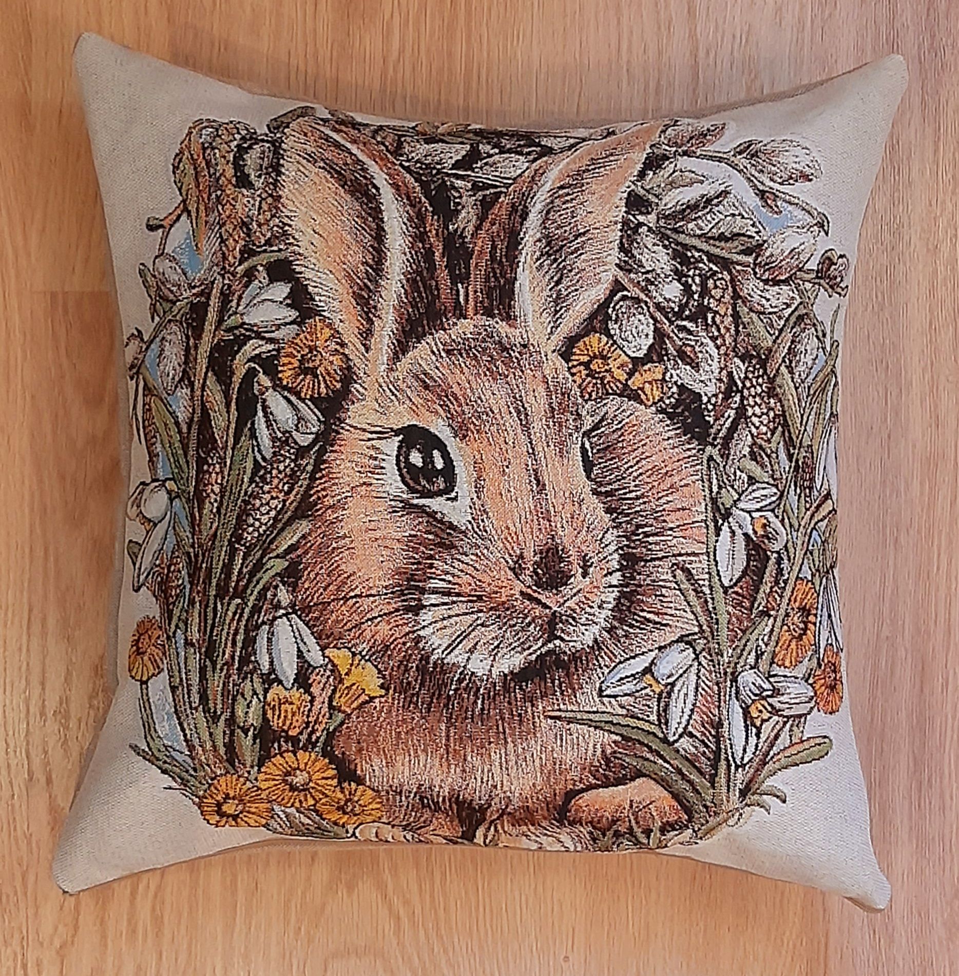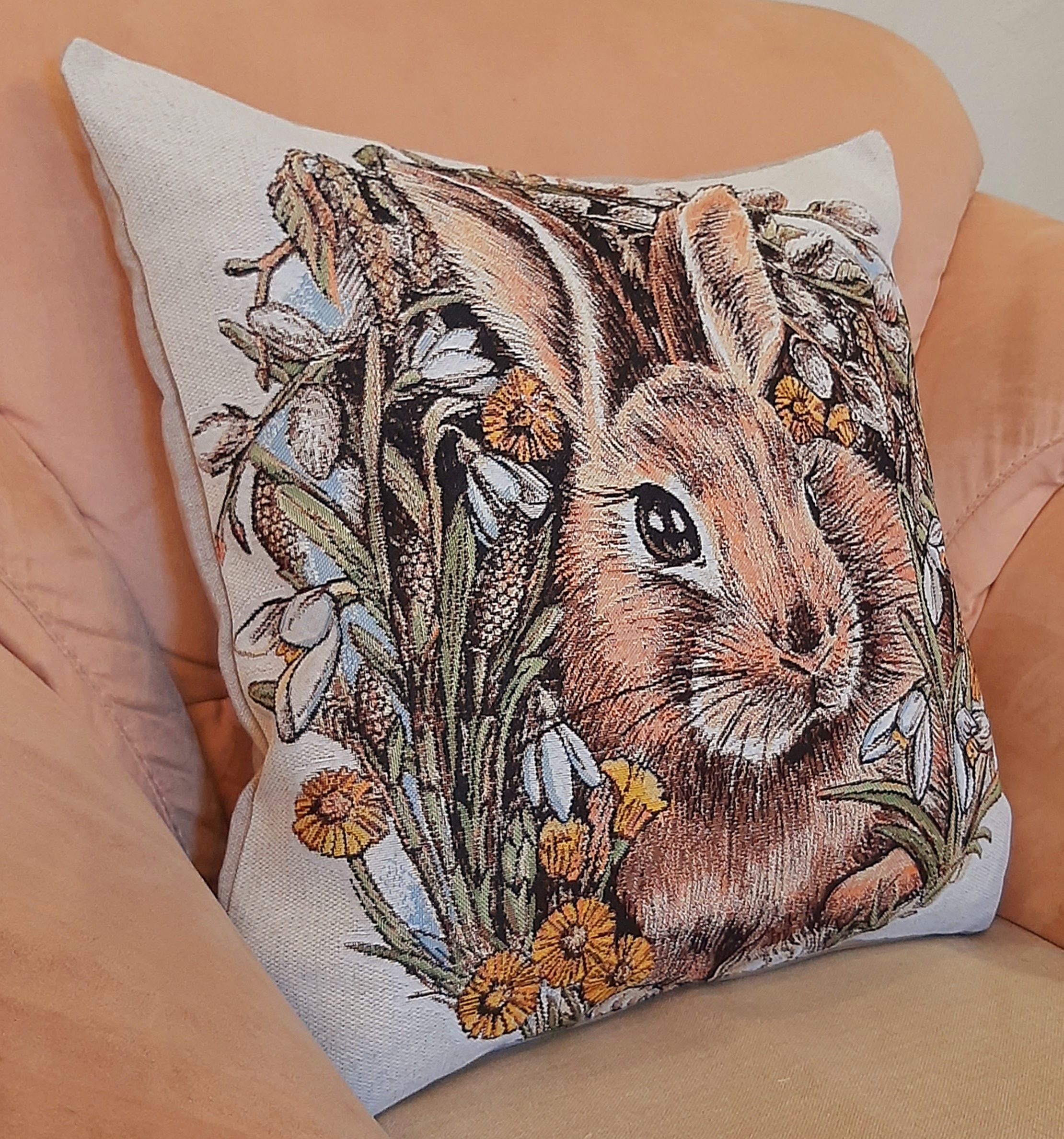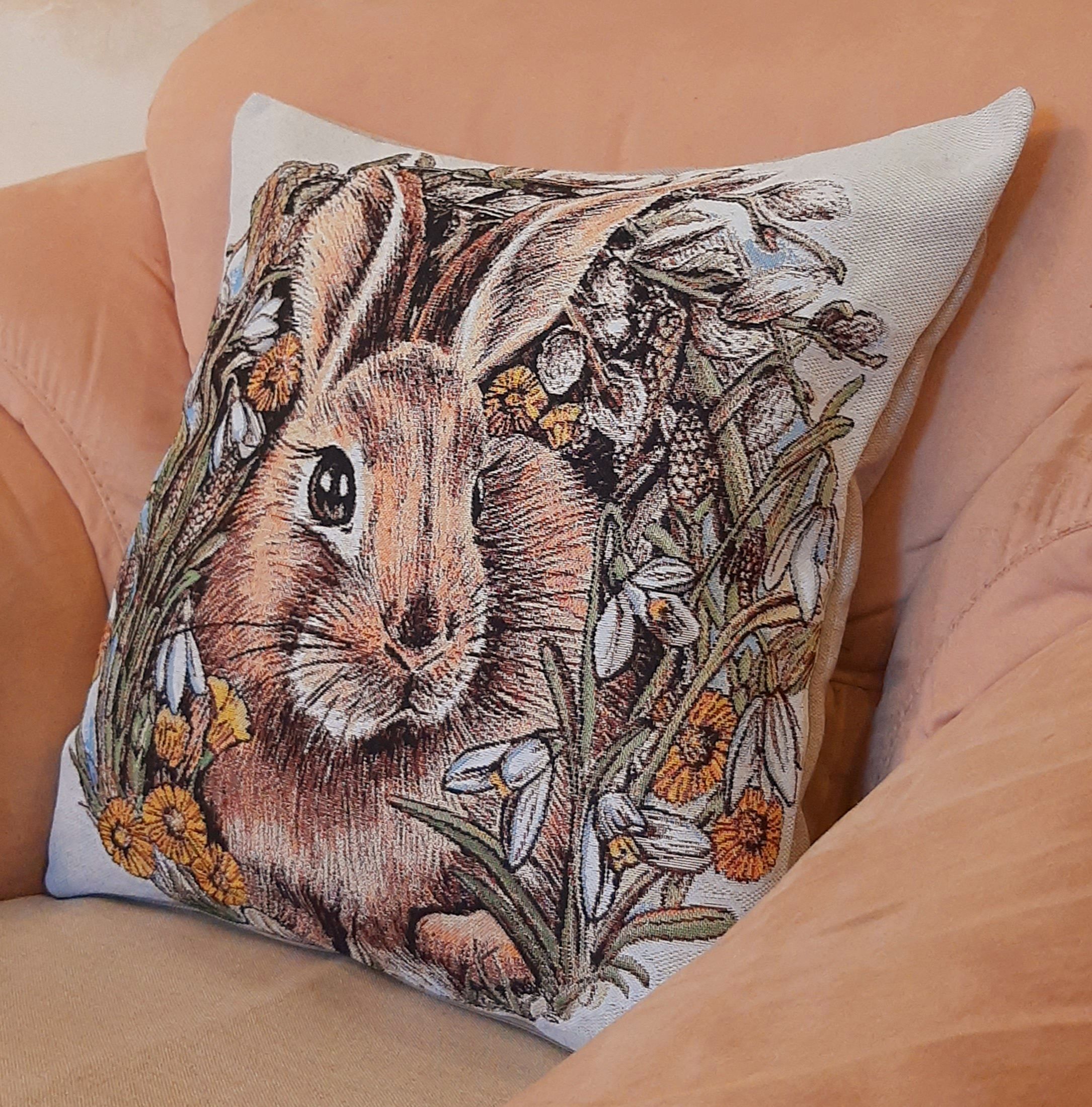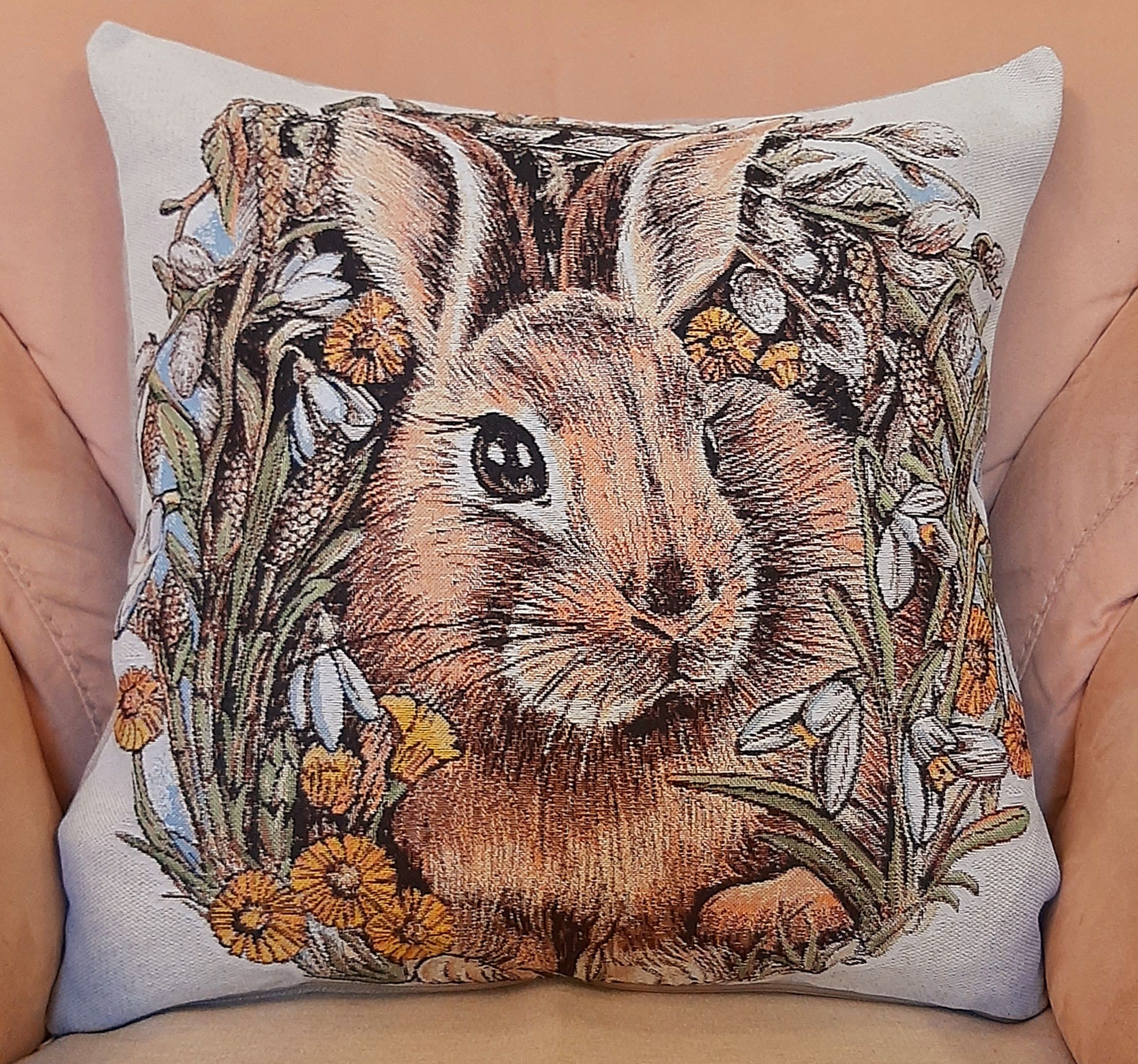 Гобеленовая декоративная наволочка с изображением Зайца крупным планом в окружении не ярких полевых цветов подойдет для оформления домашнего интерьера в Новогодние праздники. Можно использовать для украшения гостиной, спальни, детской комнаты, кафе, отеля, гостиницы. Можно использовать как дополнительные подушки на диван, кресло, кровать, дачная лавка на веранде. Отличный подарок или сувенир для родных и близких, друзей, коллег по работе, маме, бабушке, теще, тете, сестре, сослуживцам на новый год, новоселье, день рождения, корпоративный подарок, 8 марта.