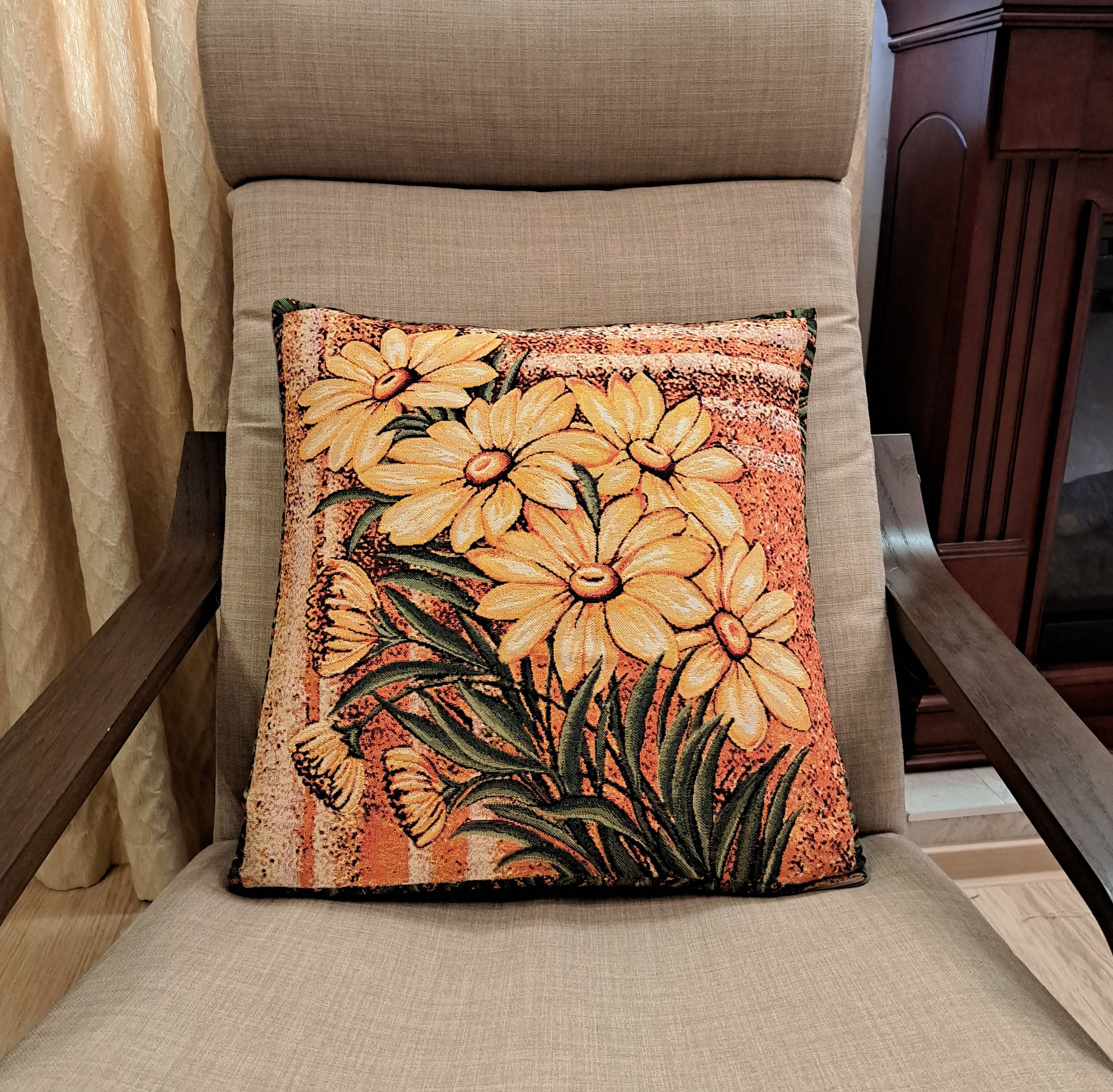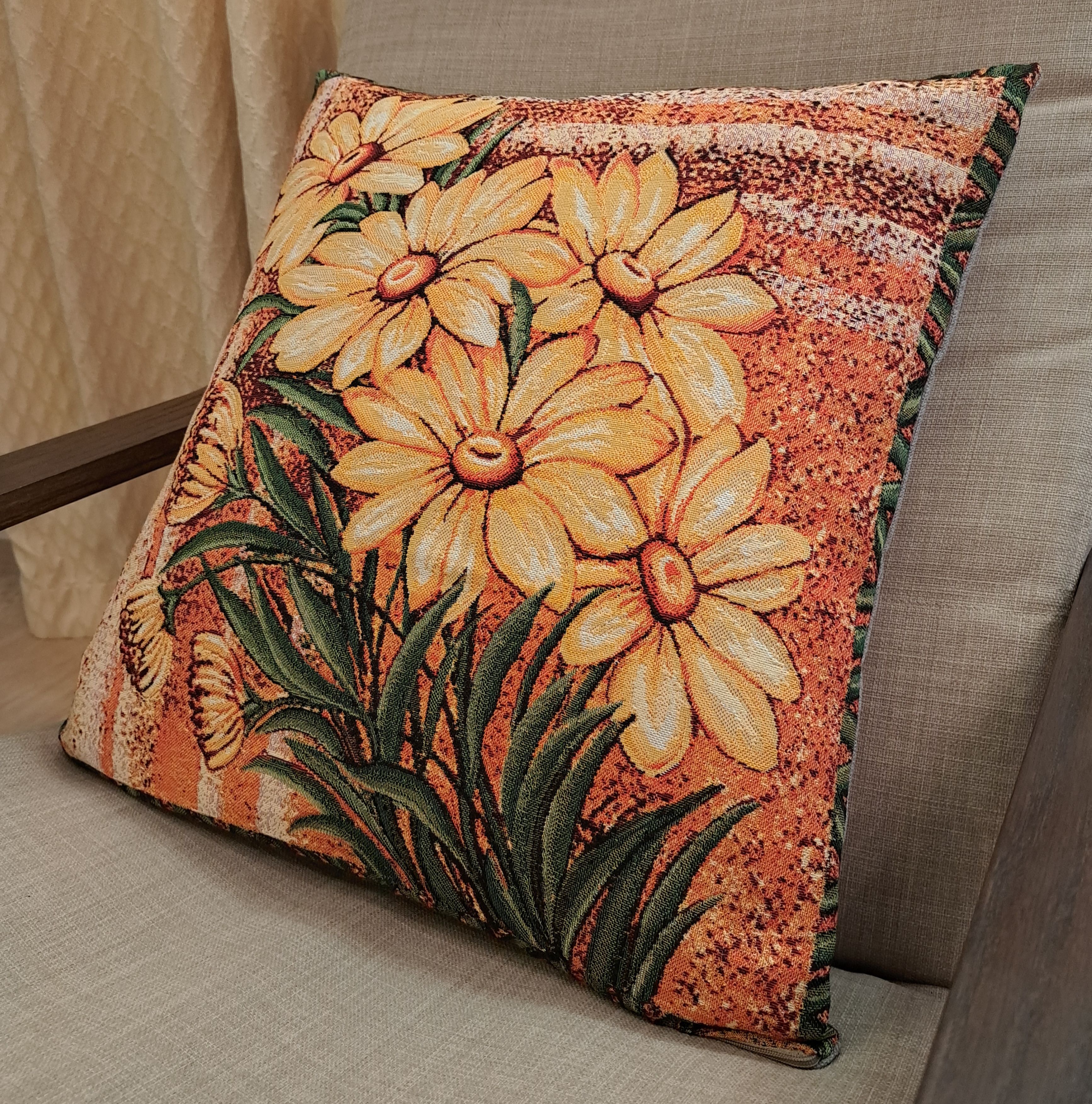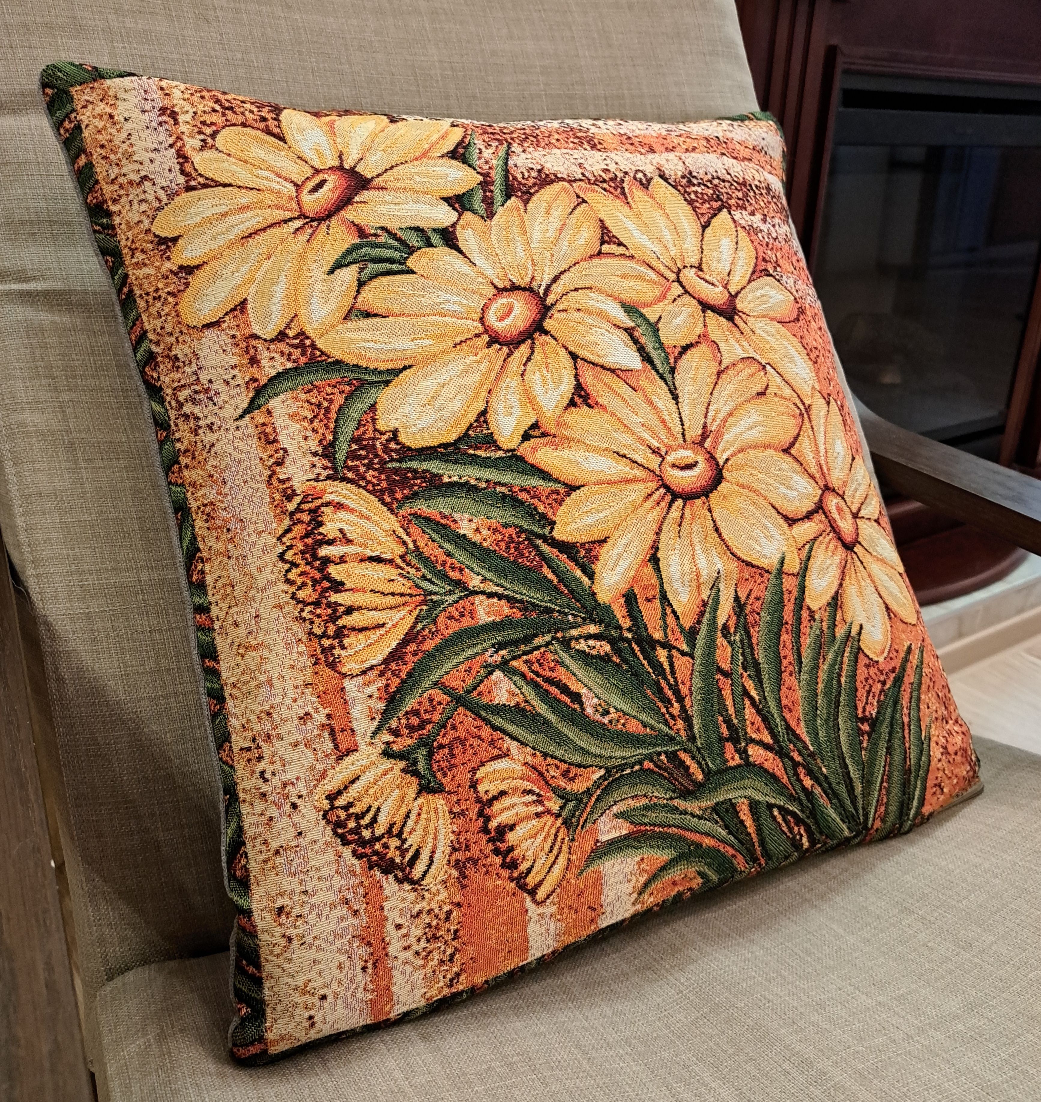 Гобеленовая декоративная наволочка с изображением цветов Желтых Ромашек подойдет для оформления домашнего интерьера в Новогодние праздники. Можно использовать для украшения гостиной, спальни, детской комнаты, кафе, отеля, гостиницы. Можно использовать как дополнительные подушки на диван, кресло, кровать, дачная лавка на веранде. Отличный подарок или сувенир для родных и близких, друзей, коллег по работе, маме, бабушке, теще, тете, сестре, сослуживцам на новый год, новоселье, день рождения, корпоративный подарок, 8 марта.