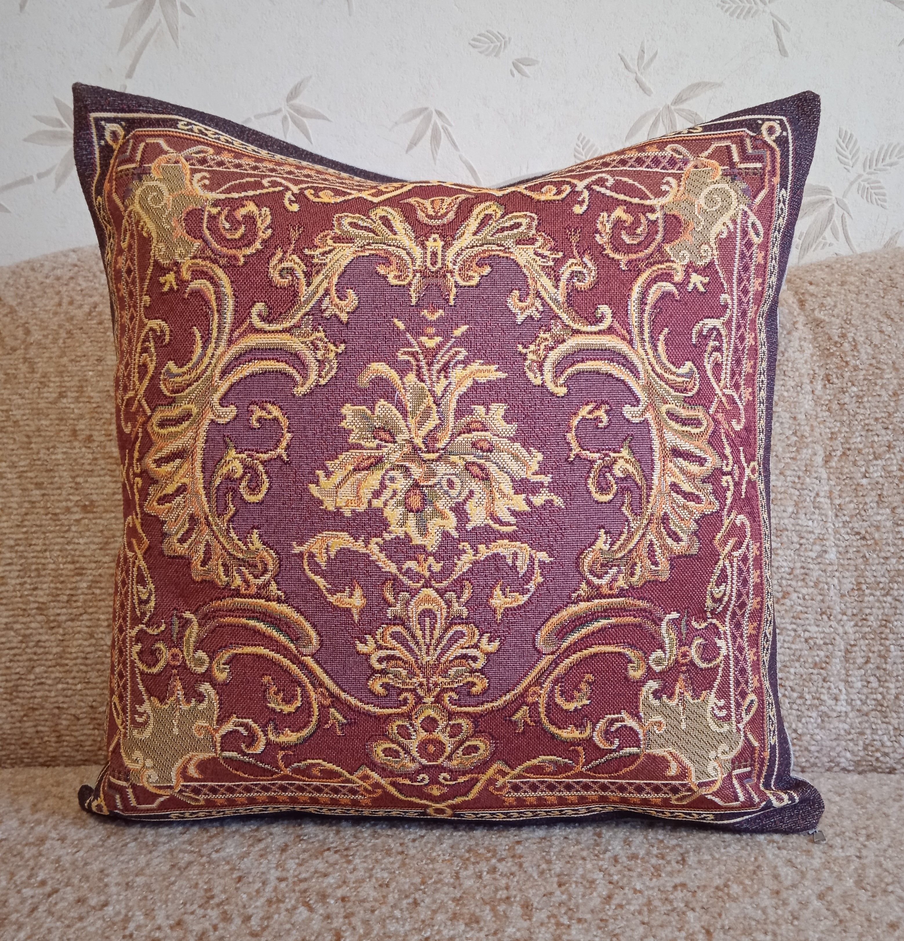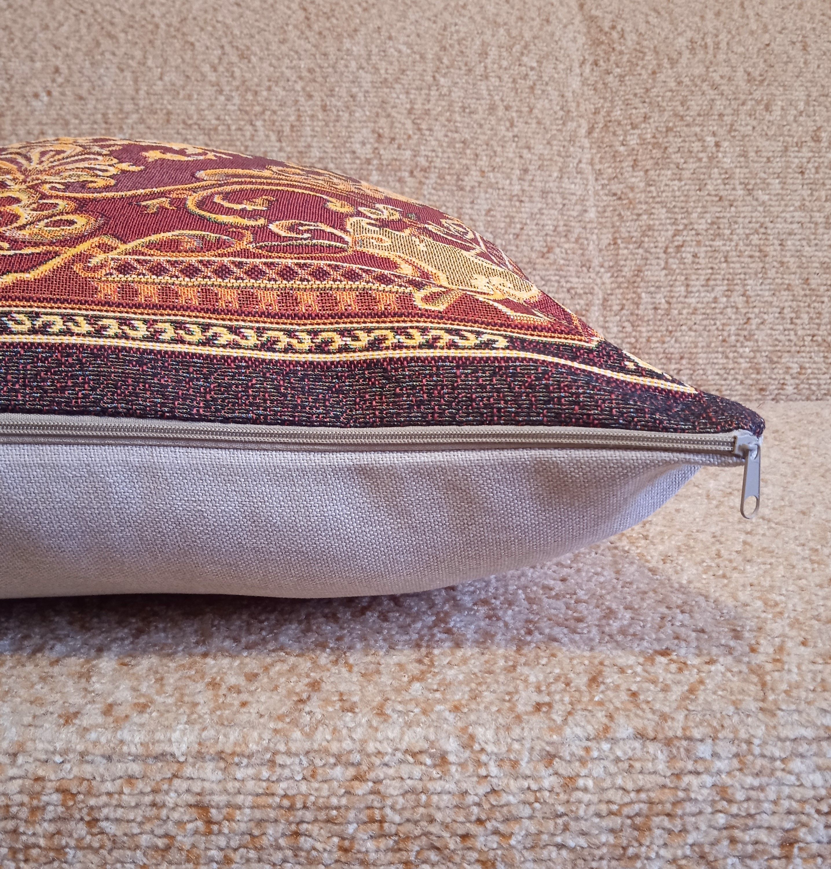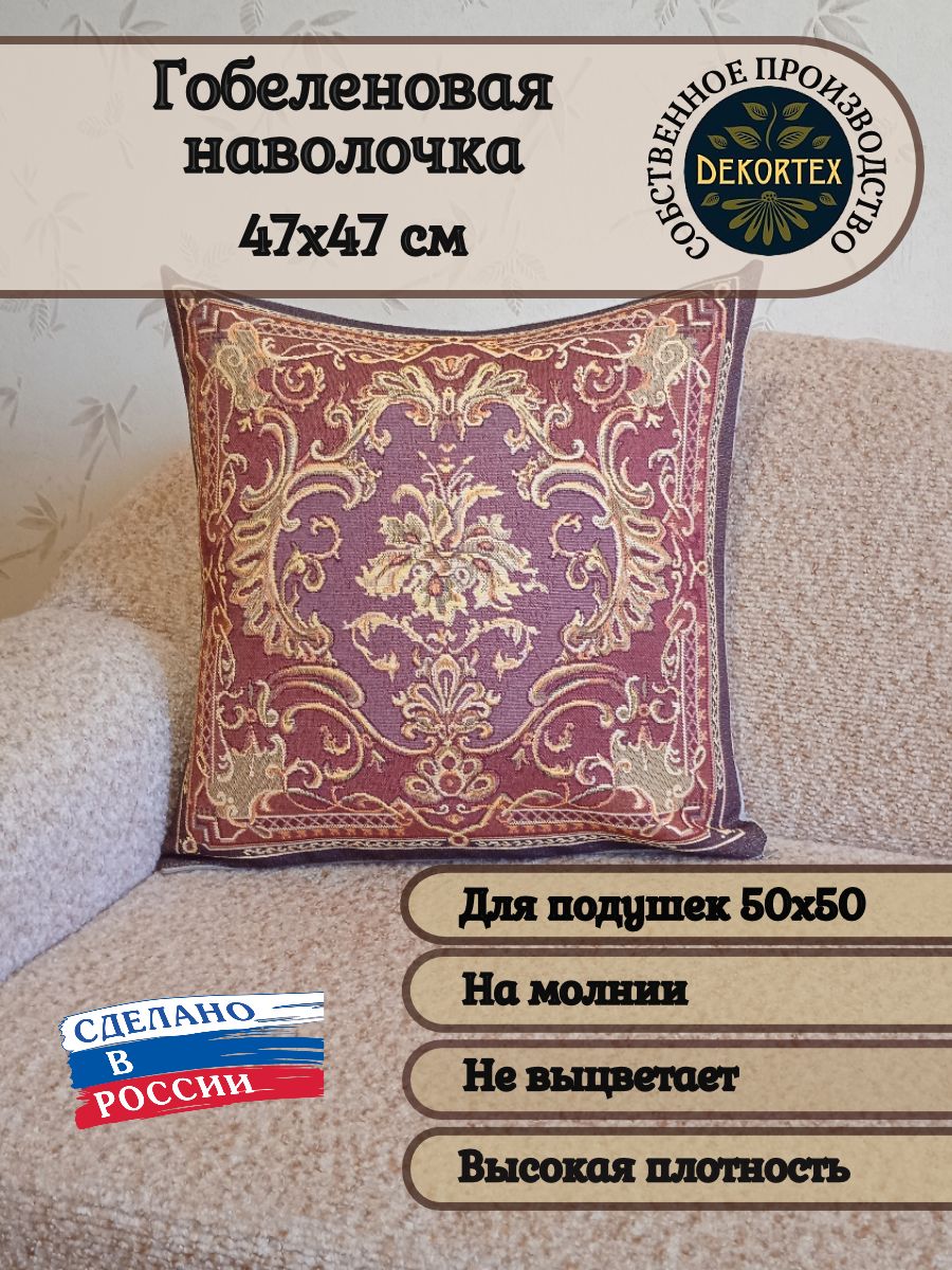 Гобеленовая наволочка для декоративной подушки. Размер наволочки: 47x47см. производство Россия. Изделие собственного производства сшито из отечественной жаккардовой ткани. Задняя часть выполнена из мебельной рогожки так же Российского производства. Все ткани используемые для производства декоративной наволочки производятся с соблюдением ТУ и ГОСТ РФ. Собственное швейное производство позволяет контролировать качество продукции на всех этапах до поступления на склад и предлагать покупателям товары высокого качества по выгодным ценам. Состав ткани 100% полиэстер. Плотность гобелена 380 г/кв.м. Наволочка подходит для подушек размером 50х50 см. Продается без подушки-наполнителя. Подушку-наполнитель так же можно купит у нас. Размер наволочки может отличаться от заявленного +/- 2 см. Допускается деликатная машинная стирка при температуре 30 градусов. Гладить при средней температуре.