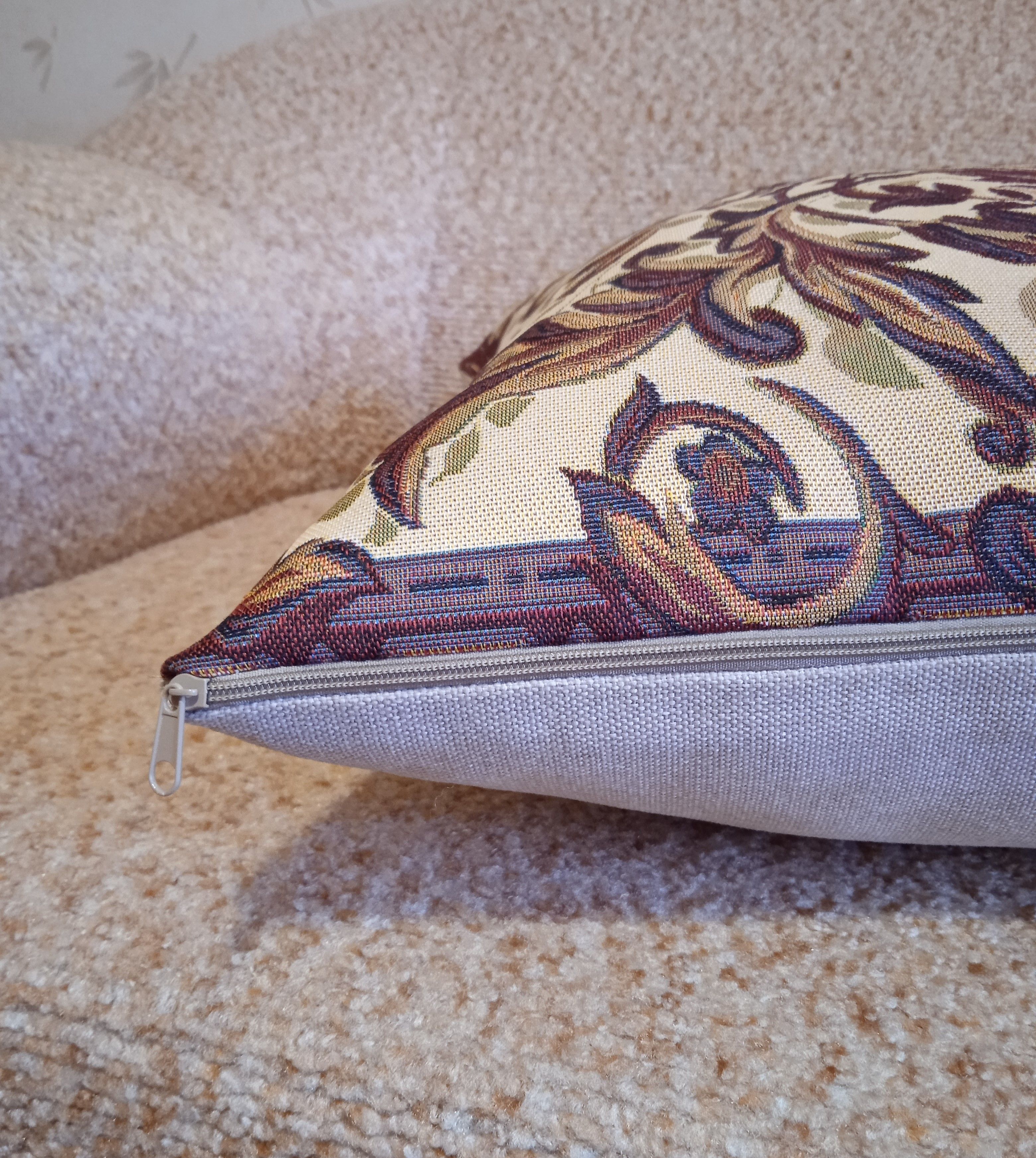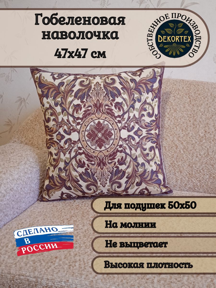 Гобеленовая наволочка для декоративной подушки. Размер наволочки: 47x47см. производство Россия. Изделие собственного производства сшито из отечественной жаккардовой ткани. Задняя часть выполнена из мебельной рогожки так же Российского производства. Все ткани используемые для производства декоративной наволочки производятся с соблюдением ТУ и ГОСТ РФ. Собственное швейное производство позволяет контролировать качество продукции на всех этапах до поступления на склад и предлагать покупателям товары высокого качества по выгодным ценам. Состав ткани 100% полиэстер. Плотность гобелена 380 г/кв.м. Наволочка подходит для подушек размером 50х50 см. Продается без подушки-наполнителя. Подушку-наполнитель так же можно купит у нас. Размер наволочки может отличаться от заявленного +/- 2 см. Допускается деликатная машинная стирка при температуре 30 градусов. Гладить при средней температуре.