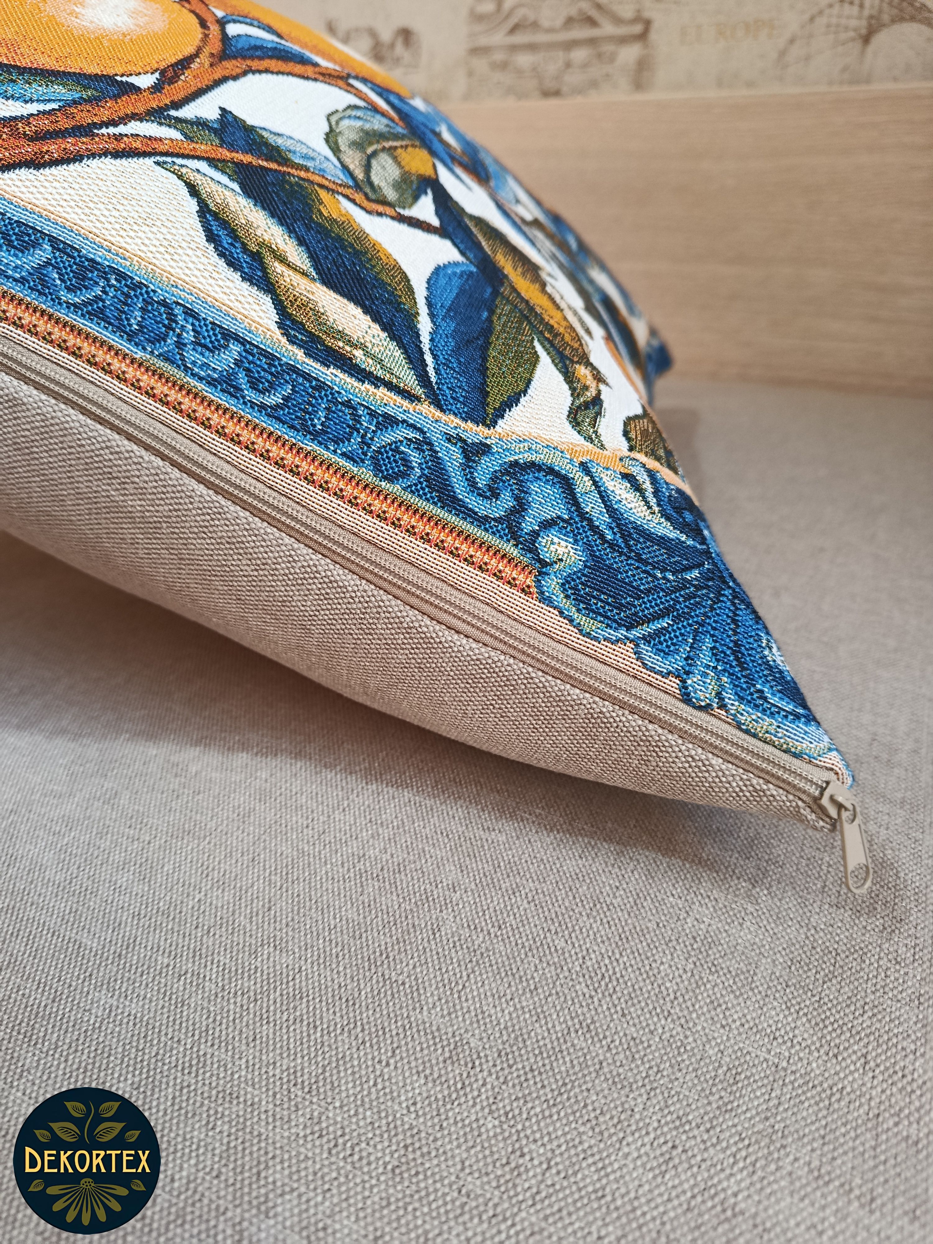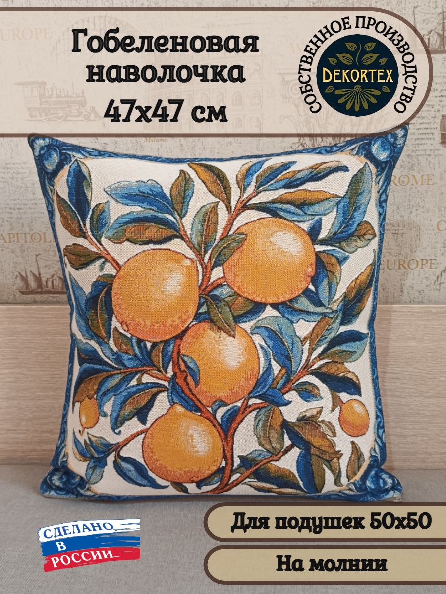 Гобеленовая наволочка для декоративной подушки. Размер наволочки: 47x47см. производство Россия. Изделие собственного производства сшито из отечественной жаккардовой ткани. Задняя часть выполнена из мебельной рогожки так же Российского производства. Все ткани используемые для производства декоративной наволочки производятся с соблюдением ТУ и ГОСТ РФ. Собственное швейное производство позволяет контролировать качество продукции на всех этапах до поступления на склад и предлагать покупателям товары высокого качества по выгодным ценам. Состав ткани 100% полиэстер. Плотность гобелена 380 г/кв.м. Наволочка подходит для подушек размером 50х50 см. Продается без подушки-наполнителя. Подушку-наполнитель так же можно купит у нас. Размер наволочки может отличаться от заявленного +/- 2 см. Допускается деликатная машинная стирка при температуре 30 градусов. Гладить при средней температуре.