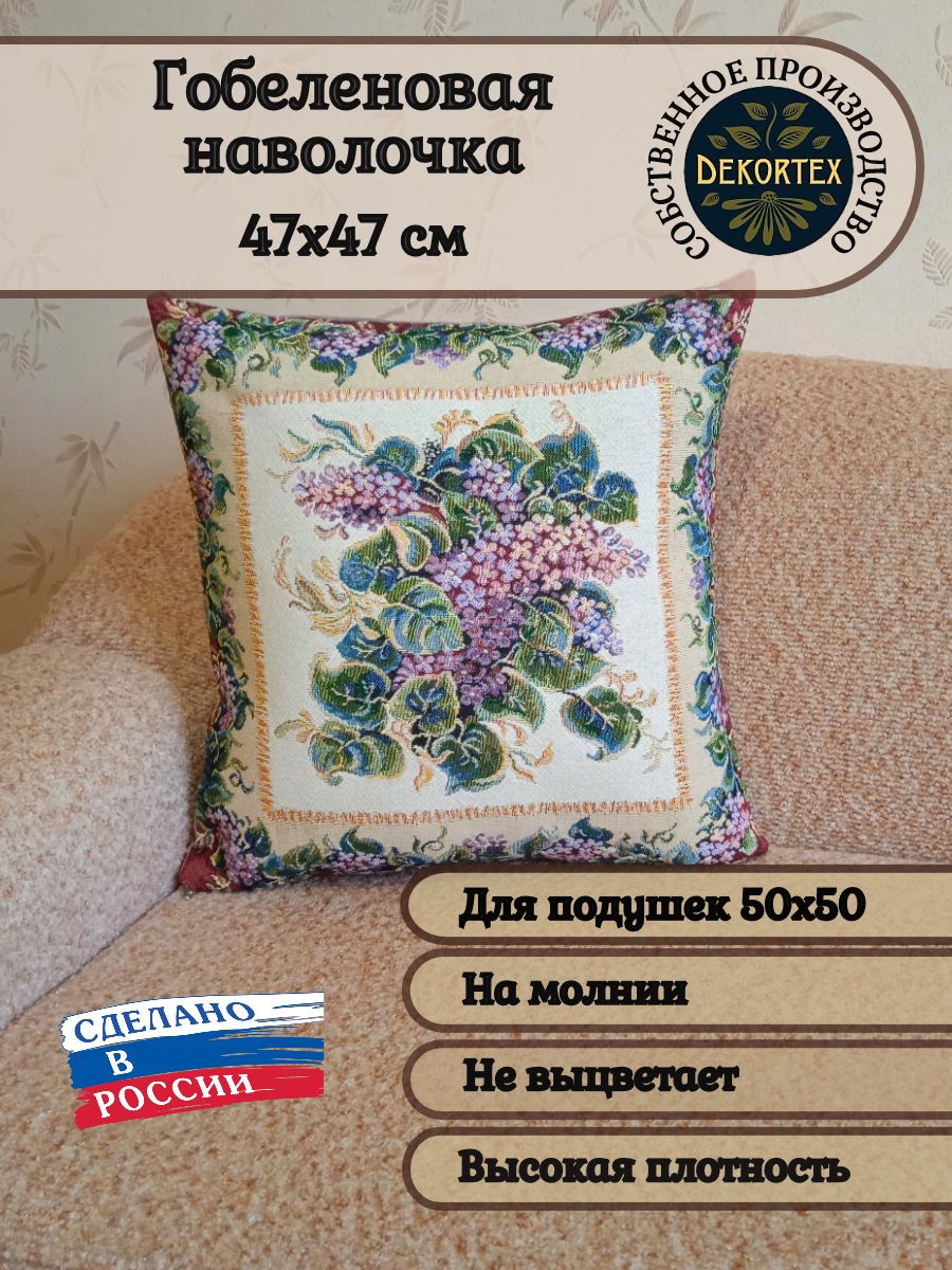Гобеленовая наволочка для декоративной подушки. Размер наволочки: 47x47см. производство Россия. Изделие собственного производства сшито из отечественной жаккардовой ткани. Задняя часть выполнена из мебельной рогожки так же Российского производства. Все ткани используемые для производства декоративной наволочки производятся с соблюдением ТУ и ГОСТ РФ. Собственное швейное производство позволяет контролировать качество продукции на всех этапах до поступления на склад и предлагать покупателям товары высокого качества по выгодным ценам. Состав ткани 100% полиэстер. Плотность гобелена 380 г/кв.м. Наволочка подходит для подушек размером 50х50 см. Продается без подушки-наполнителя. Подушку-наполнитель так же можно купит у нас. Размер наволочки может отличаться от заявленного +/- 2 см. Допускается деликатная машинная стирка при температуре 30 градусов. Гладить при средней температуре.