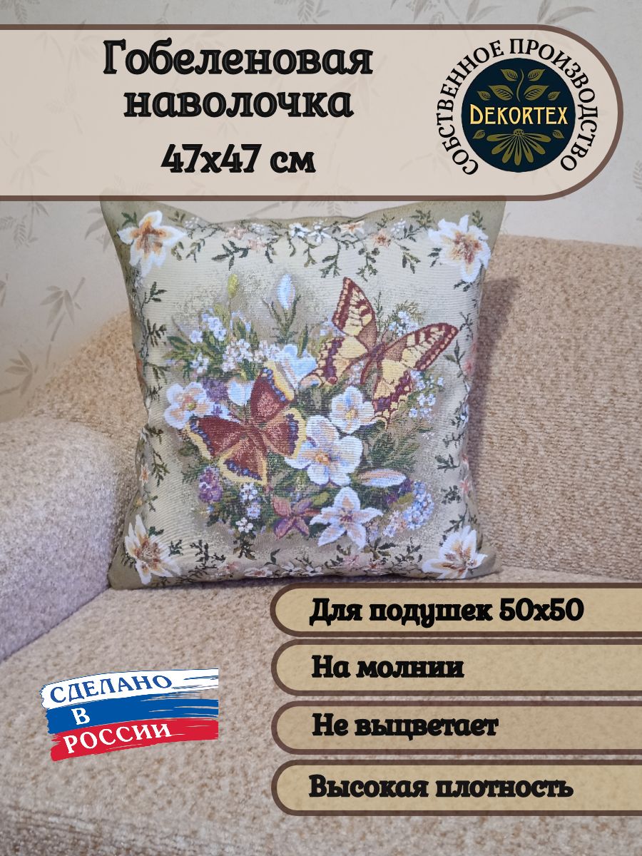 Гобеленовая наволочка для декоративной подушки. Размер наволочки: 47x47см. производство Россия. Изделие собственного производства сшито из отечественной жаккардовой ткани. Задняя часть выполнена из мебельной рогожки так же Российского производства. Все ткани используемые для производства декоративной наволочки производятся с соблюдением ТУ и ГОСТ РФ. Собственное швейное производство позволяет контролировать качество продукции на всех этапах до поступления на склад и предлагать покупателям товары высокого качества по выгодным ценам. Состав ткани 100% полиэстер. Плотность гобелена 380 г/кв.м. Наволочка подходит для подушек размером 50х50 см. Продается без подушки-наполнителя. Подушку-наполнитель так же можно купит у нас. Размер наволочки может отличаться от заявленного +/- 2 см. Допускается деликатная машинная стирка при температуре 30 градусов. Гладить при средней температуре.