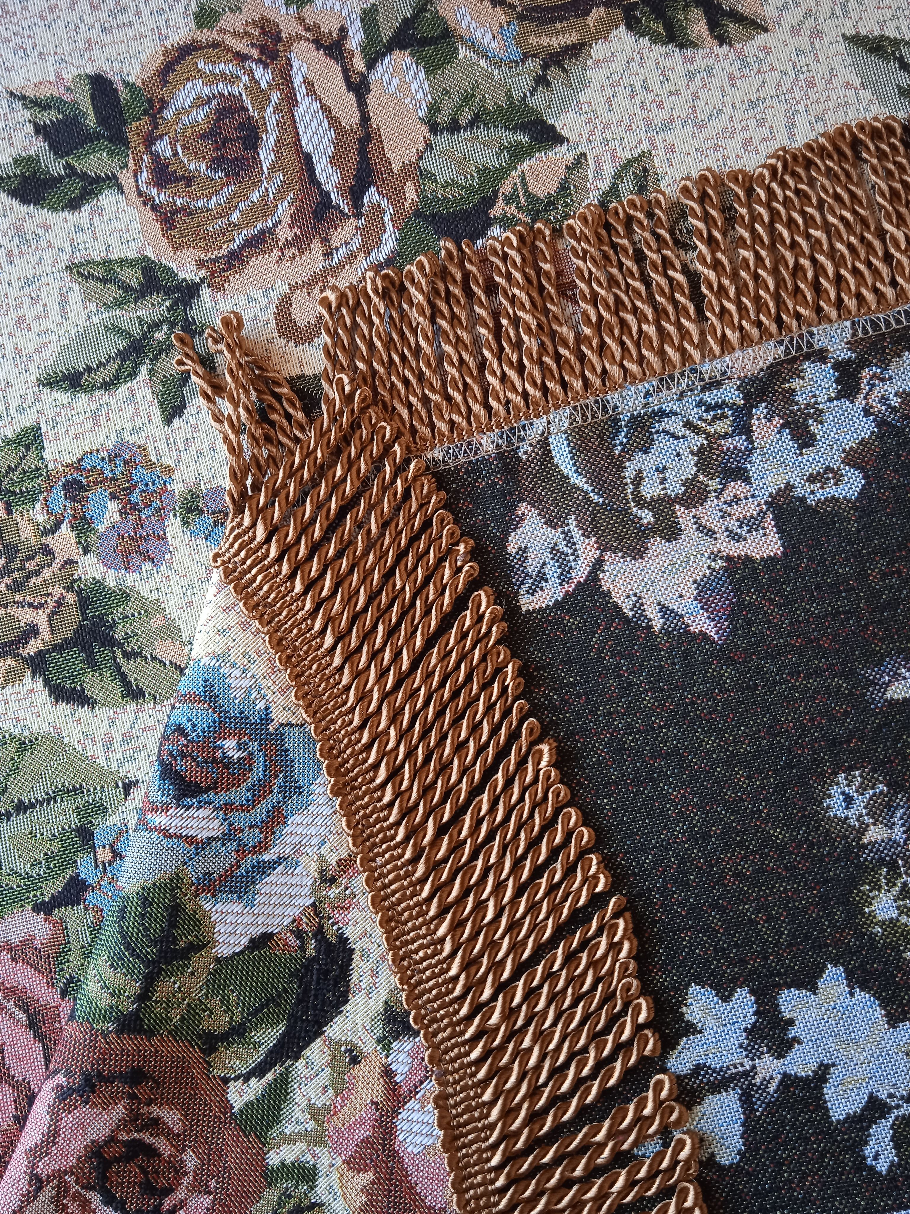 Края скатертей обшиты бахромой, гармонирующей по цвету с цветом скатерти.