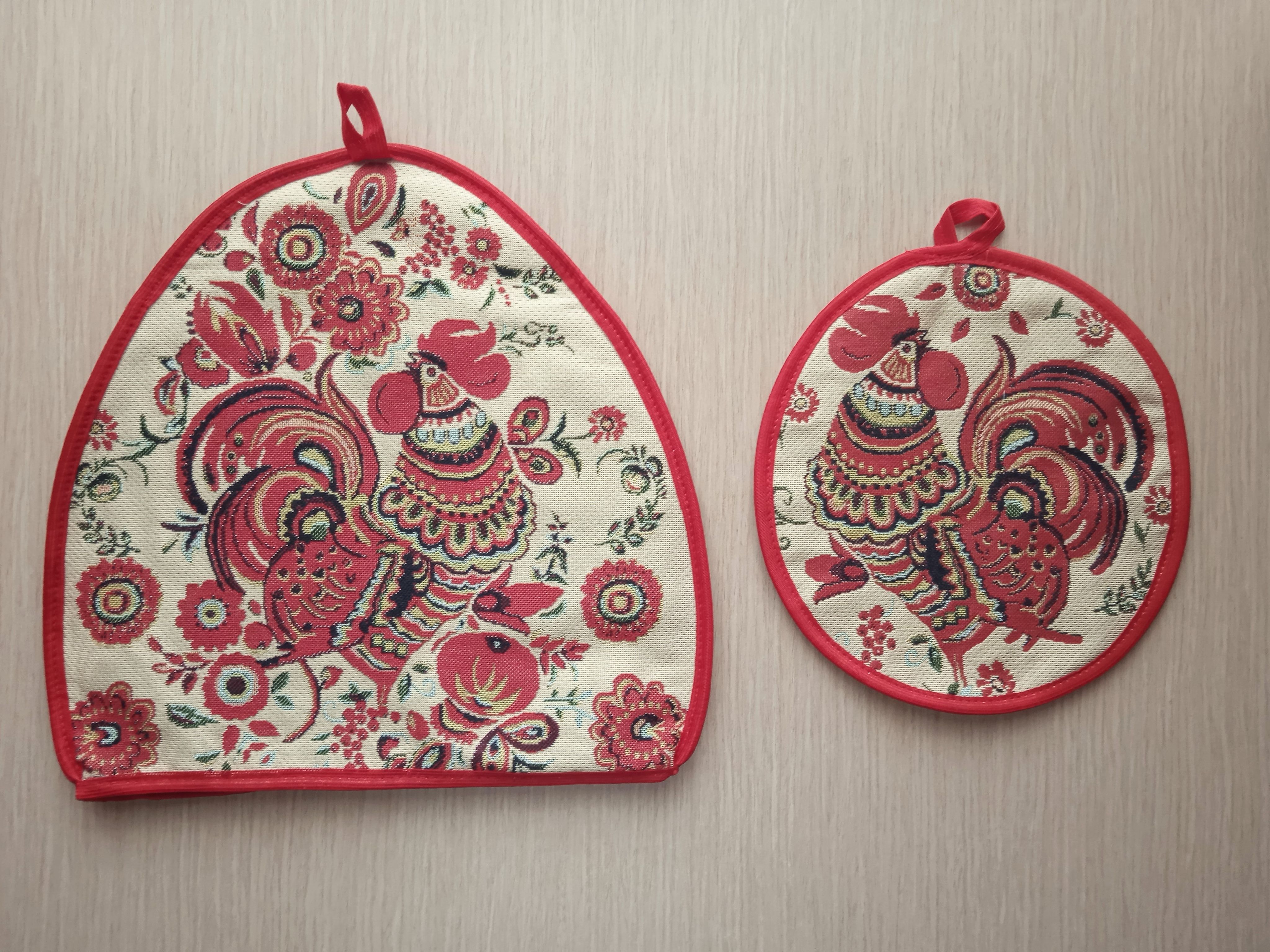 Гобеленовый набор для чайника. В набор входит колпак-грелка на заварочный чайник и подставка-прихватка круглой формы. Набор на чайник сшит из гобеленовой ткани с рисунком специально подобранным для этого предмета кухонного текстиля. Предметы входящие в набор имеют прокладку из хлопкового ватина, для сохранения температуры чая в заварочном чайнике, и подкладку из хлопковой бязи внутри колпака и на обратной стороне подставки-прихватки.Колпак входящий в набор для чайника надевается на заварочный чайник для сохранения температуры чая внутри чайника на длительное время. Круглая подставка служит изолирующей прокладкой между чайником и поверхностью стола и так же как и колпак помогает сохранять температуру чая в чайнике.Вместе эти предметы кухонного текстиля образуют гобеленовый термос, красивый стильный, оригинальный и безусловно полезный во время чаепития с гостями. Вам не придется многократно подогревать чай, он останется горячим. Чай при постоянно высокой температуре заваривается гораздо быстрее, и лучше раскрывает аромат хорошего чая. И сам гобеленовый набор для чая не останется без внимания ваших гостей.За очень не высокую цену вы можете приобрести оригинальный и полезный набор для кухни себе или в подарок, который непременно оценят ваши друзья и будут пользоваться им вспоминая вас с благодарностью.
