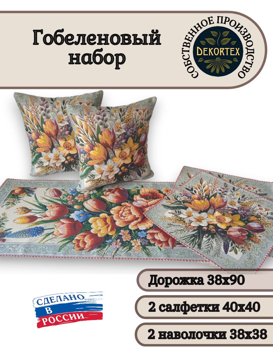 Декоративные гобеленовые дорожки и салфетки - это приятное и полезное украшение для сервировки стола. Размер, цвет и рисунок салфеток можно выбрать по желанию покупателя. Гобеленовые декоративные дорожки не только модный, красивый предмет интерьера но и полезны и практичны в использовании. Они помогут предохранить поверхность мебели от повреждения. Гобеленовые столешницы устойчивы к загрязнению, хорошо стираются при температуре 30 градусов на дают усадки не линяют. Изделия из гобеленовой ткани имеют длительный срок службы и сохраняют первоначальный вид и форму.