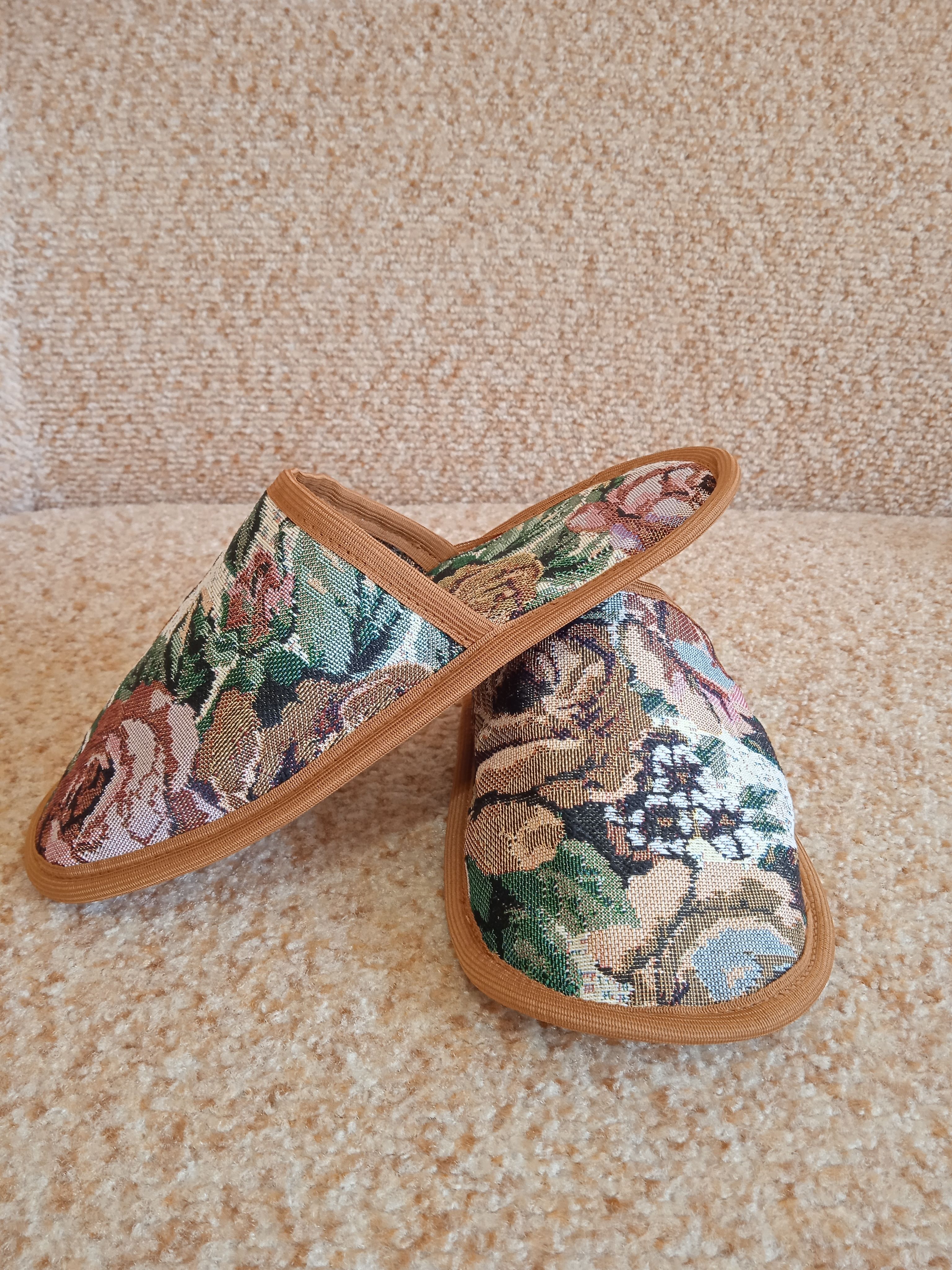 Гостевой набор тапочек собственного производства выполнен из износостойкого, Российского двухслойного гобелена с высокой плотностью. В набор входят 3 пары тапочек и большой тапок-карман для удобного хранения. В подошве тапок есть мягкая прослойка поролона. Набор тапочек можно повесить на крючок в прихожей и Вы всегда будете готовы к приходу гостей. Кроме того, гостевой набор может стать красивым и полезным подарком на новоселье, 8 марта, новый год и другие праздники.