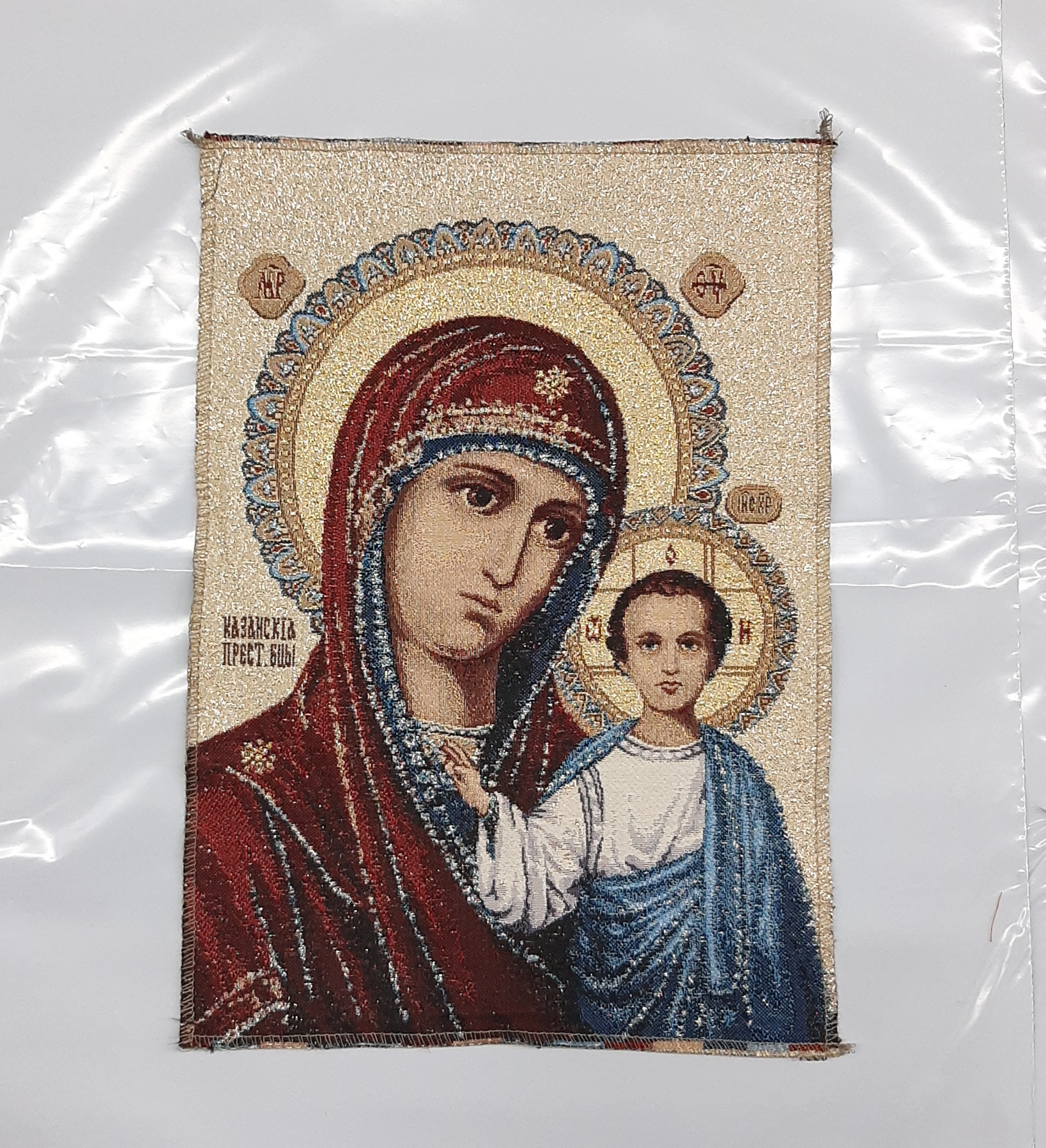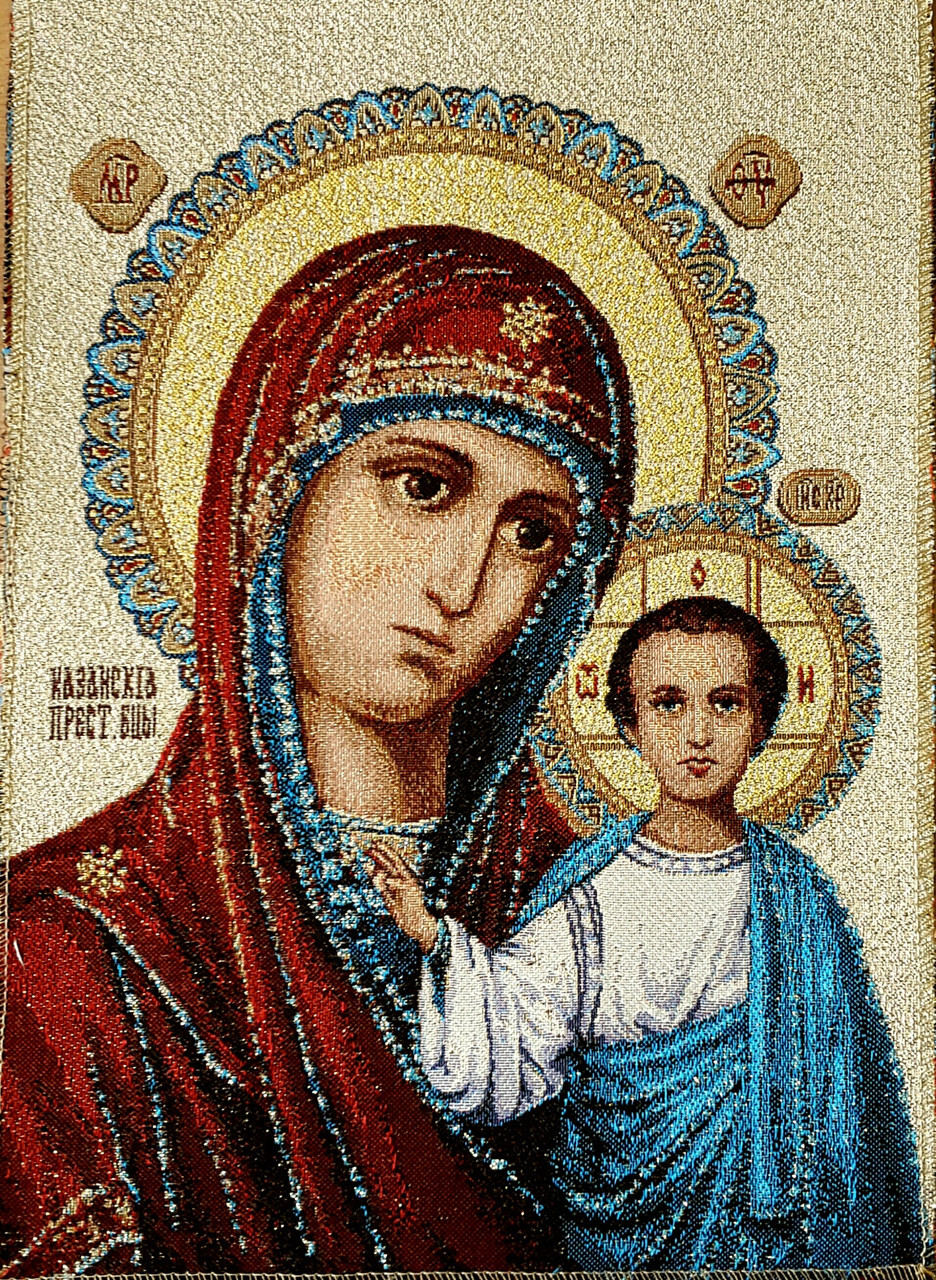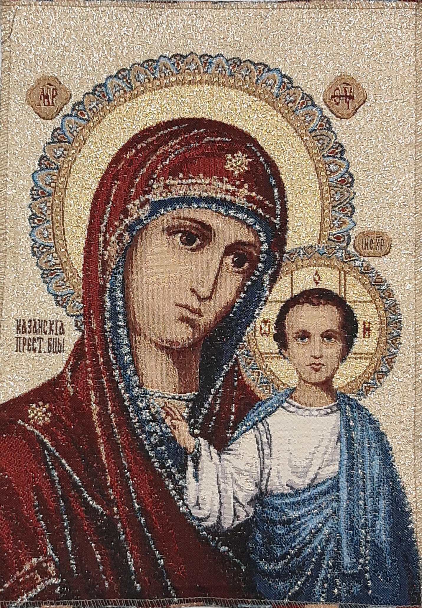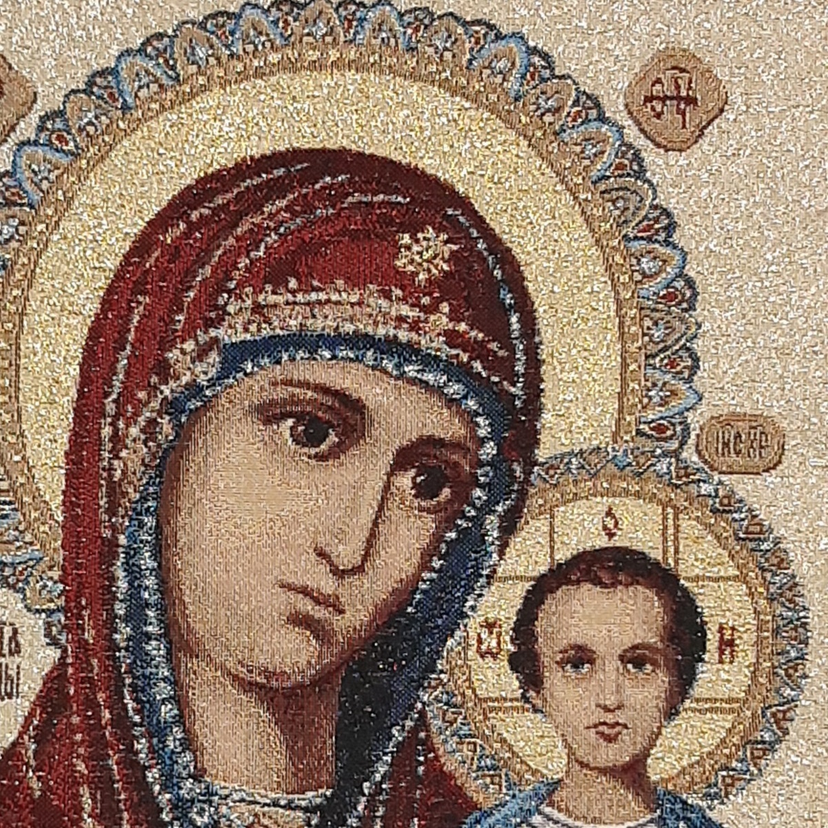 Гобеленовое панно с люрексом "Казанская икона Божией Матери" для оформления в багетную раму или оклад. Панно выполнено в соответствии с церковными канонами, изображение четкое, цвета насыщенные, люрекс придает изображению торжественности и свойственного для православных икон величия. Иконы на гобелене не тускнеют и не выцветают, блестящая золотая нить не остается такой бесконечно долгое время.