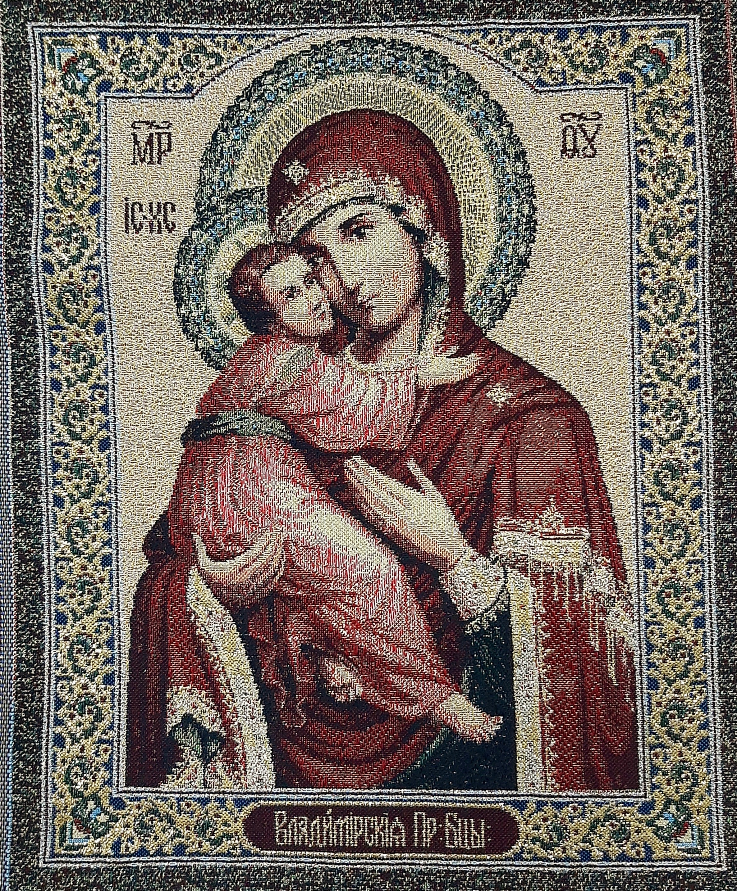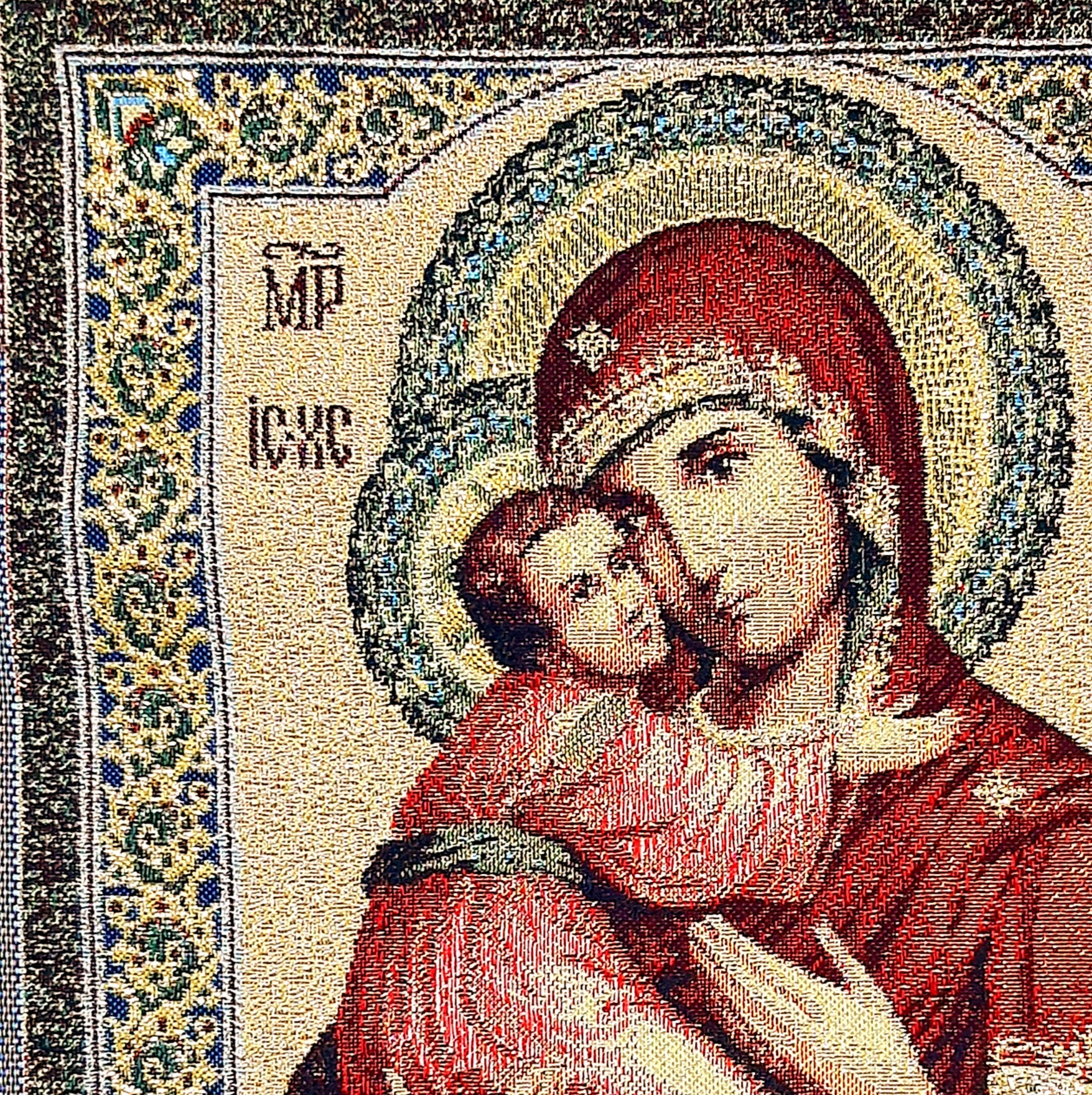 Гобеленовое панно с люрексом "Владимирская икона Божией Матери" для оформления в багетную раму или оклад. Панно выполнено в соответствии с церковными канонами, изображение четкое, цвета насыщенные, люрекс придает изображению торжественности и свойственного для православных икон величия. Иконы на гобелене не тускнеют и не выцветают, блестящая золотая нить не остается такой бесконечно долгое время.