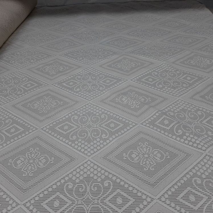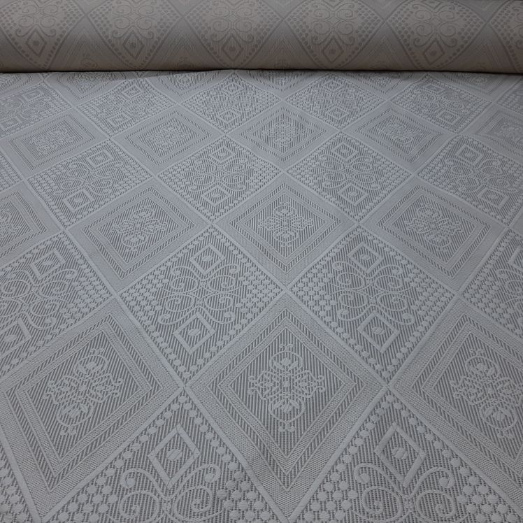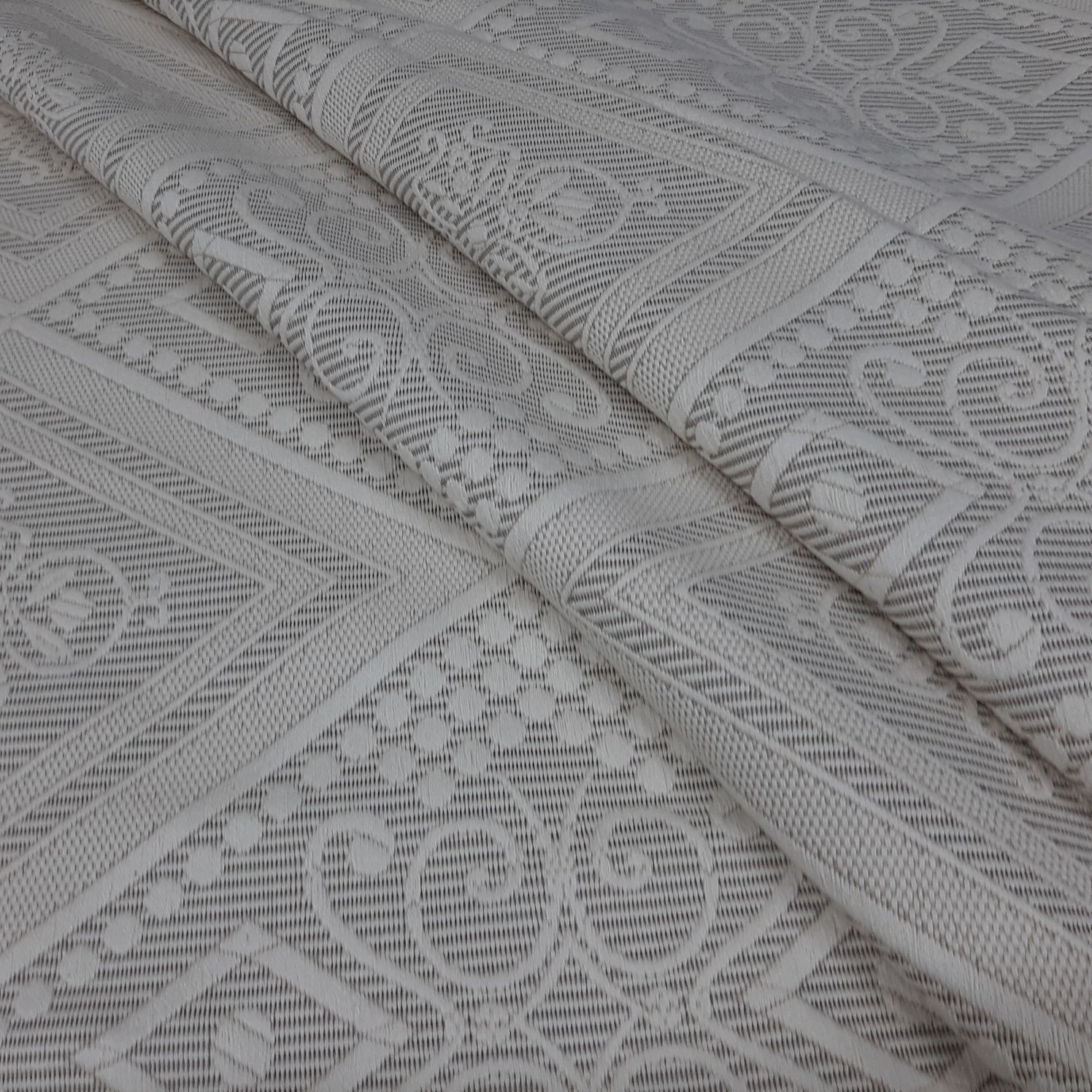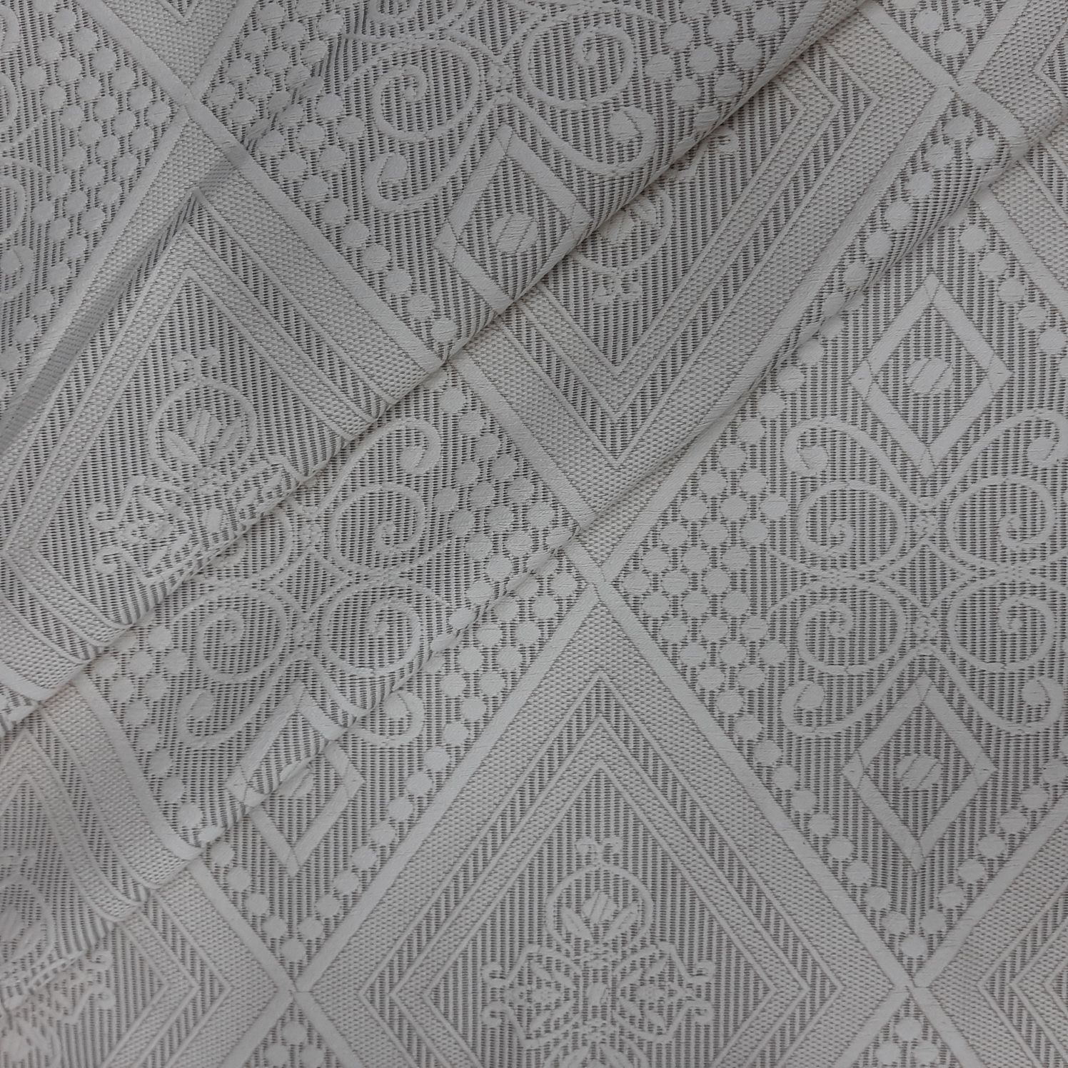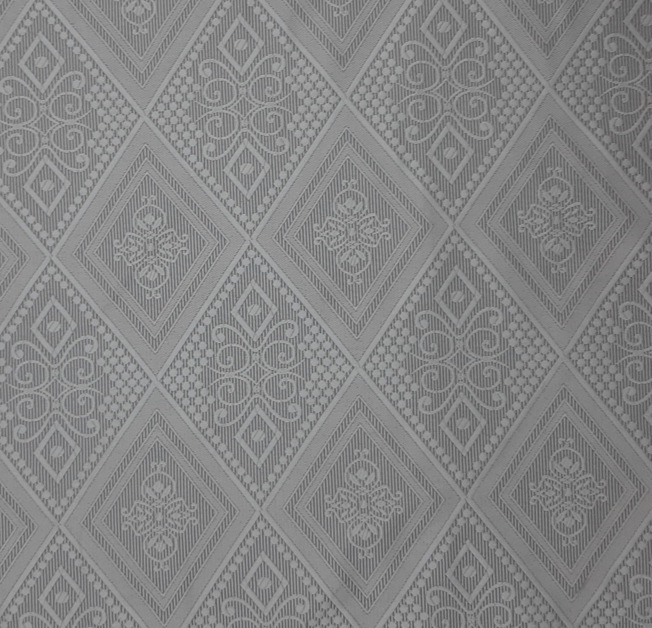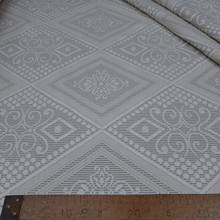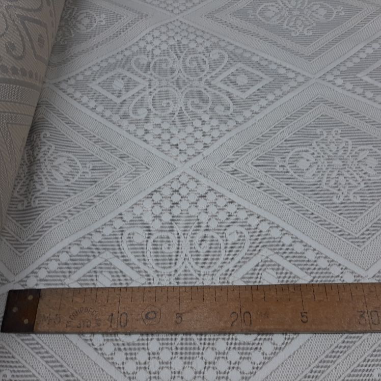 Гобеленовая ткань Кроше однотонная, светлая, теплого сливочного оттенка, с рельефным жаккардовым узором, геометрической формы. Выглядит солидно и дорого. Идеальный вариант для тех кто предпочитает белый цвет в интерьере.
