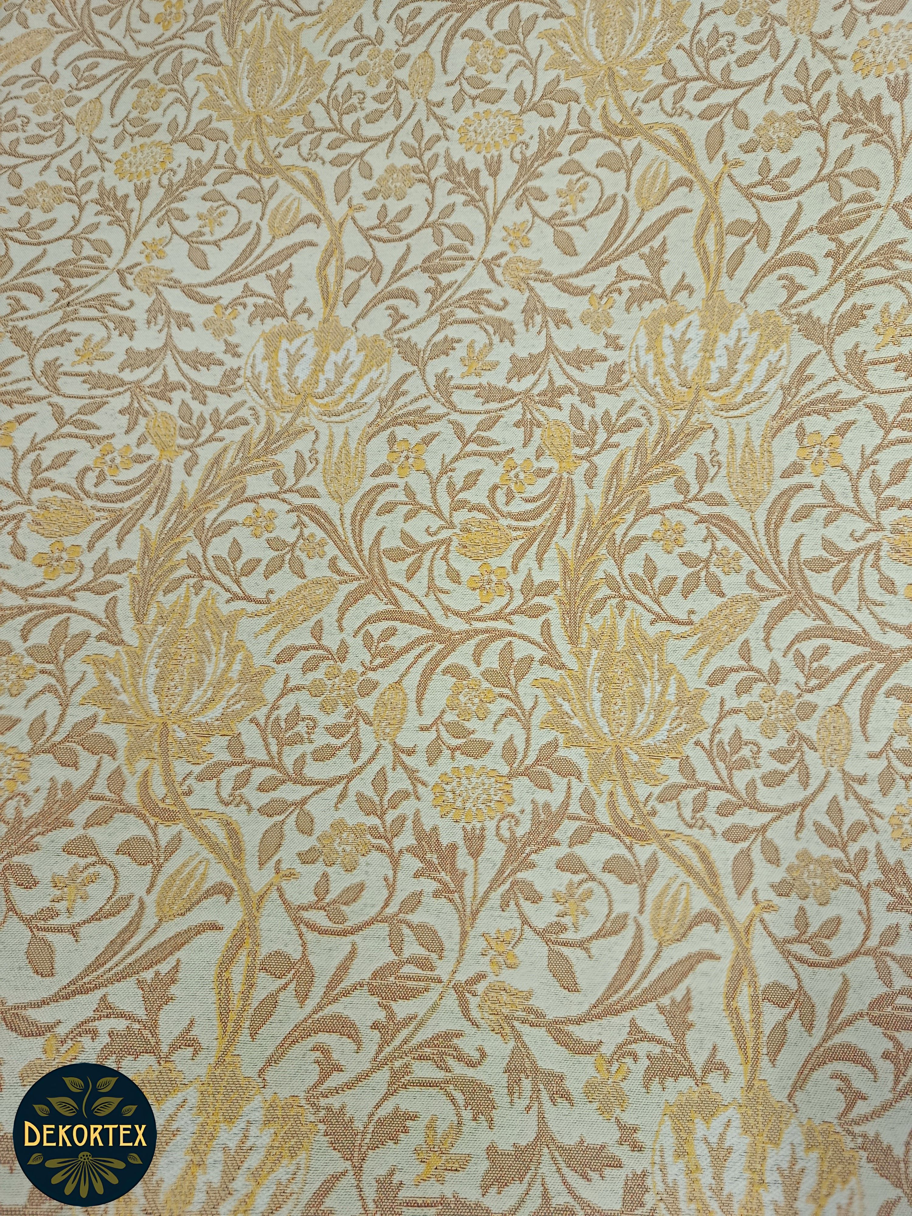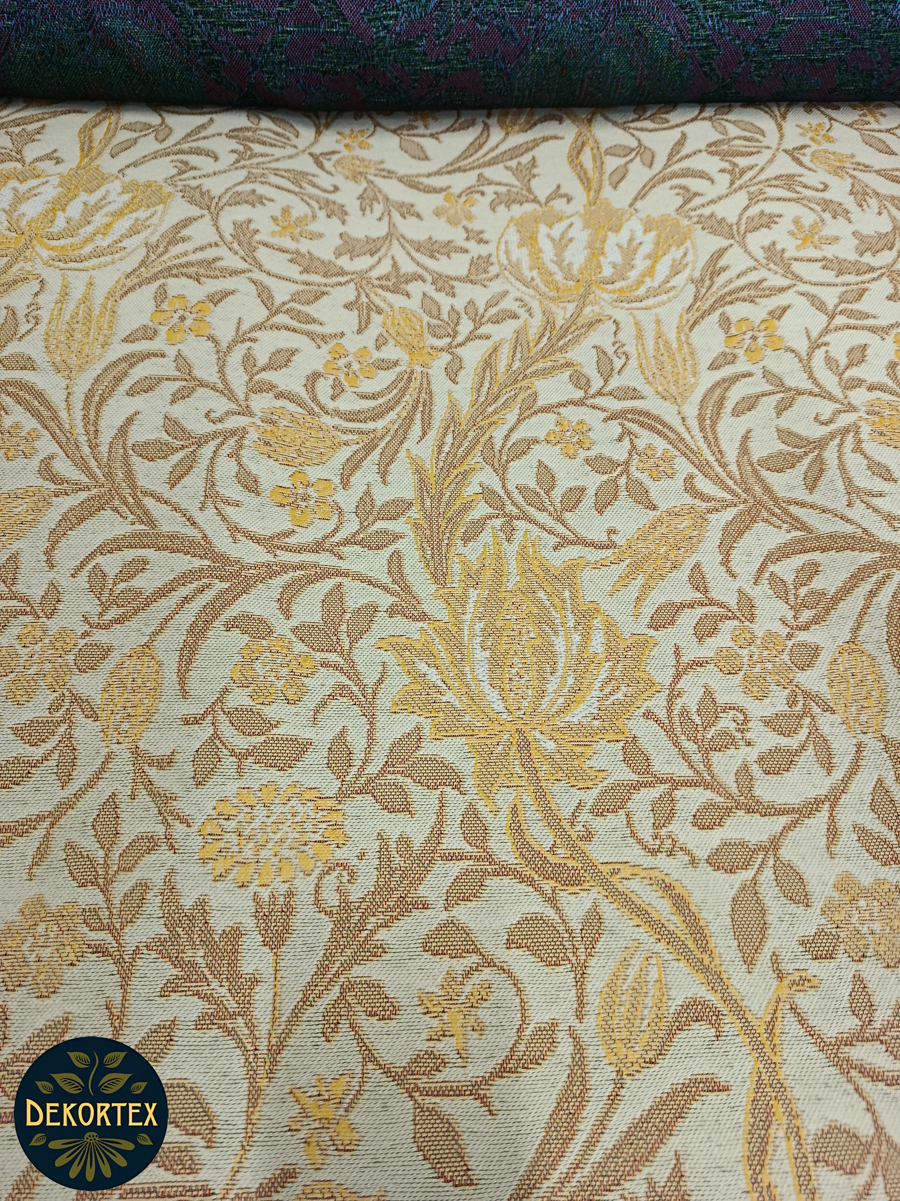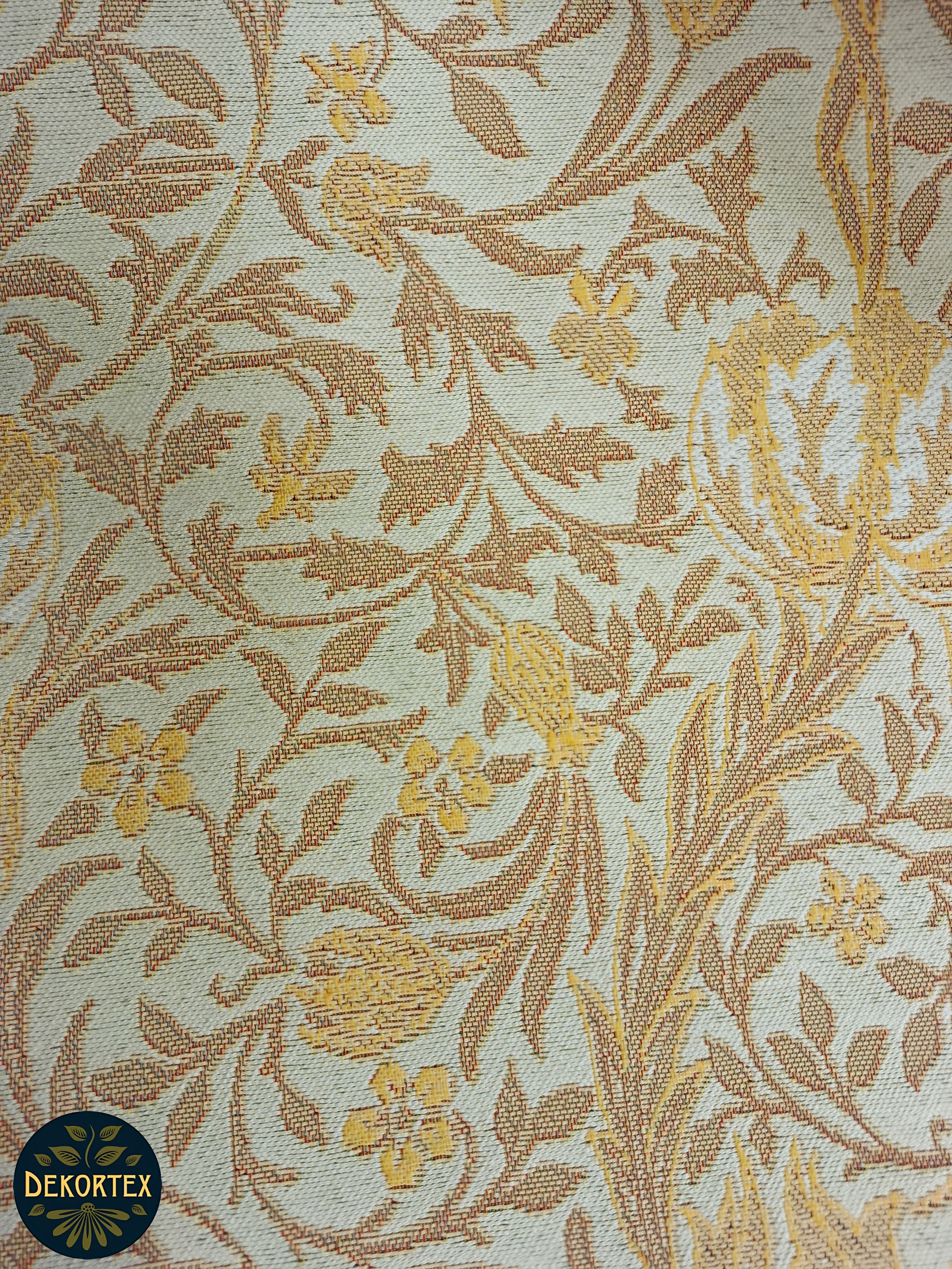 Ткань гобеленовая для обивки и перетяжки мебели "Золотая лирика" Российского производства, повышенной плотности, с высоким содержанием хлопка. Ширина 160 см. ; Плотность 380 см. ; Состав 50% хлопок. 50% п/э. Гобеленовые ткани отлично подходят для обивки мягкой мебели, стульев, используются для пошива покрывал, скатертей драпировки стен, интерьерных подушек и других предметов домашнего текстиля. Плотные и прочные гобеленовые ткани отличаются высокой износостойкостью и длительным сроком службы, хорошо стираются при температуре 30 градусов, практически не дают усадку и не линяют.