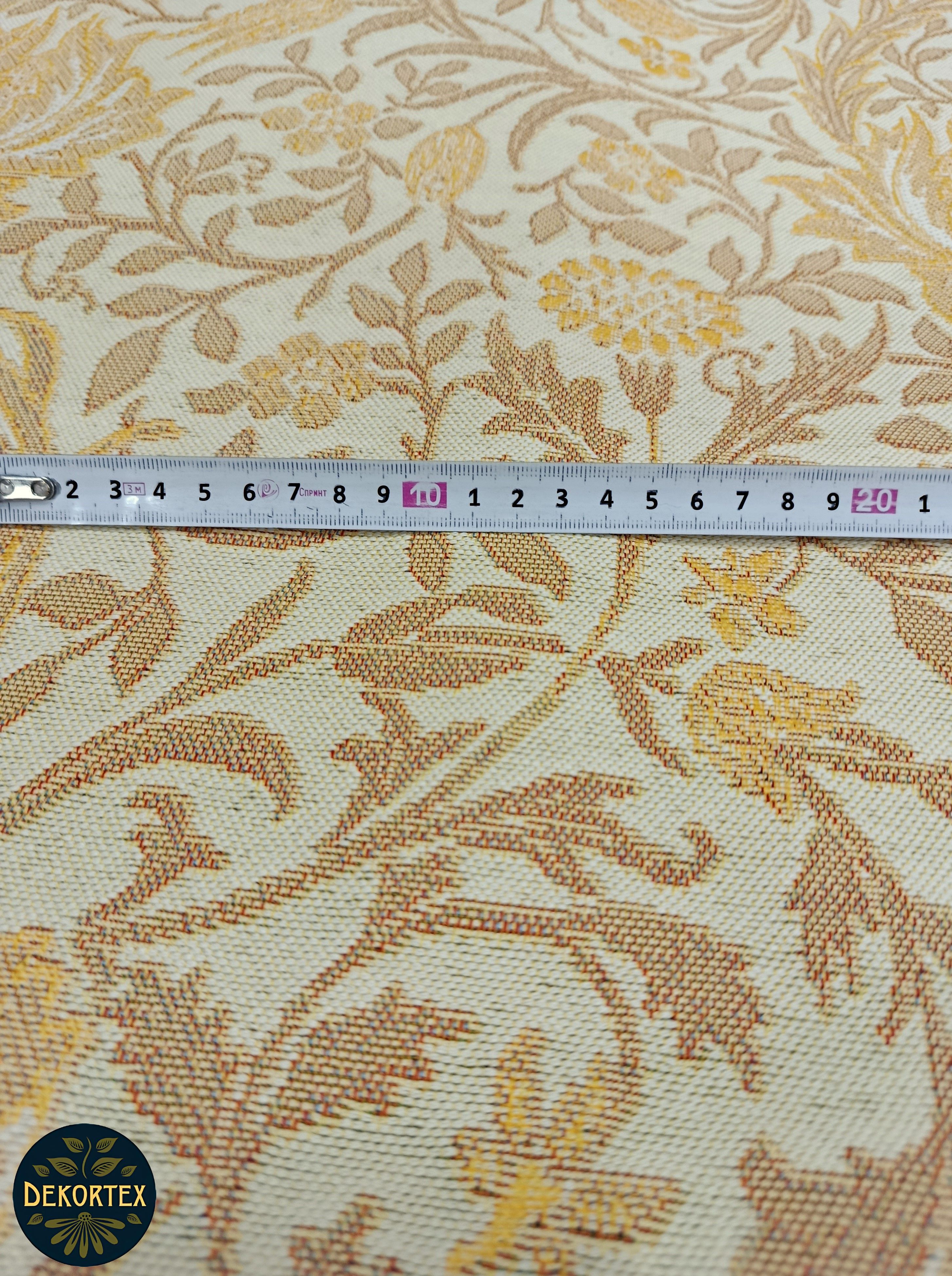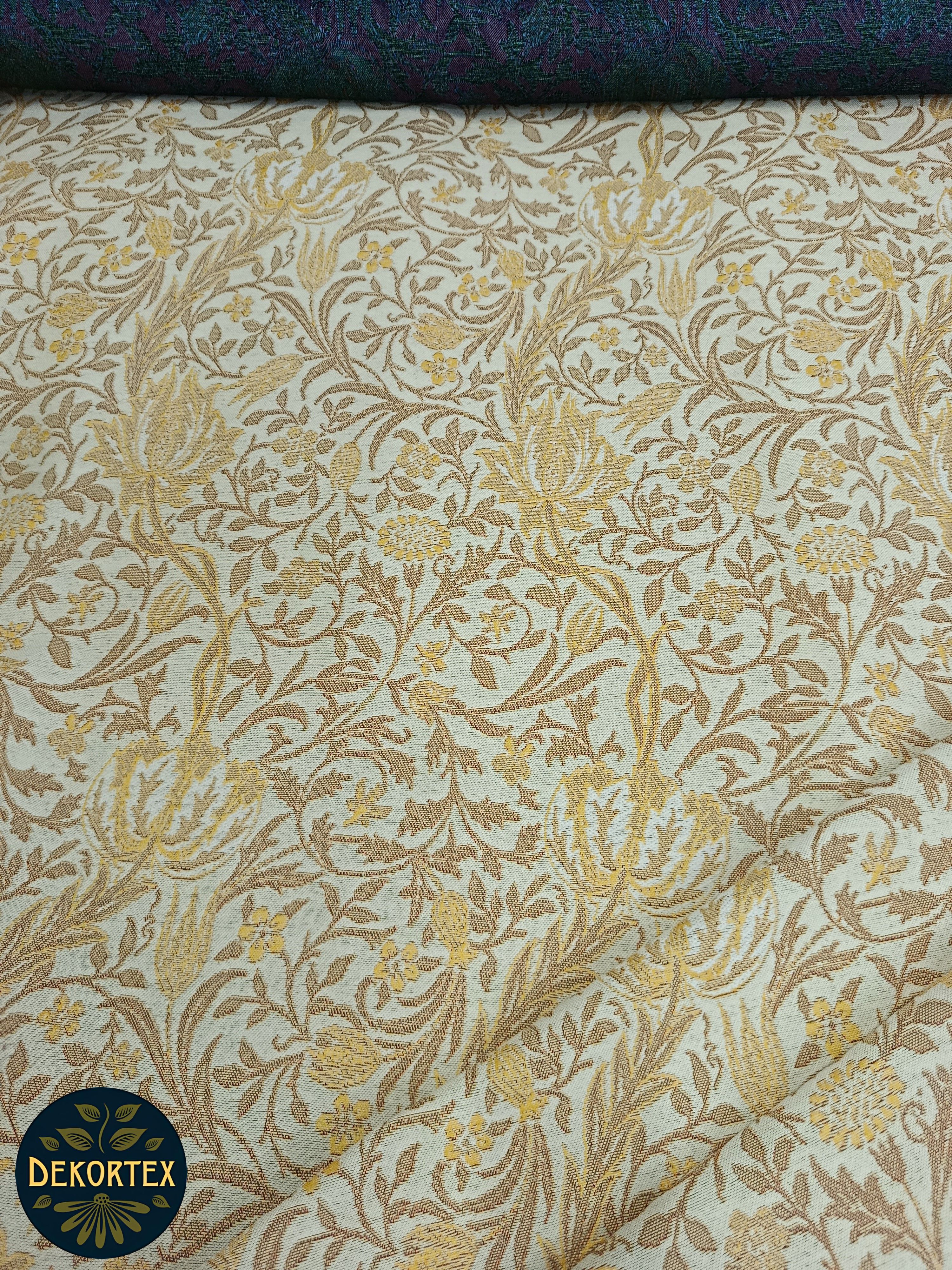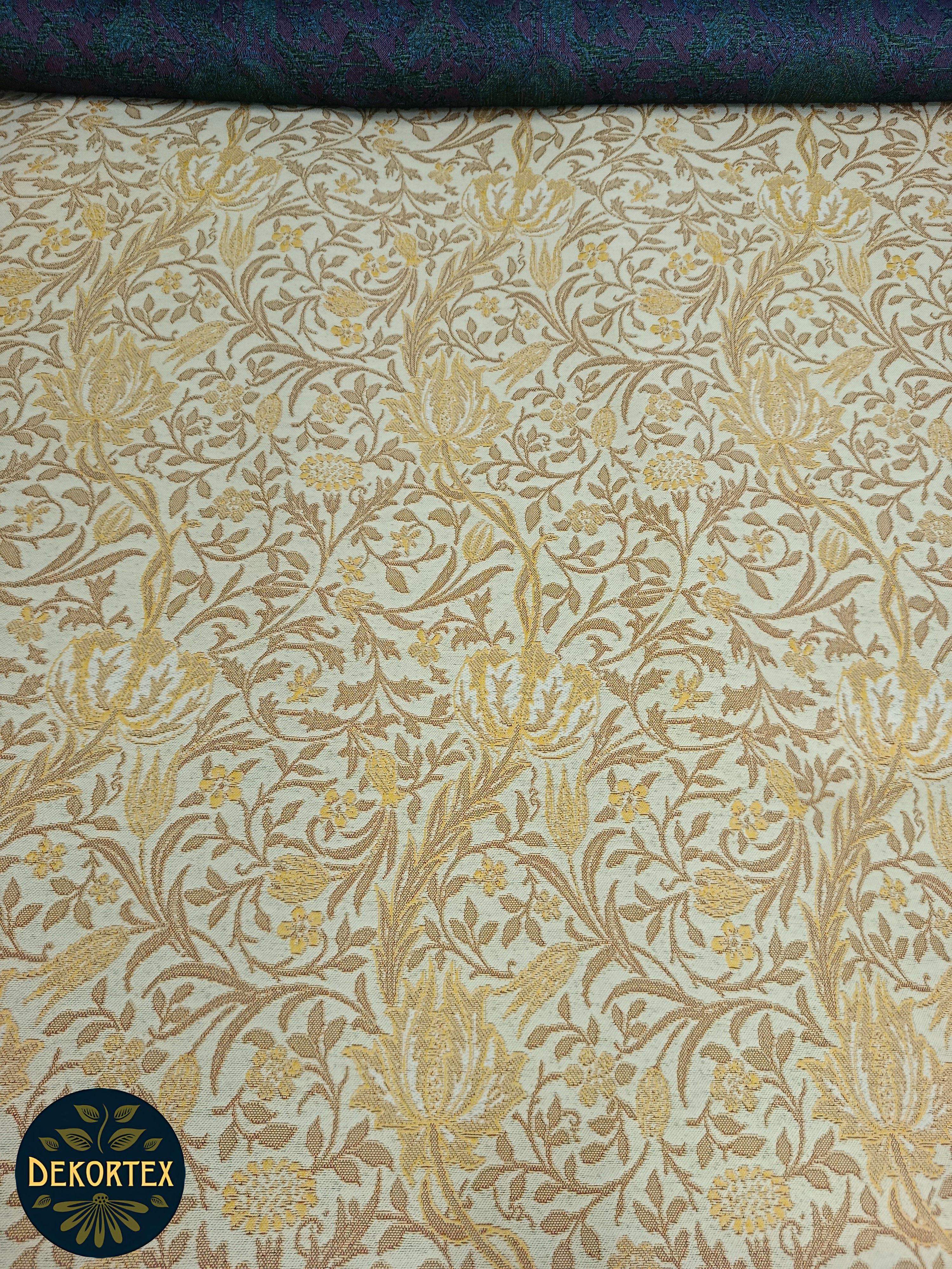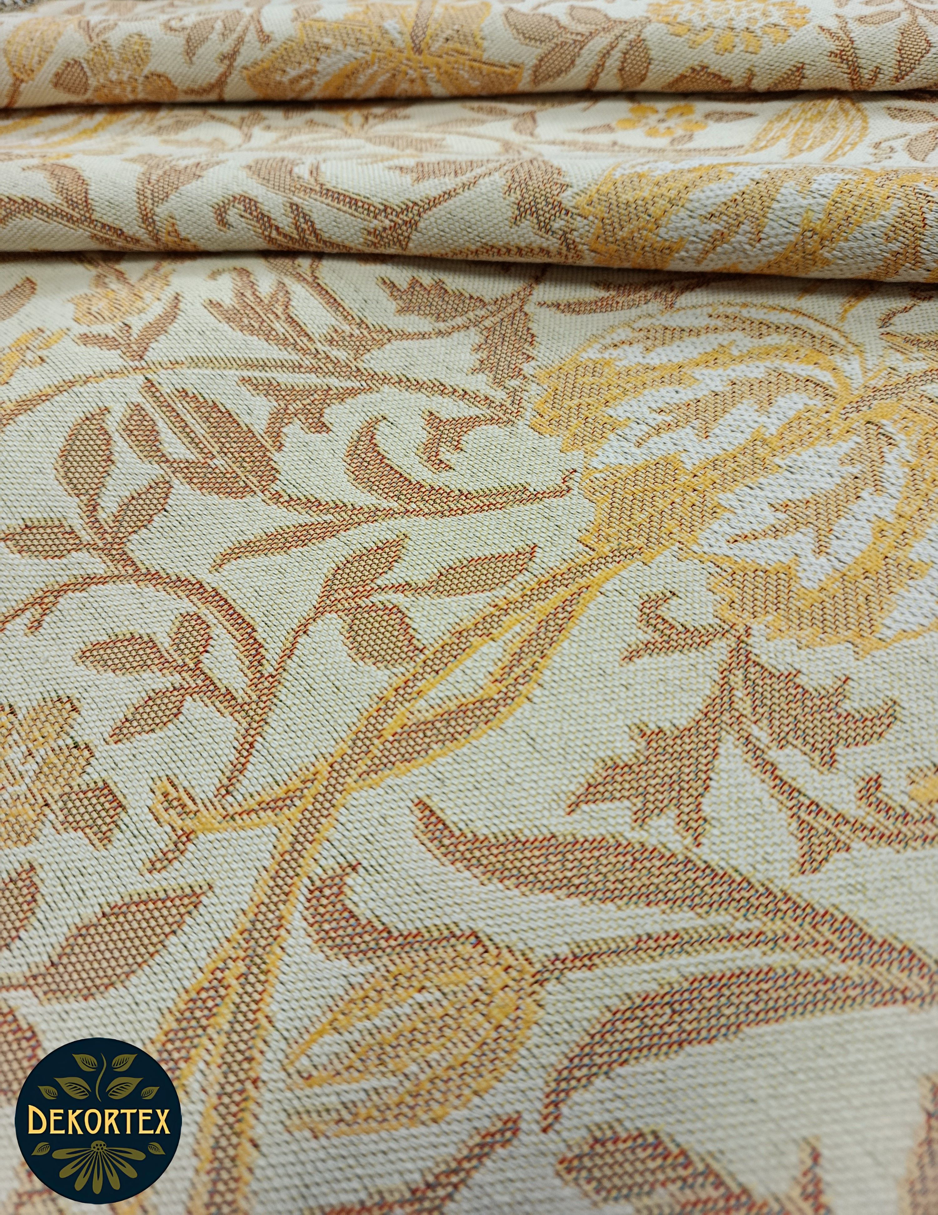 Ткань гобеленовая для обивки и перетяжки мебели "Золотая лирика" Российского производства, повышенной плотности, с высоким содержанием хлопка. Ширина 160 см. ; Плотность 380 см. ; Состав 50% хлопок. 50% п/э. Гобеленовые ткани отлично подходят для обивки мягкой мебели, стульев, используются для пошива покрывал, скатертей драпировки стен, интерьерных подушек и других предметов домашнего текстиля. Плотные и прочные гобеленовые ткани отличаются высокой износостойкостью и длительным сроком службы, хорошо стираются при температуре 30 градусов, практически не дают усадку и не линяют.